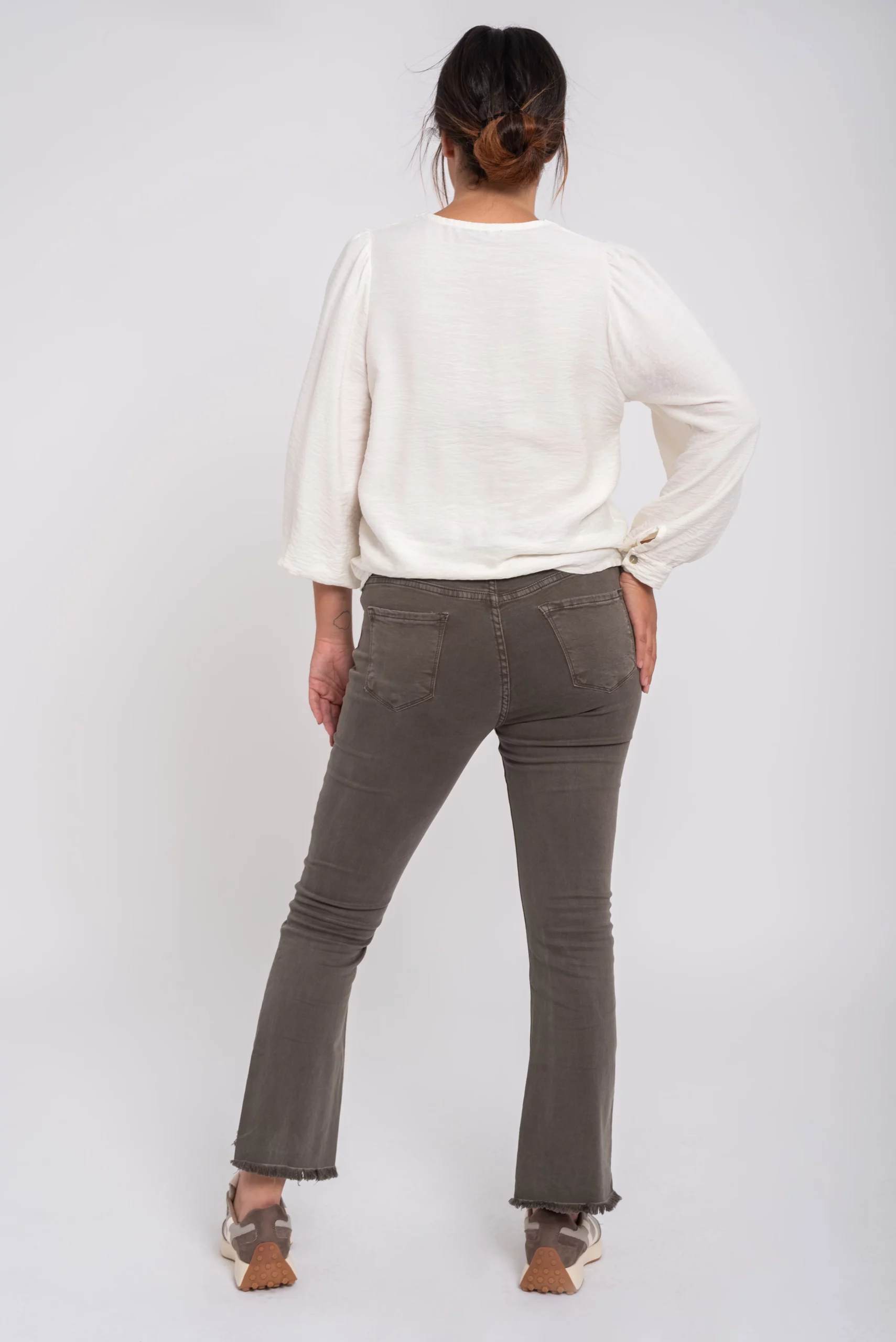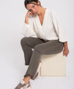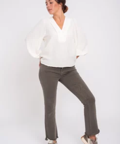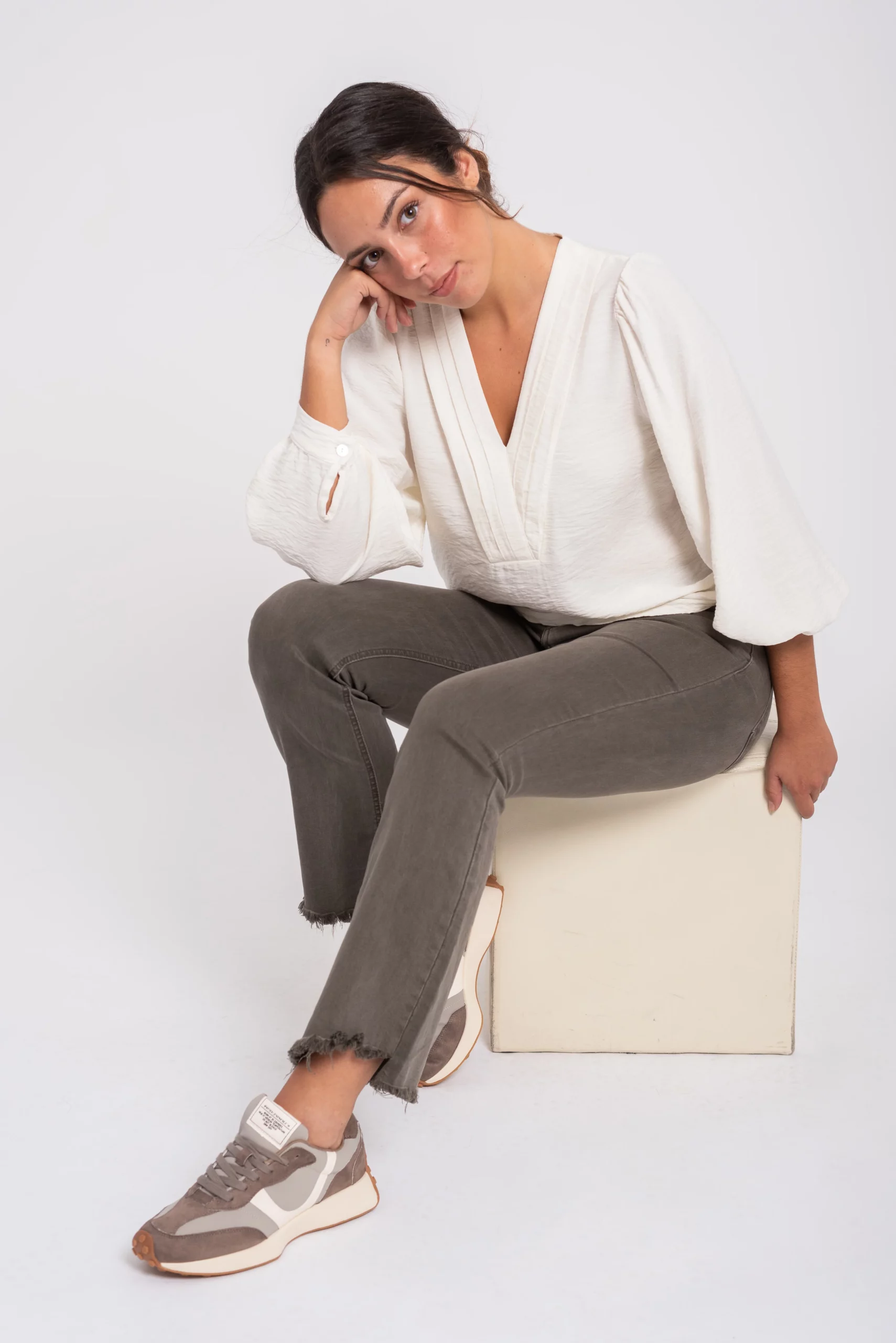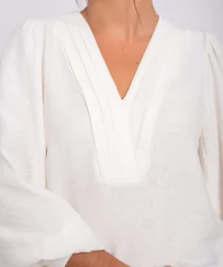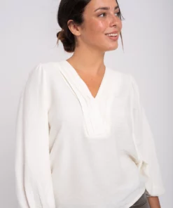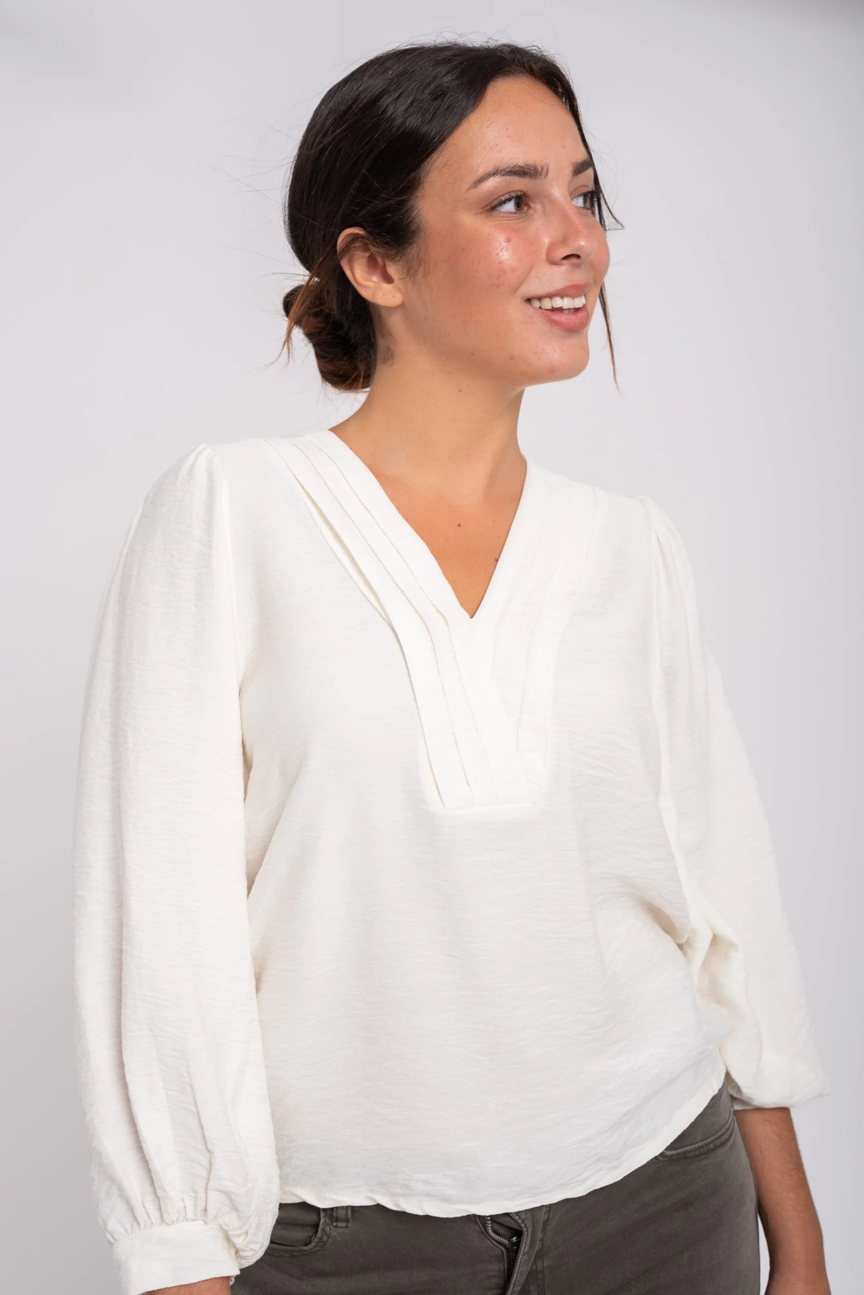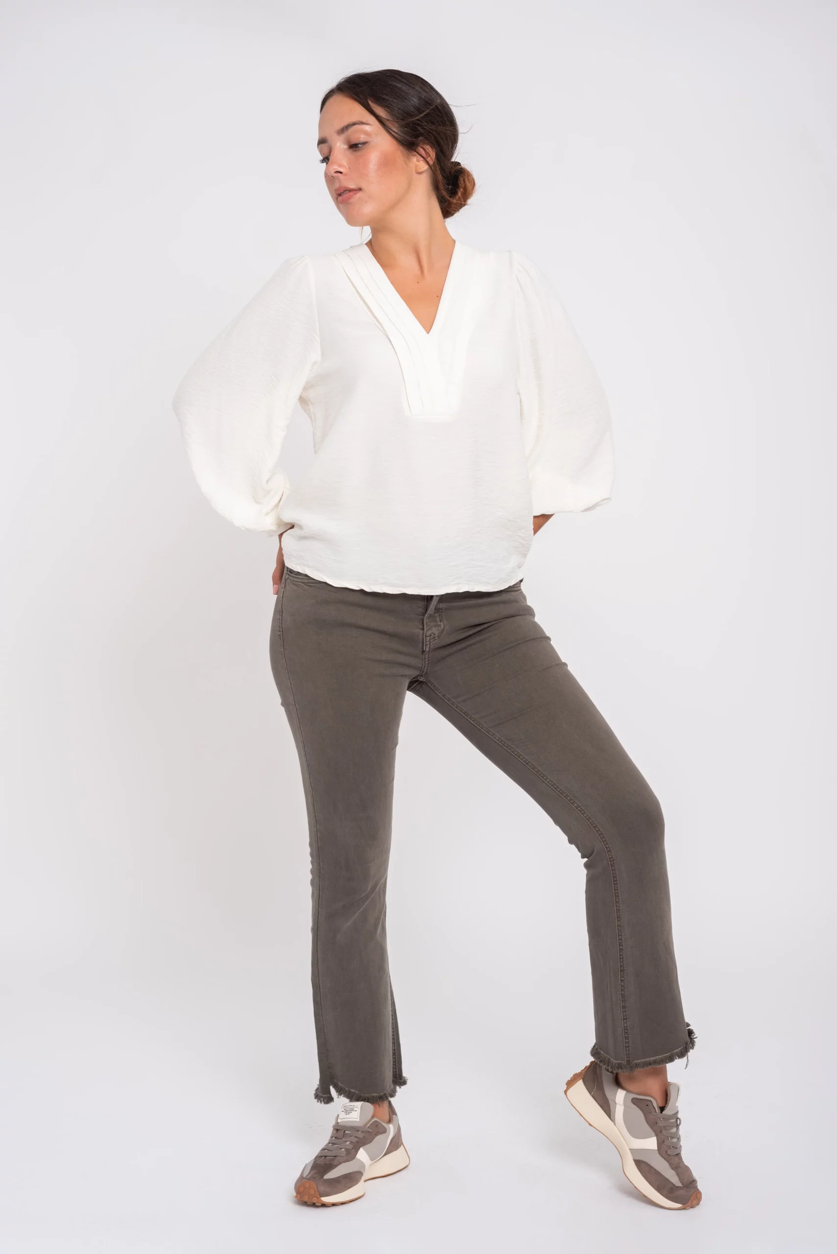 Blusa de tejido fluido. Escote en pico con detalle de jaretas en ambos lados. Manga abullonada con goma en puño. Corte amplio. Un básico ideal para combinar en tus looks de temporada.