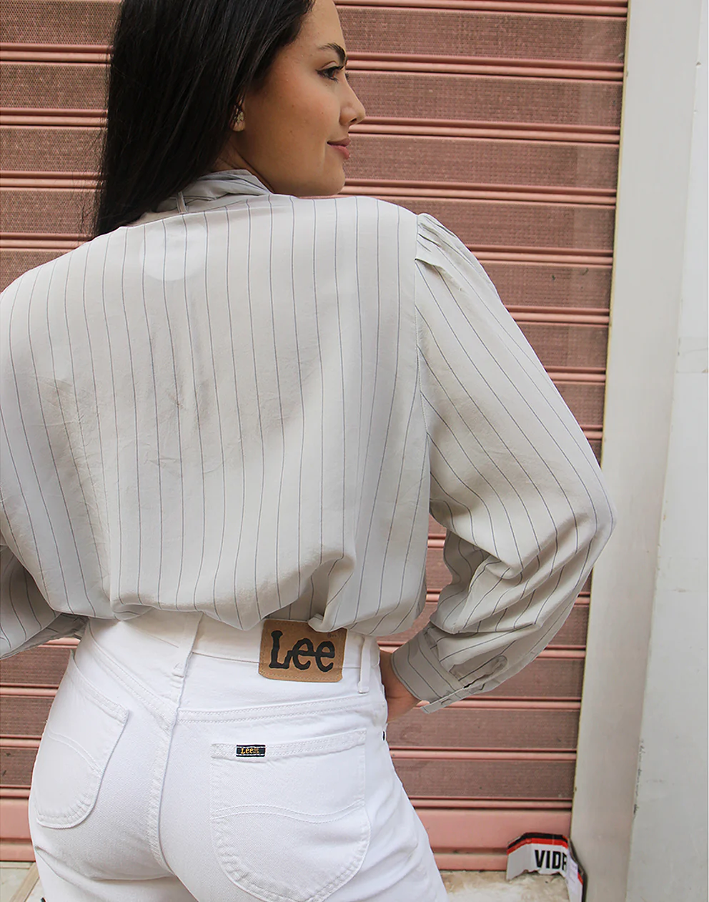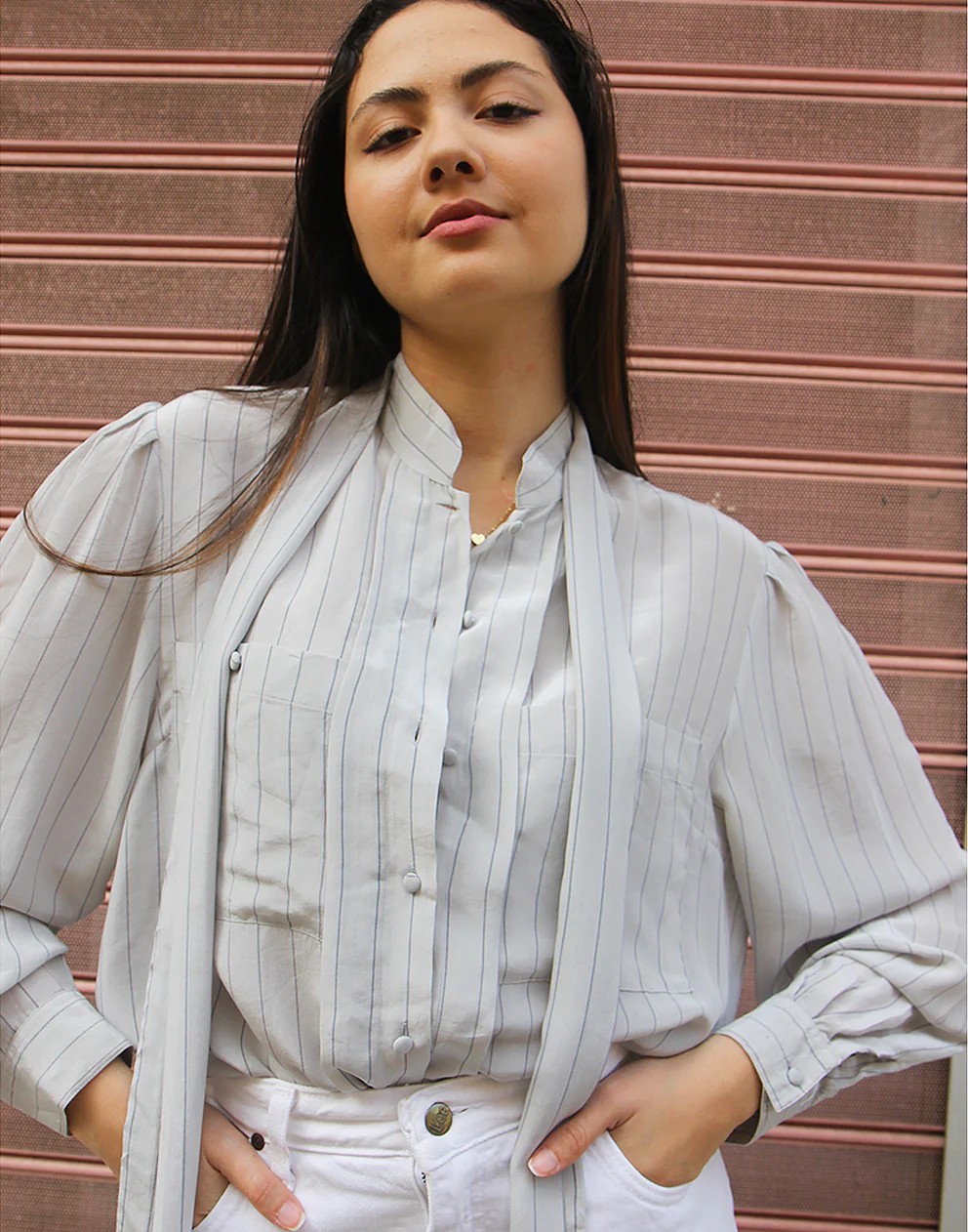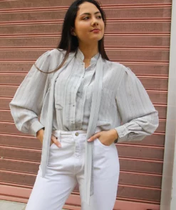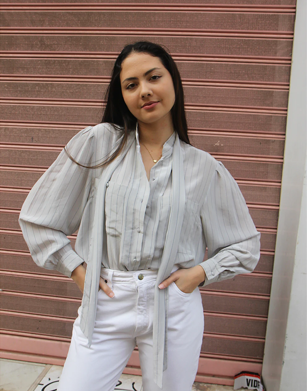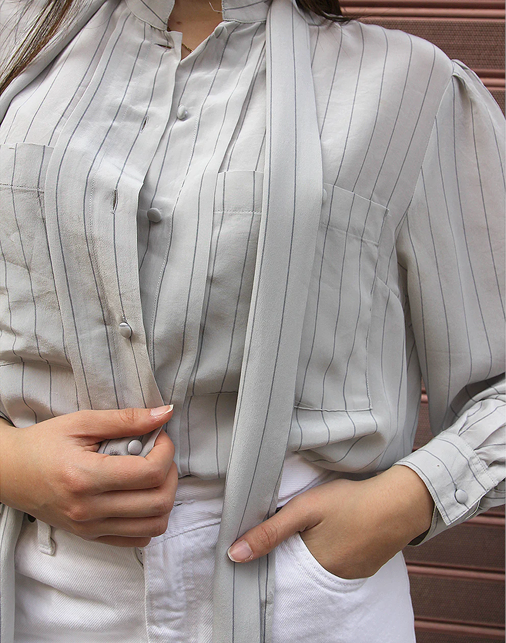 Vintage blouse in a pale grey colour with fine vertical pinstripe.