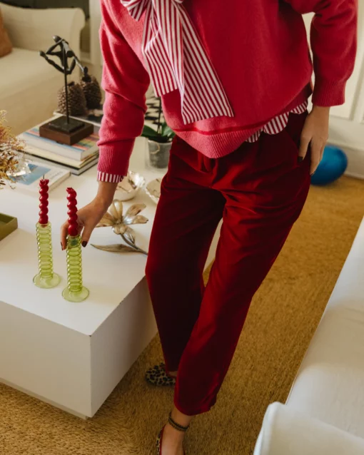 Nos divierte muchísimo en velvet cereza, como básico para combinar con blusas escocesas y de flores, o en total look con blazer de mismo color para un efecto wow.