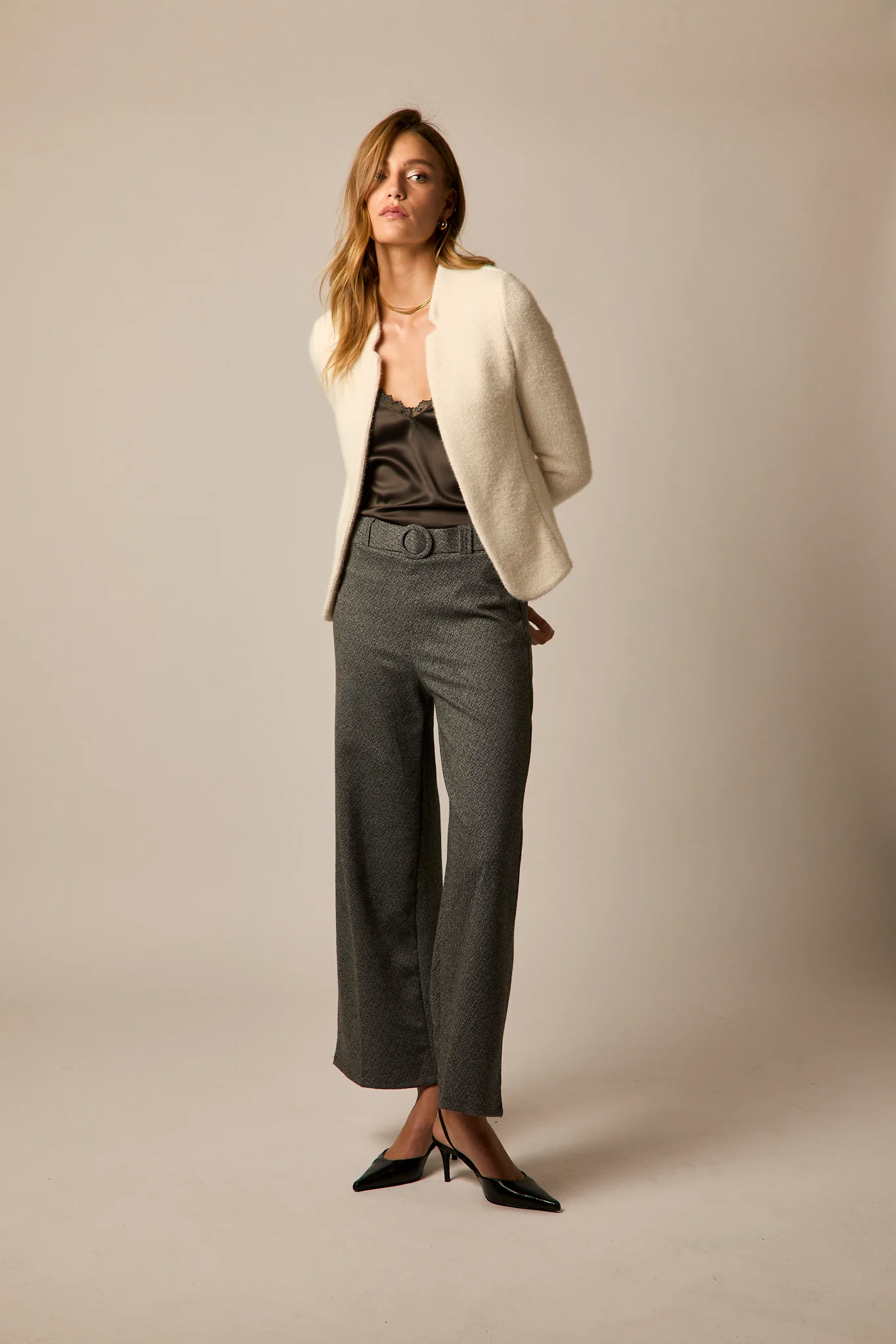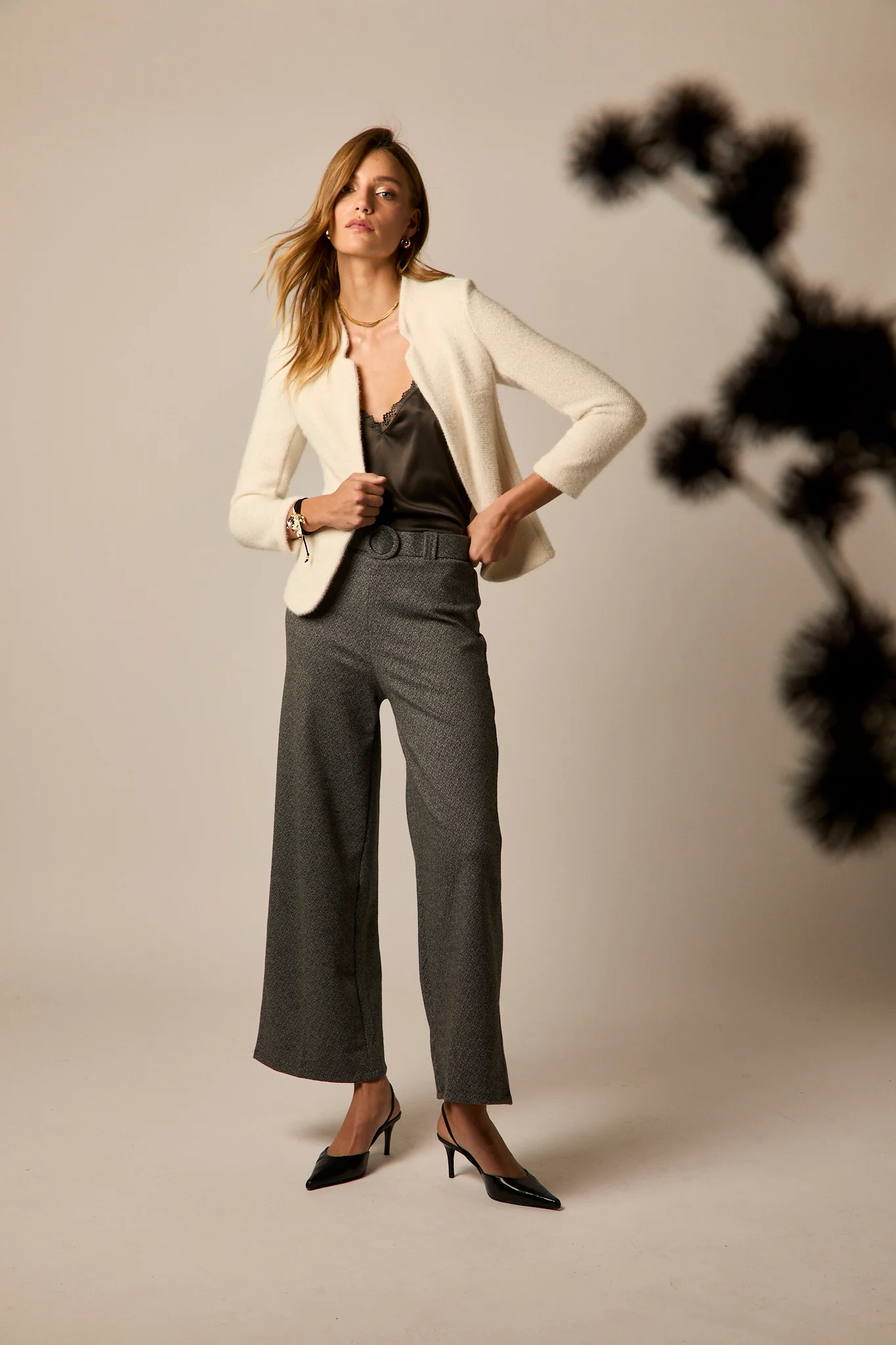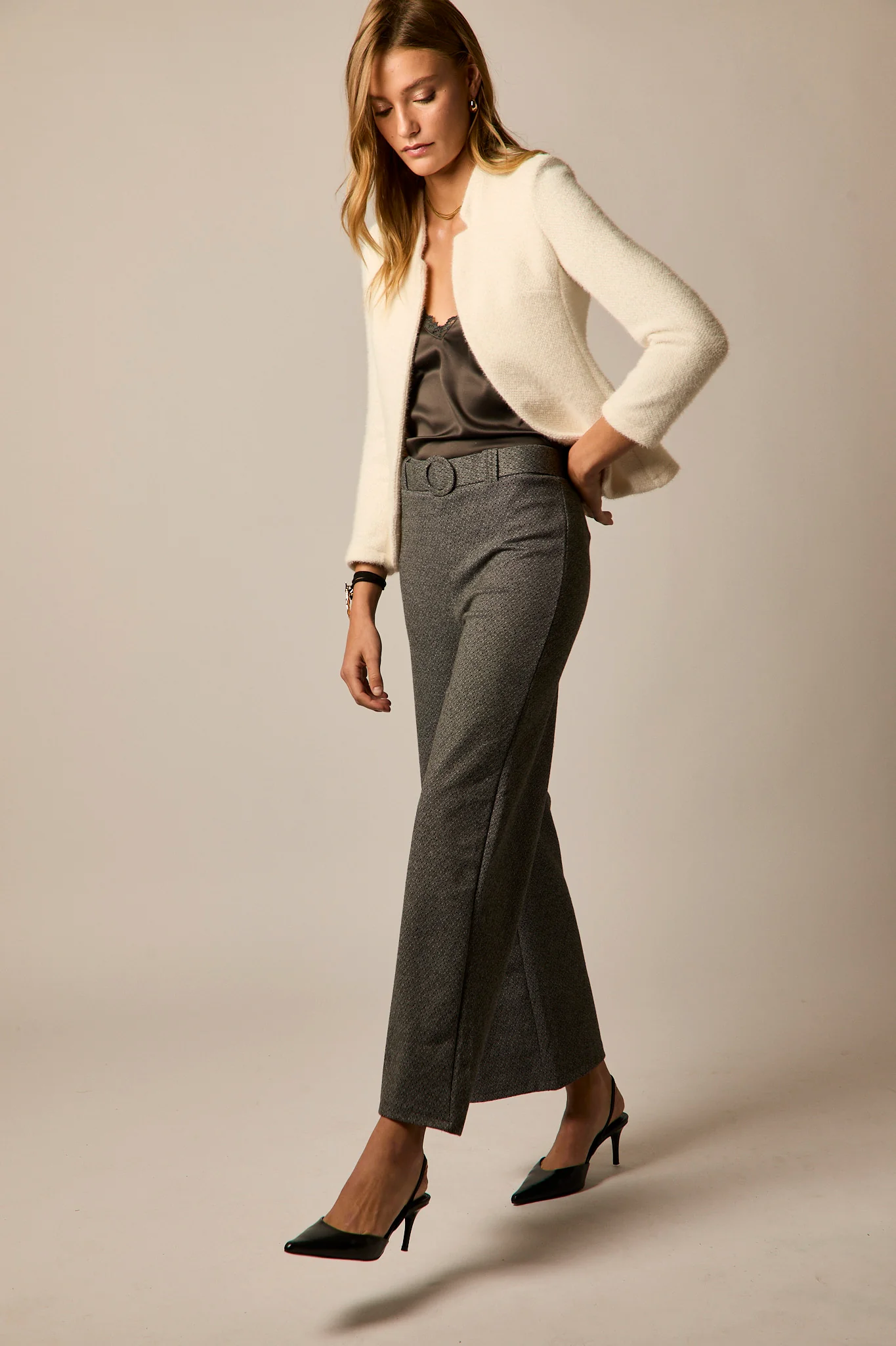 Pantalón jaspeado recto en color gris. Tiro alto, diseño recto y acampanado en el bajo y cinturón en el mismo color.