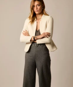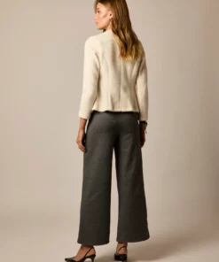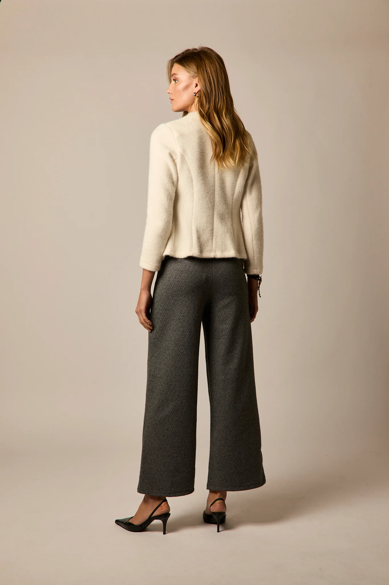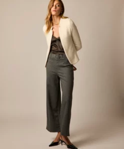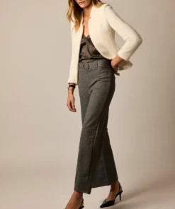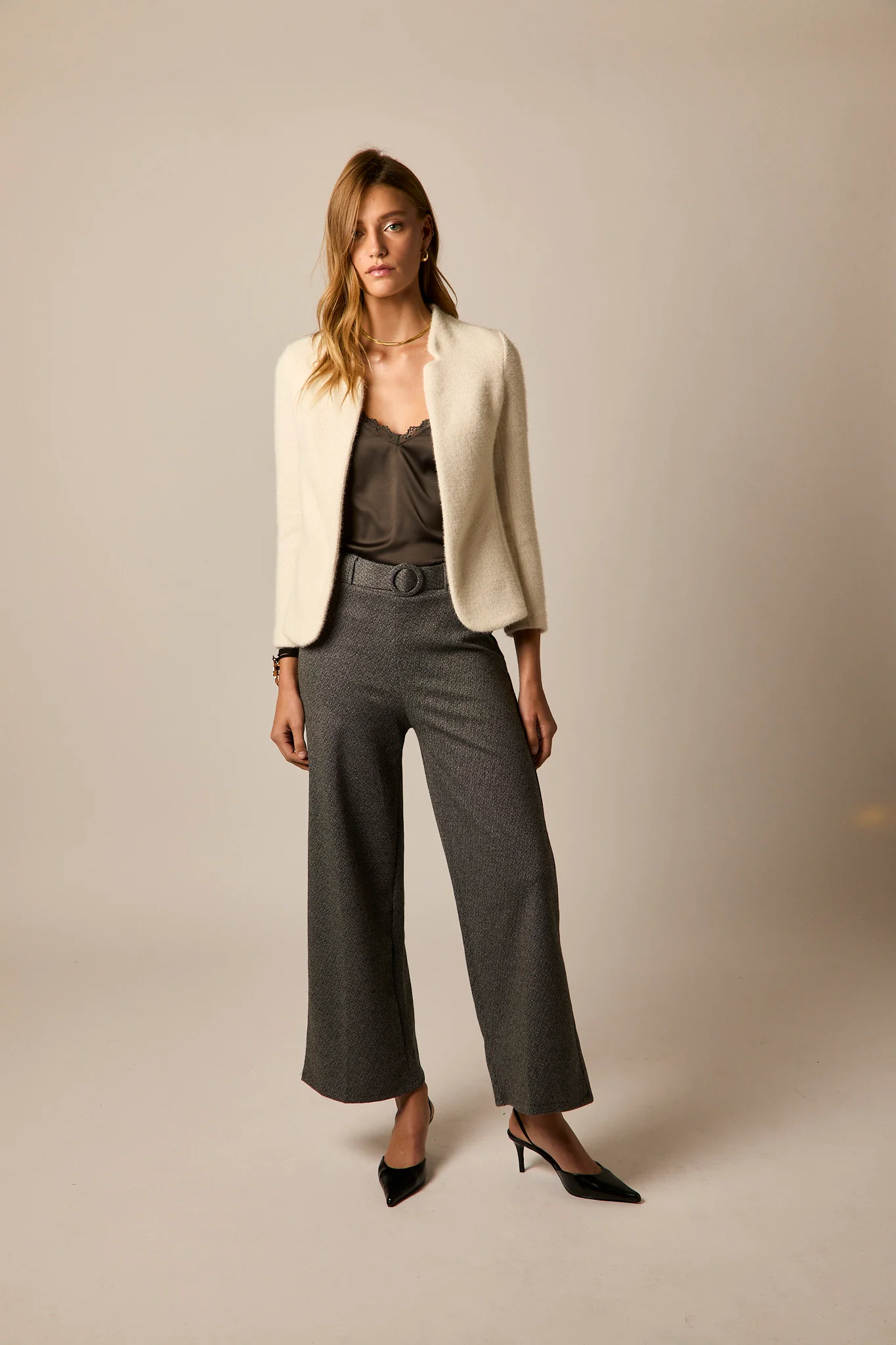 Pantalón jaspeado recto en color gris. Tiro alto, diseño recto y acampanado en el bajo y cinturón en el mismo color.