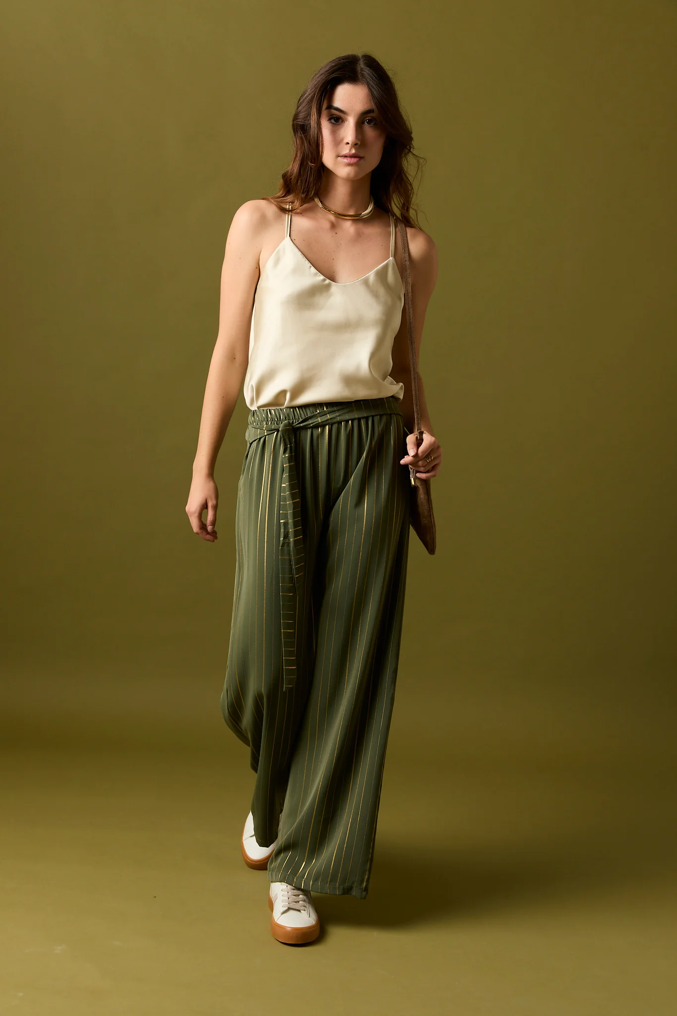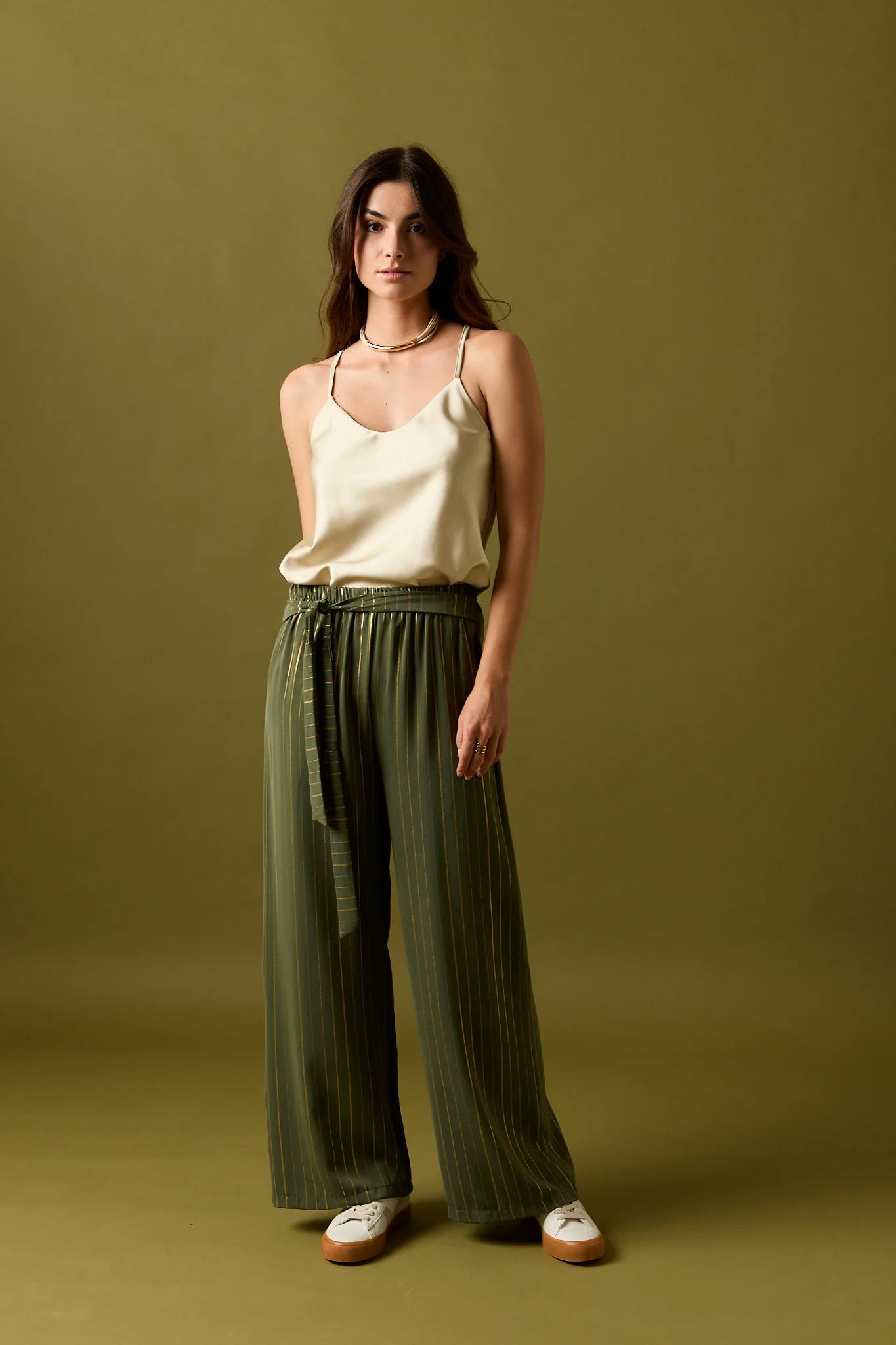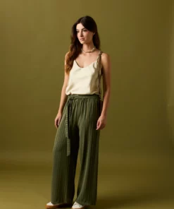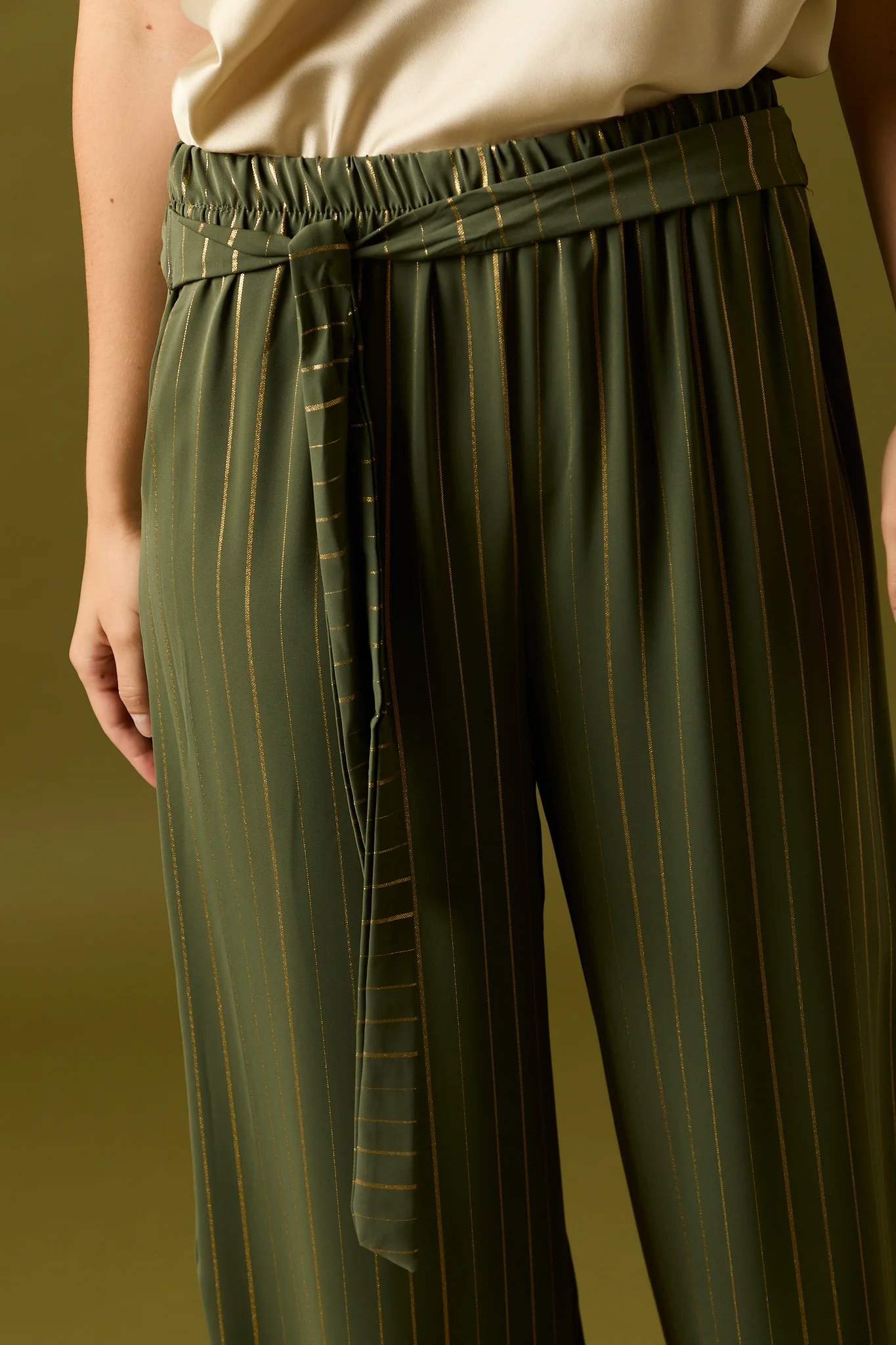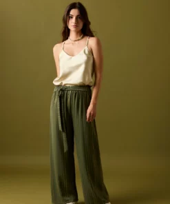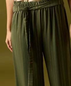 Pantalón largo de fluido en color kaki con detalle de rayas en hilo metalizado dorado. Diseño recto, tiro alto, cintura elástica y cierre de lazo.
