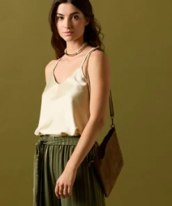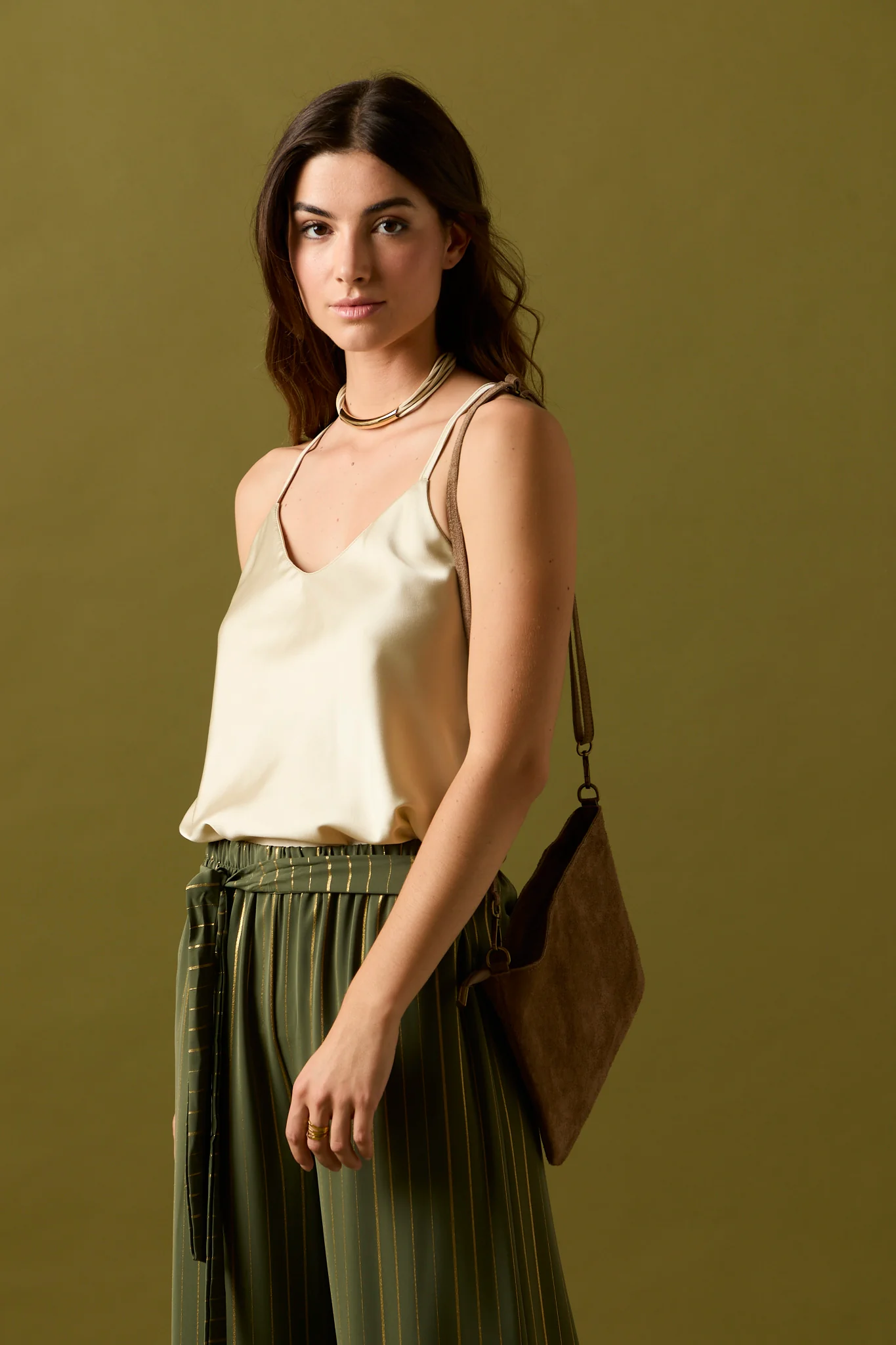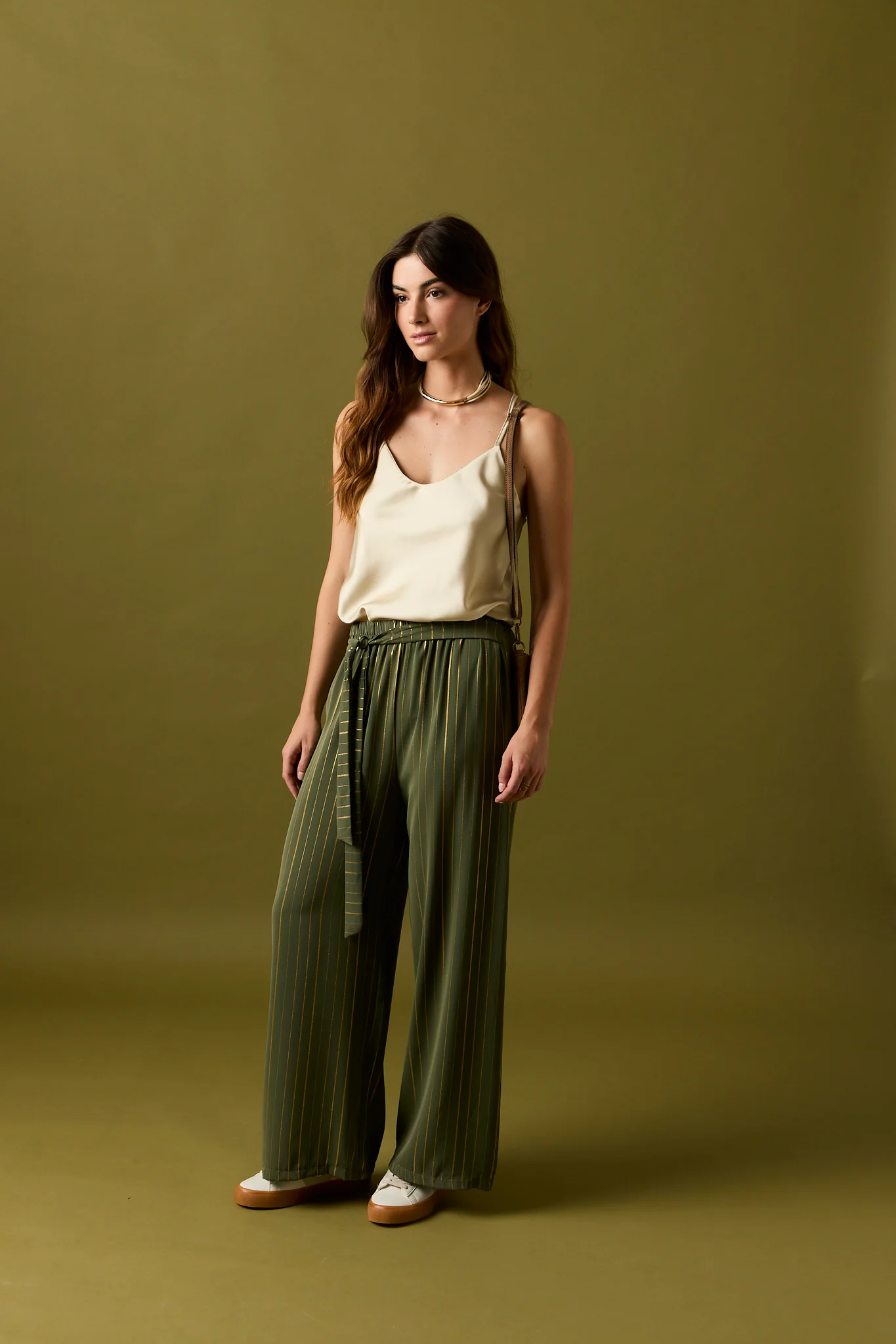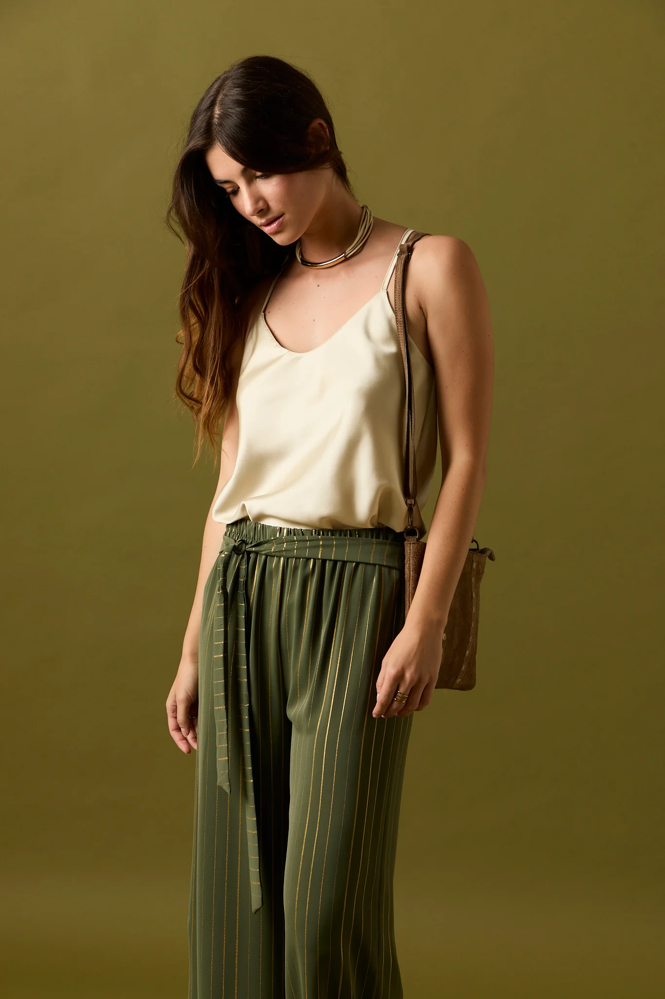 Pantalón largo de fluido en color kaki con detalle de rayas en hilo metalizado dorado. Diseño recto, tiro alto, cintura elástica y cierre de lazo.