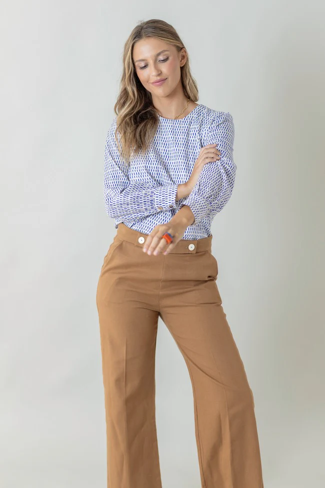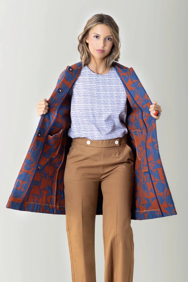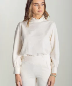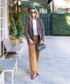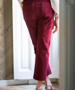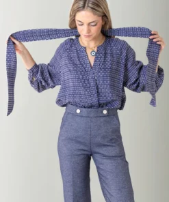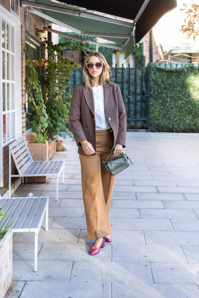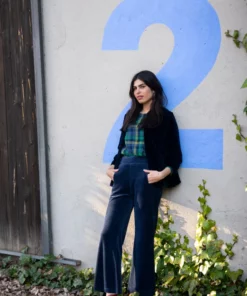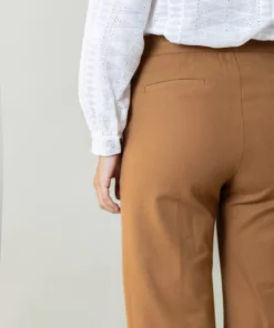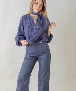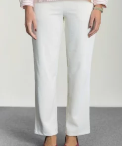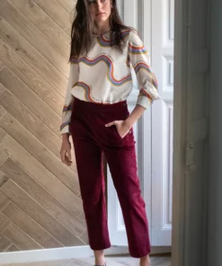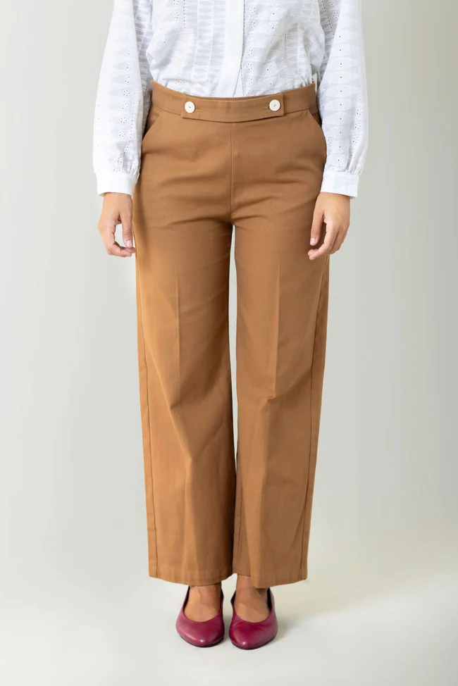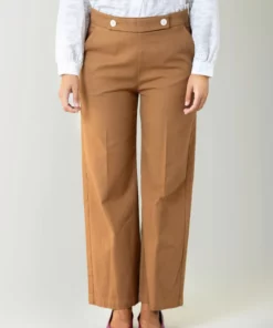 – Pantalón de corte recto y tiro medio/alto.