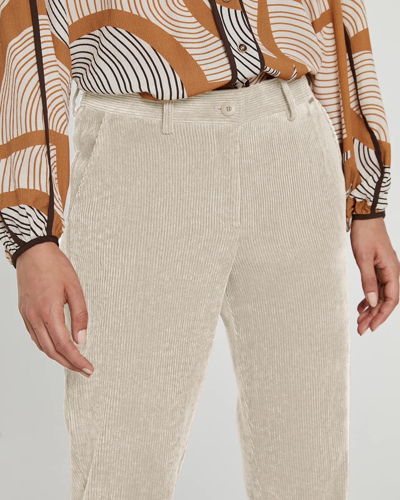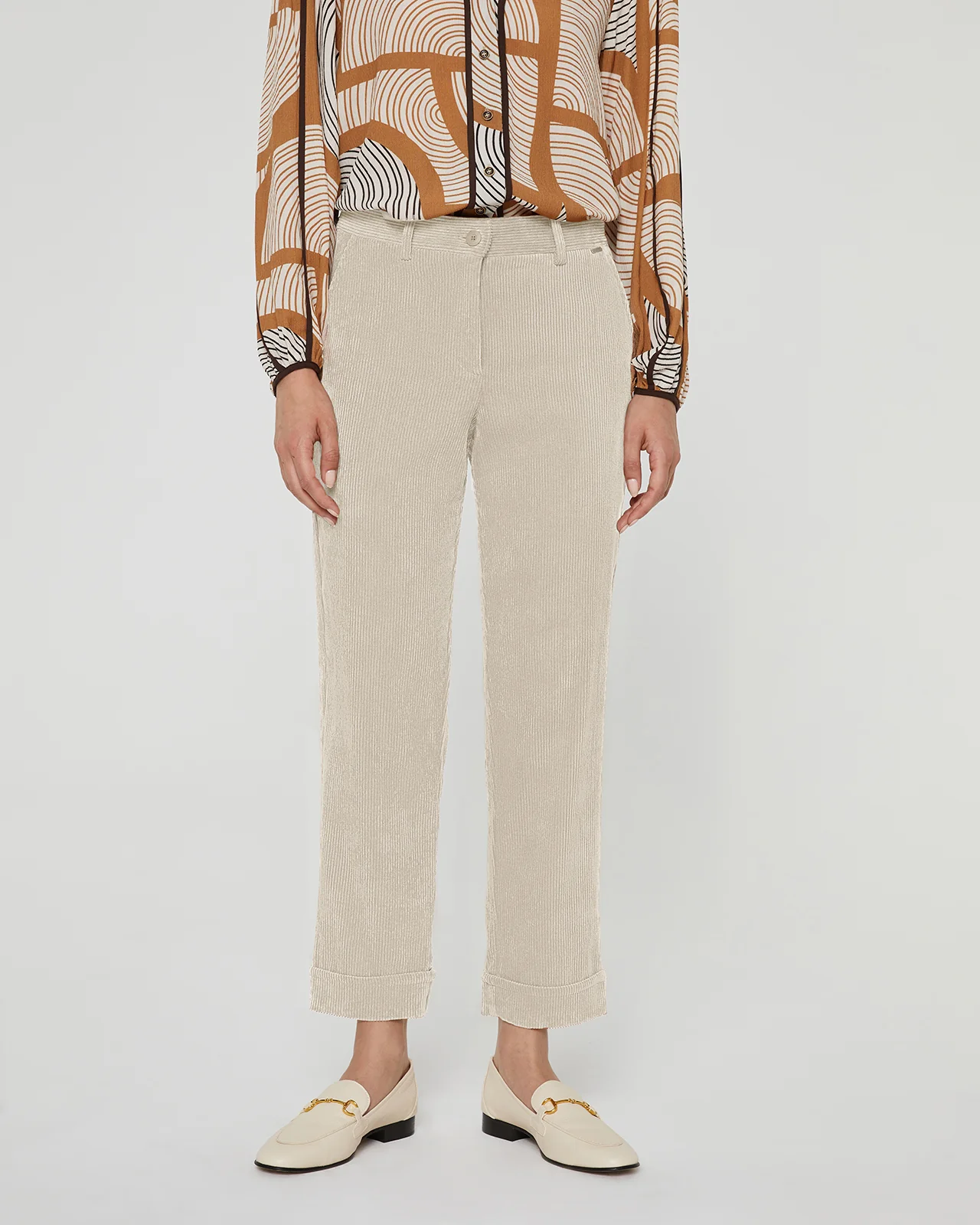 Pantalón de pana , corte recto . Tobillero con vuelta en el bajo. Bolsillos tipo francés en los lados. Lleva goma en la parte de atrás de la cintura para darle mayor comodidad. Cierre con botón y cremallera. Combínalo con la Blazer del mismo tejido para obtener un look moderno y casual