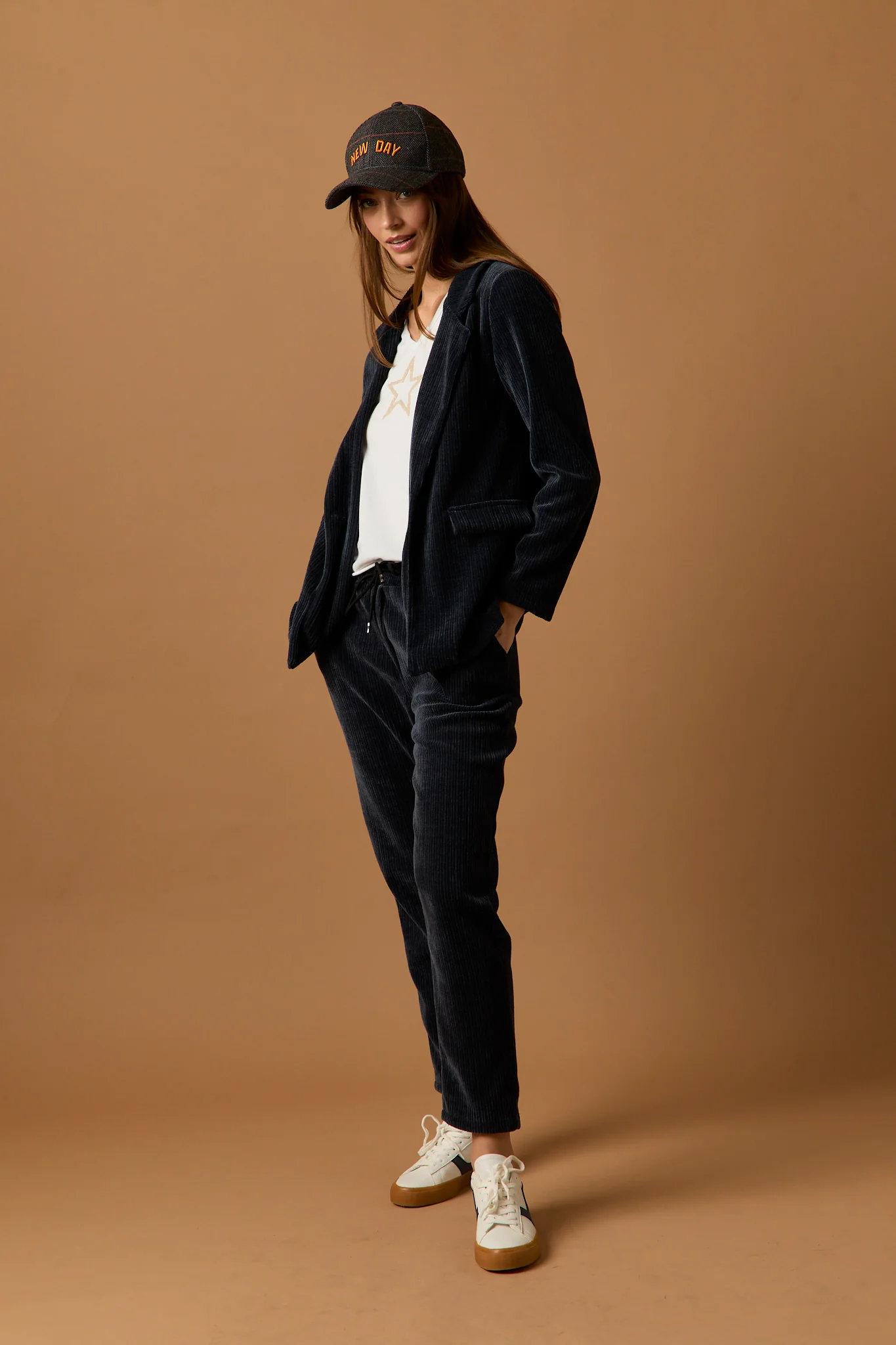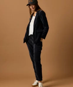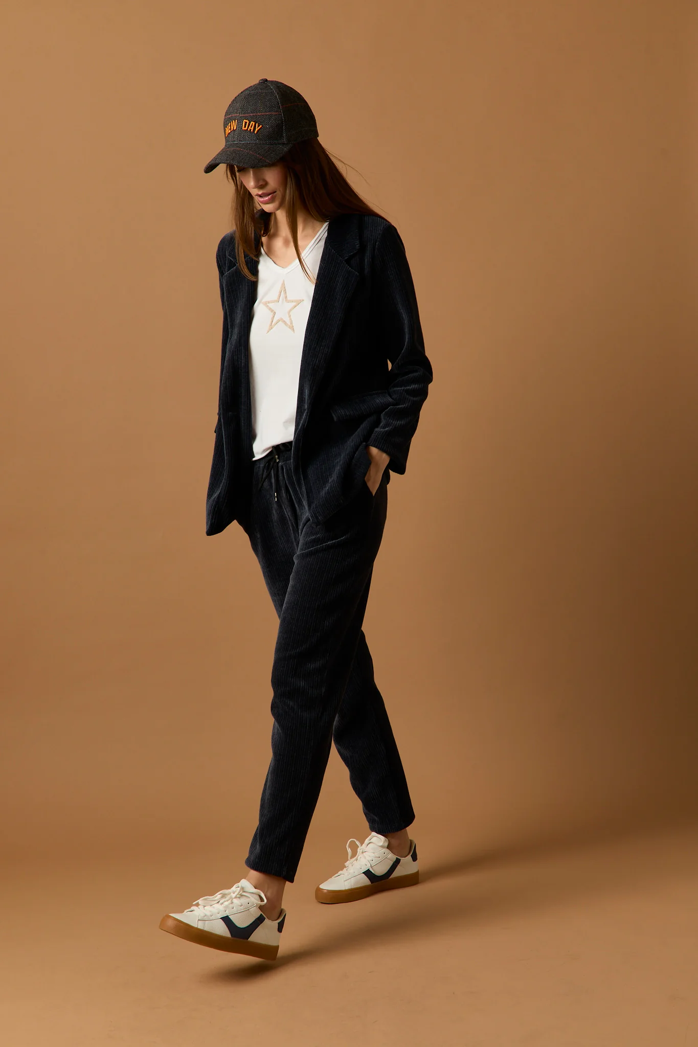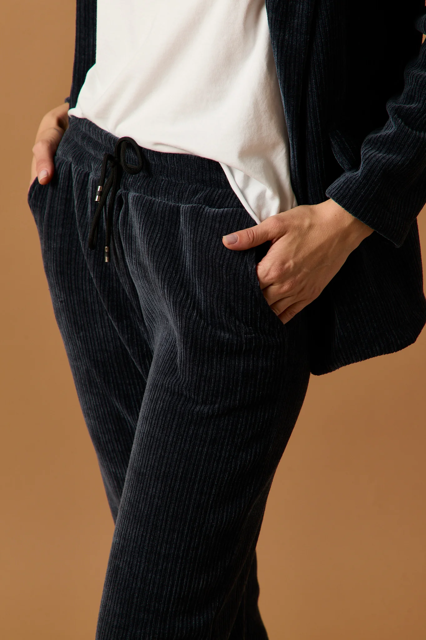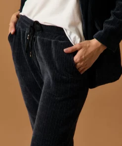 Pantalón de pana en color azul marino. Tiro medio, cintura elástica con cordón y diseño recto.