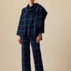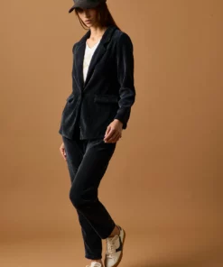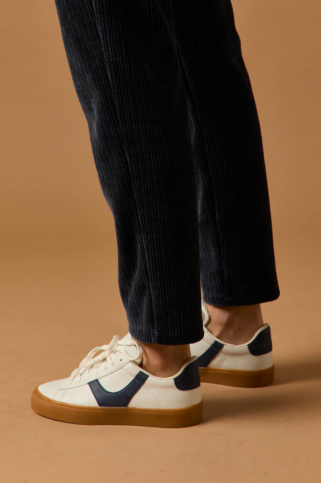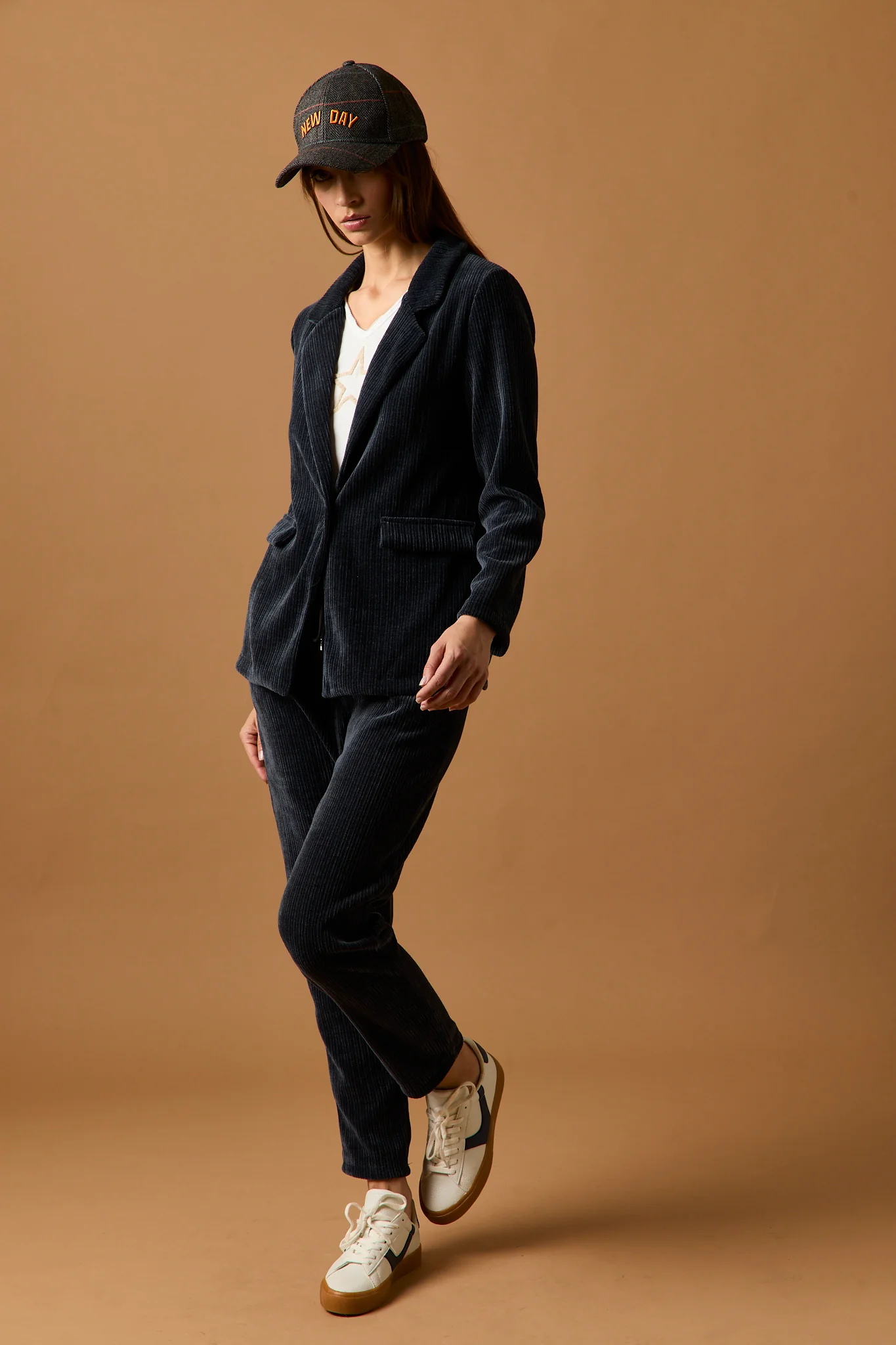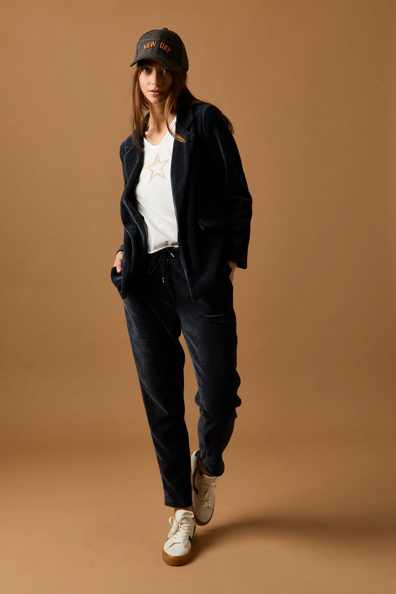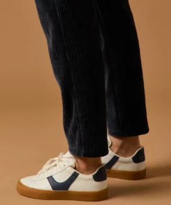 Pantalón de pana en color azul marino. Tiro medio, cintura elástica con cordón y diseño recto.
