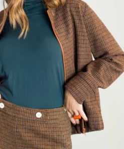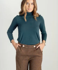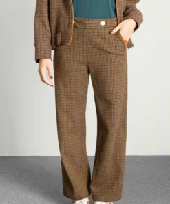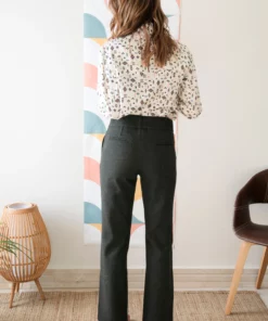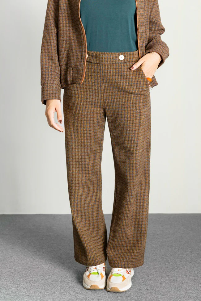 – Pantalón de corte recto y tiro medio/alto.