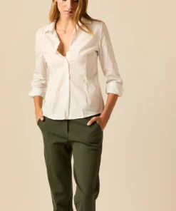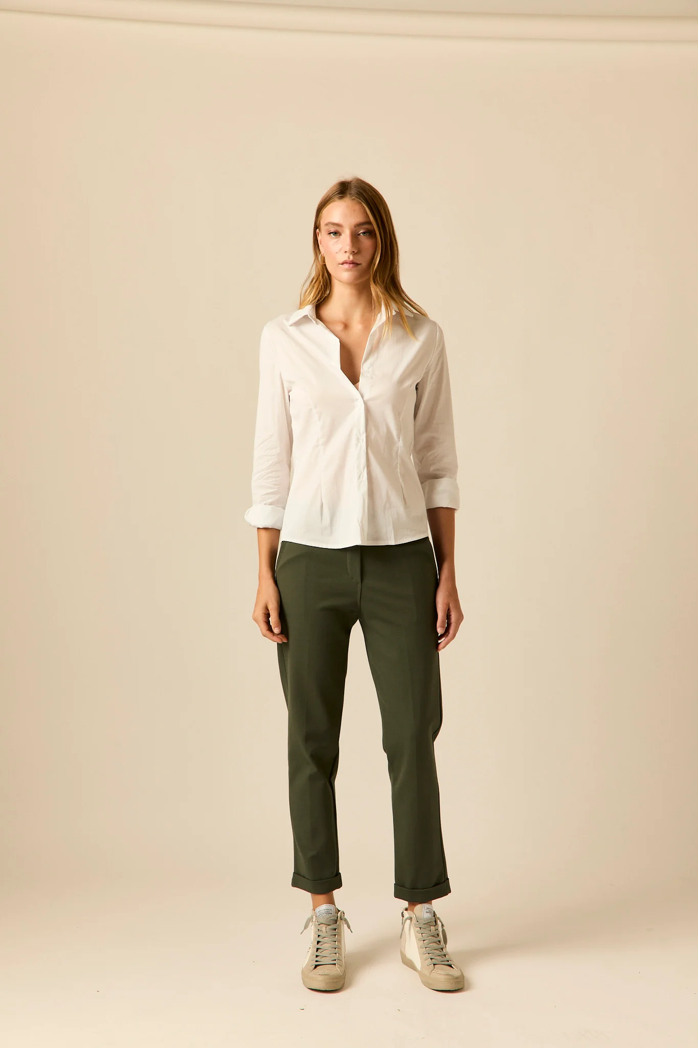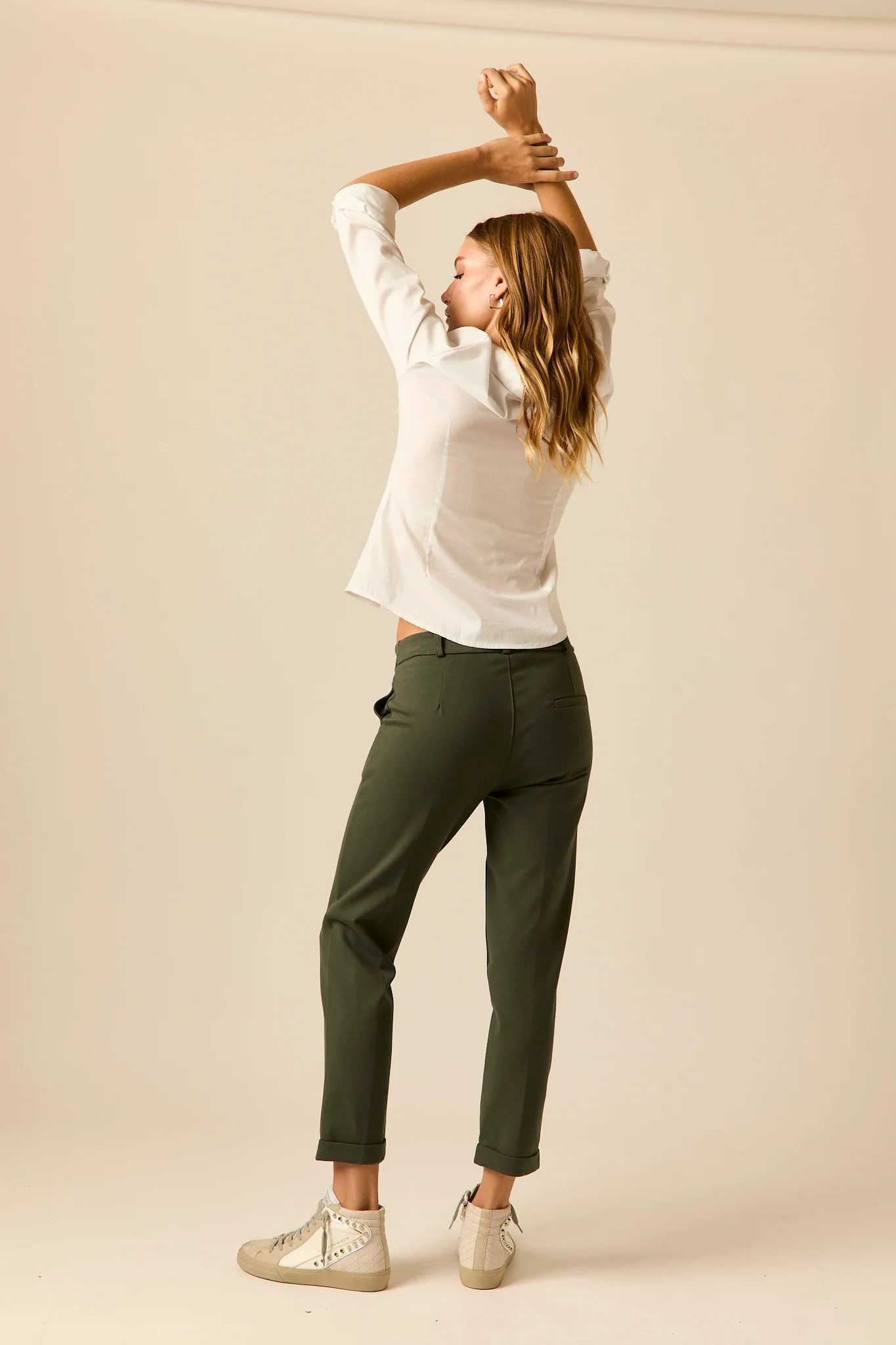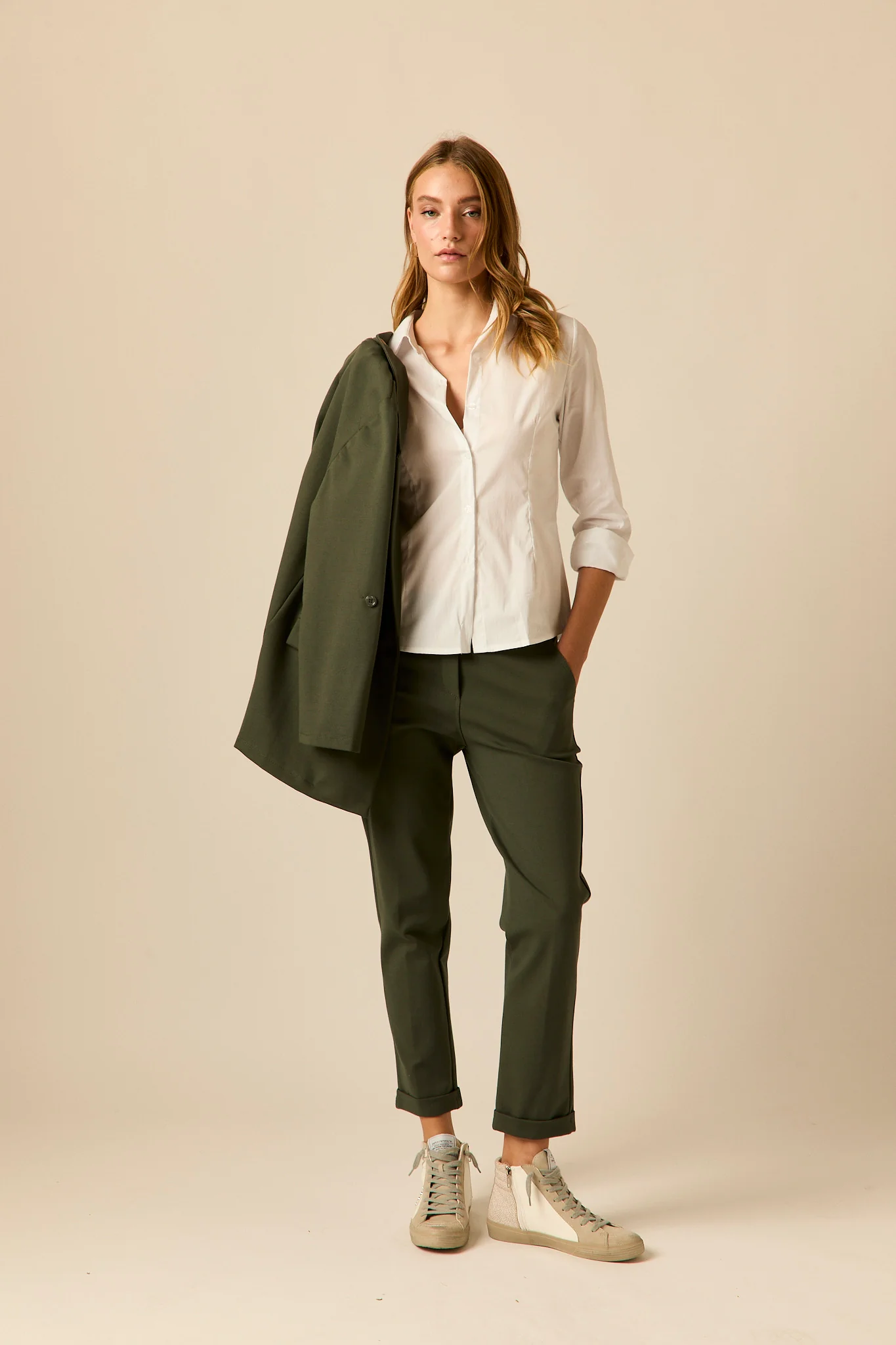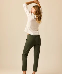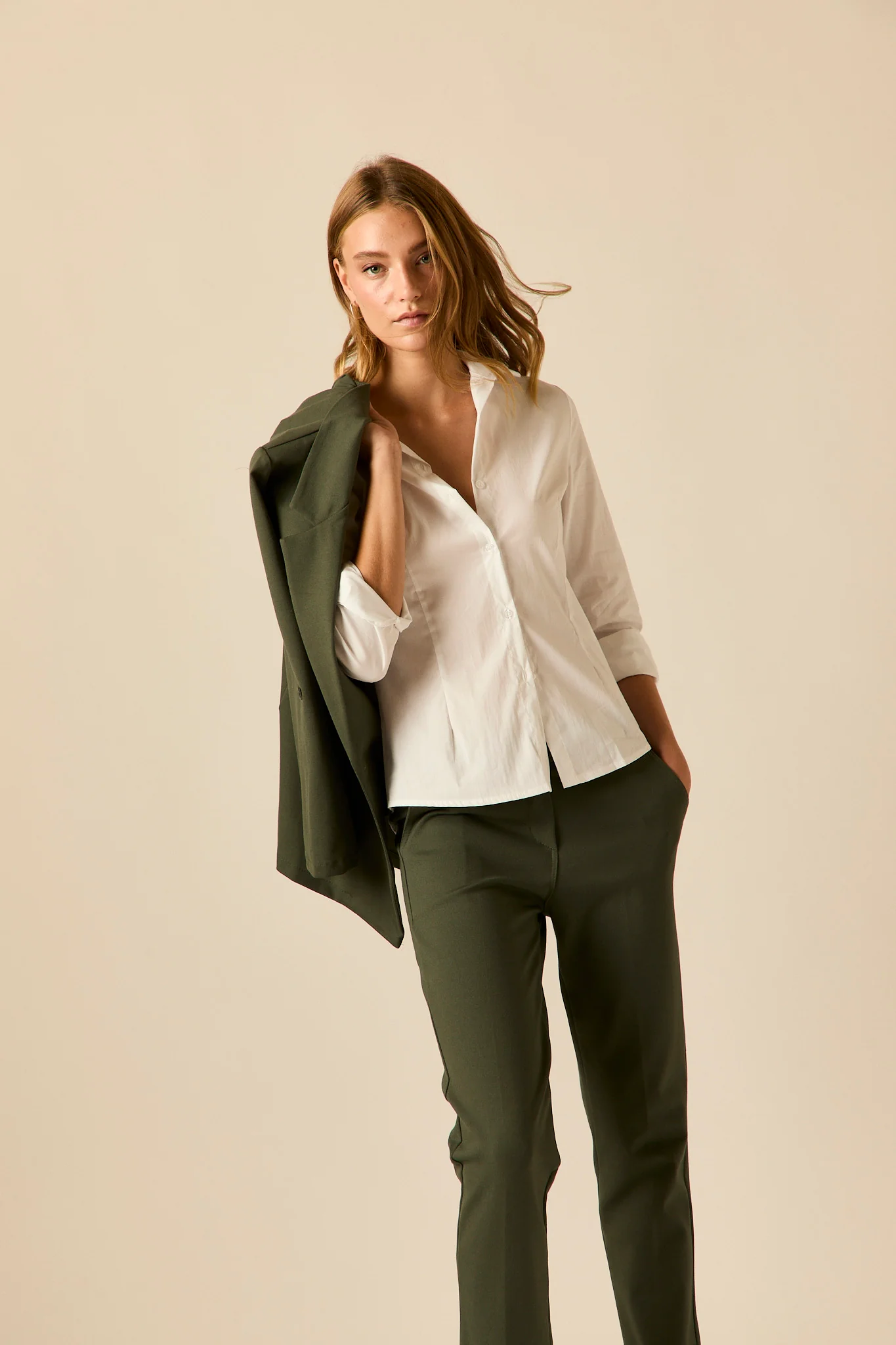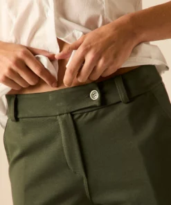 Pantalón de sastre en color verde kaki. Tiro alto, pierna recta, dos bolsillos laterales y cierre cruzado de dos botones y cremallera. Estos pantalones suelen tallar menos de lo habitual por lo que te recomendamos coger una talla más de la que uses habitualmente.