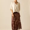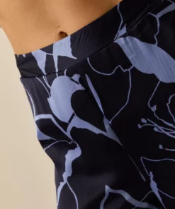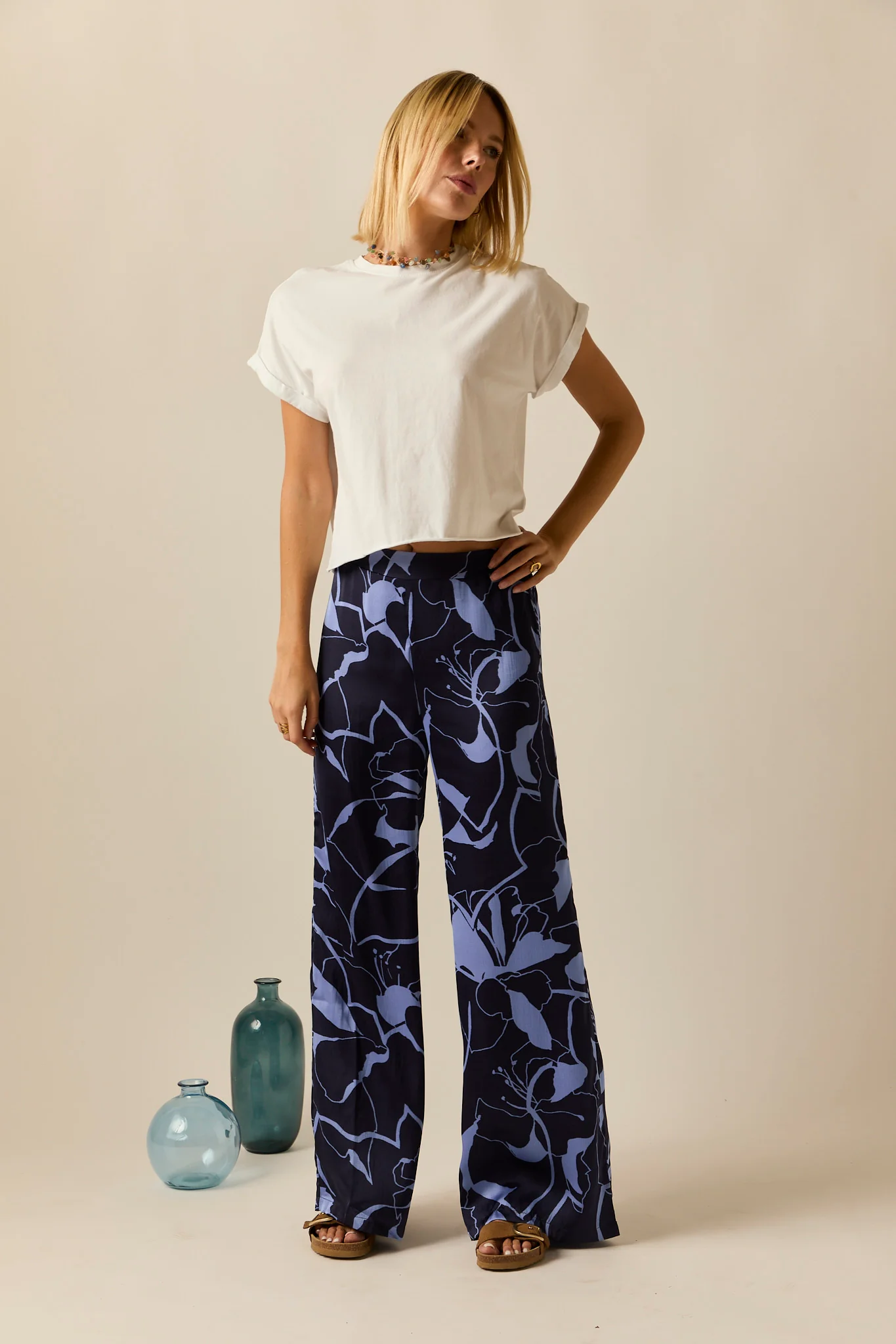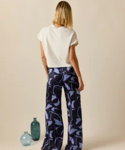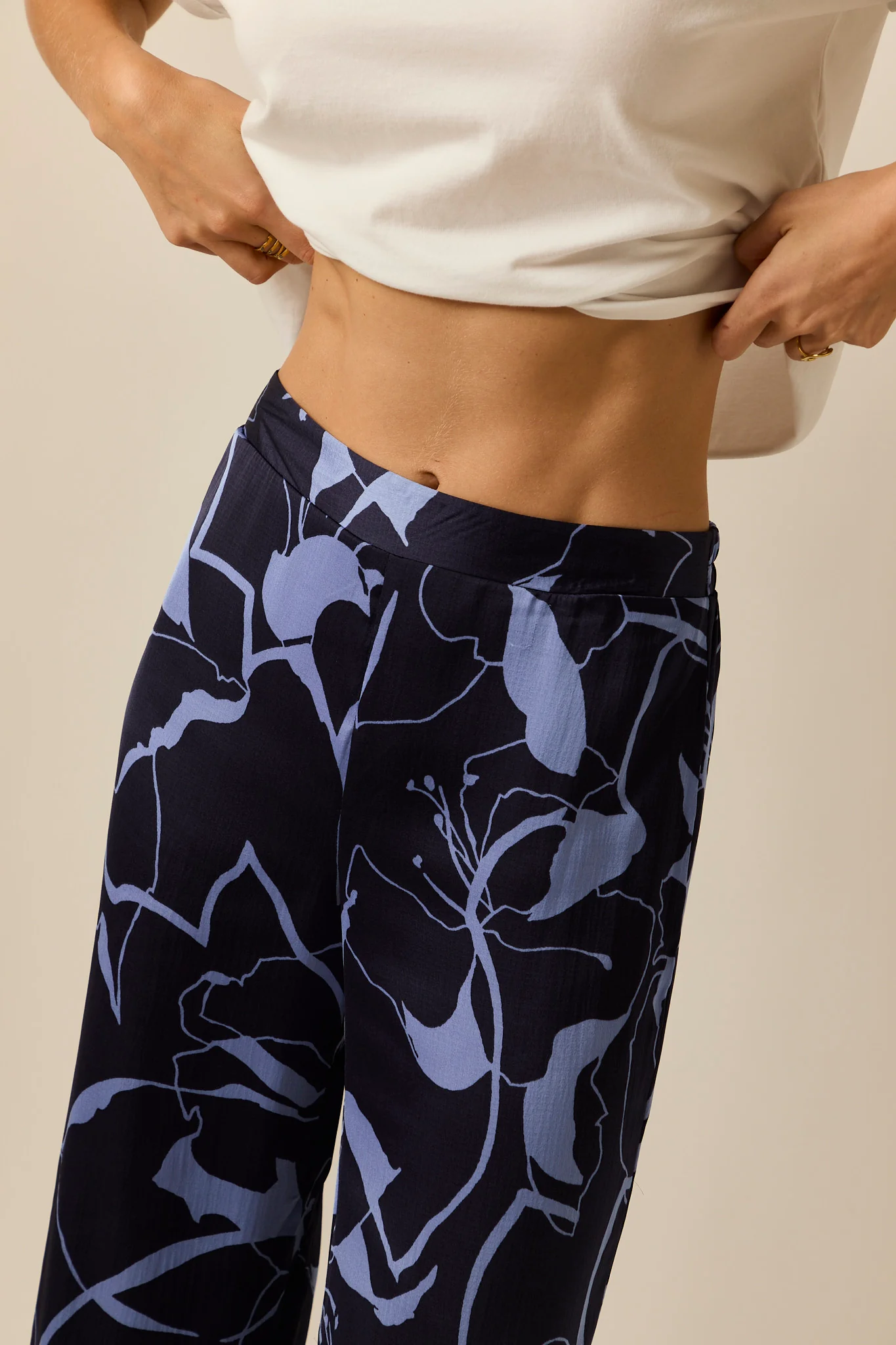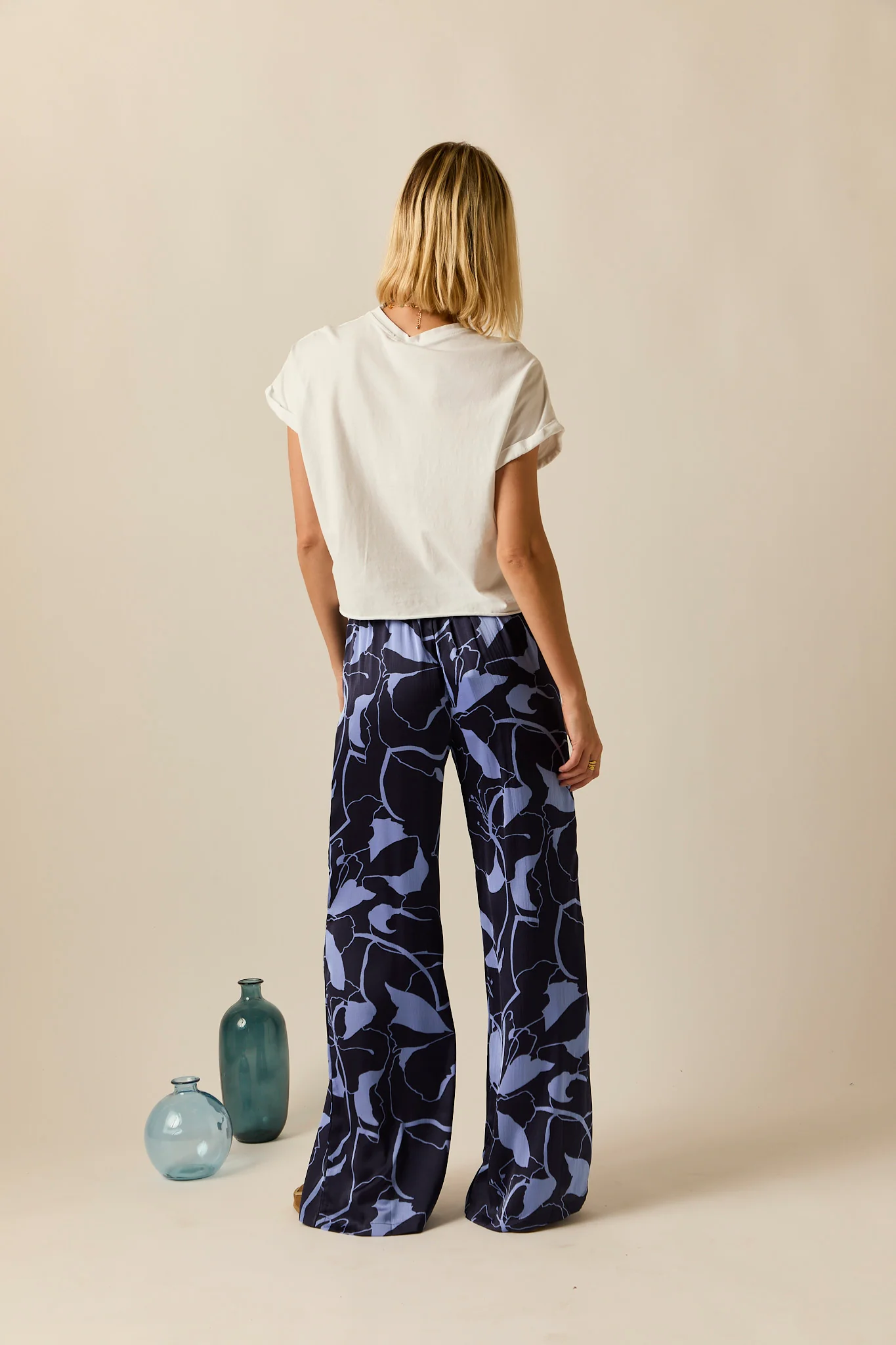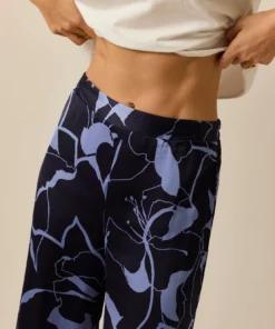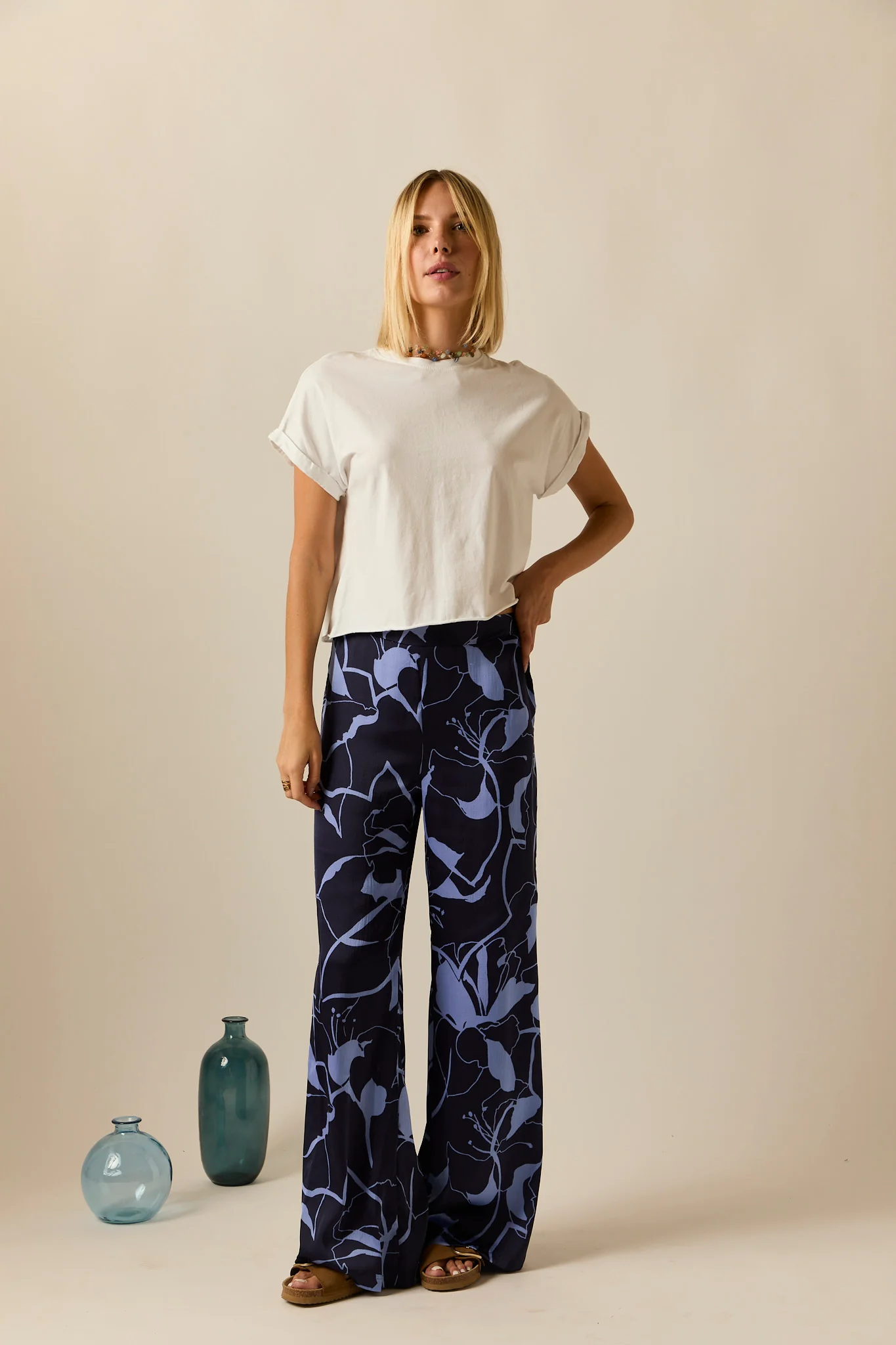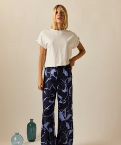 Pantalón largo de tejido satinado y maxiestampado floral en tonos azul lavanda. Tiro alto con cintura de gomas y pierna recta y ancha. Puedes combinarlo con la bomber o con la blazer a juego y elevar tu look. Una colección versátil con diseño elegante y fresco.