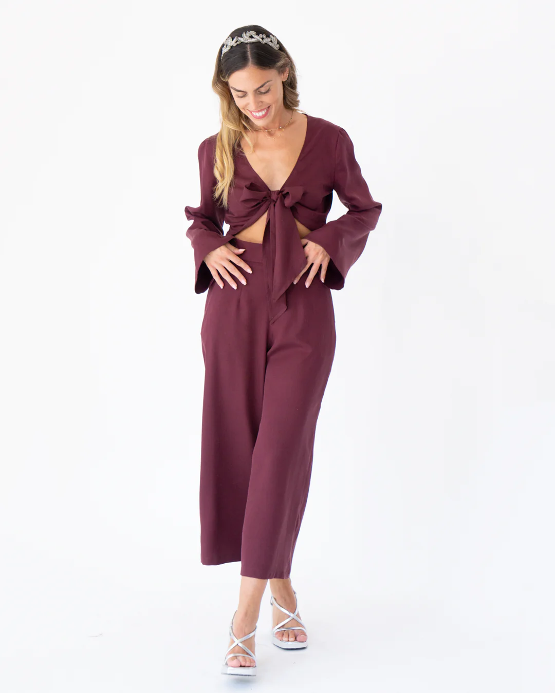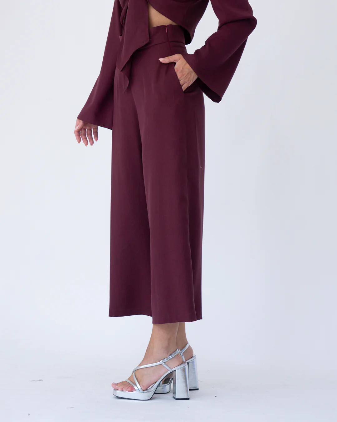 Pantalón midi, de pata ancha. Tiro muy alto. Bolsillos laterales. Cinturilla de 5cm.