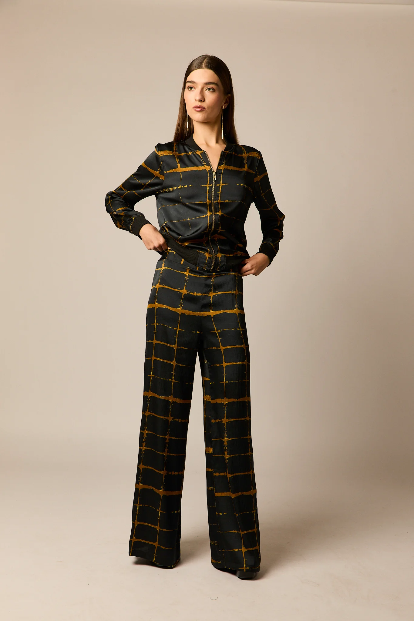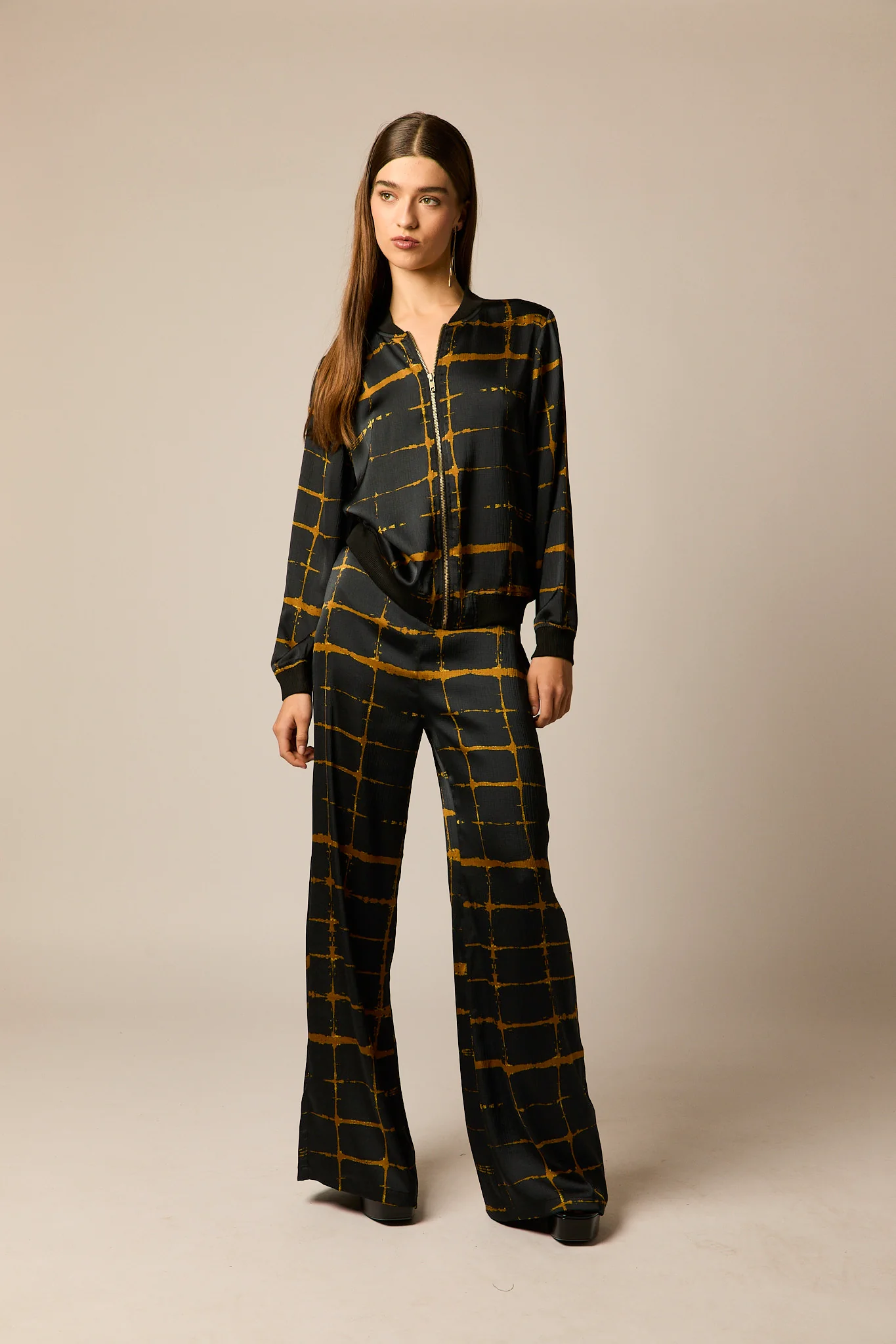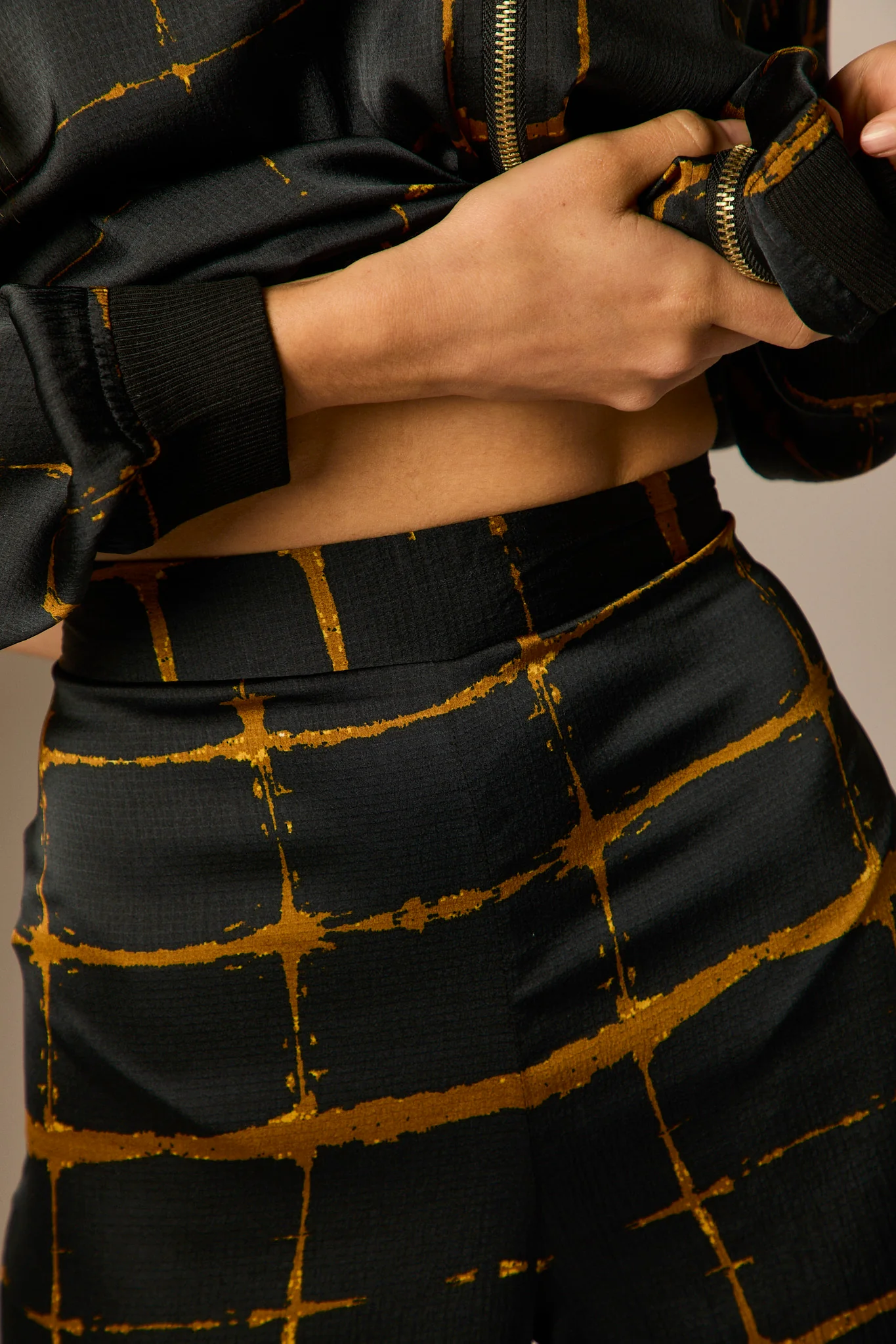 Pantalón negro satinado jacquard cuadros dorados. Tiro alto, cintura elástica, diseño recto y pierna ancha.
