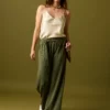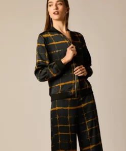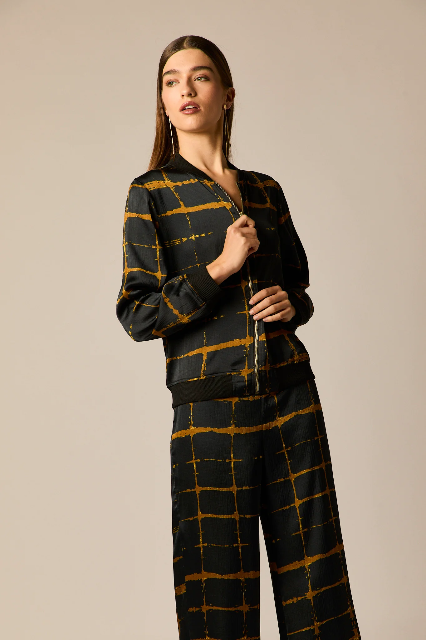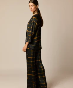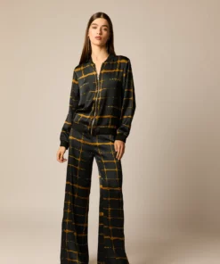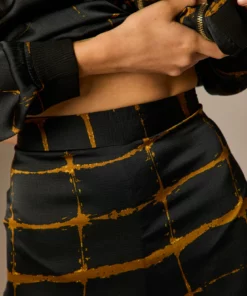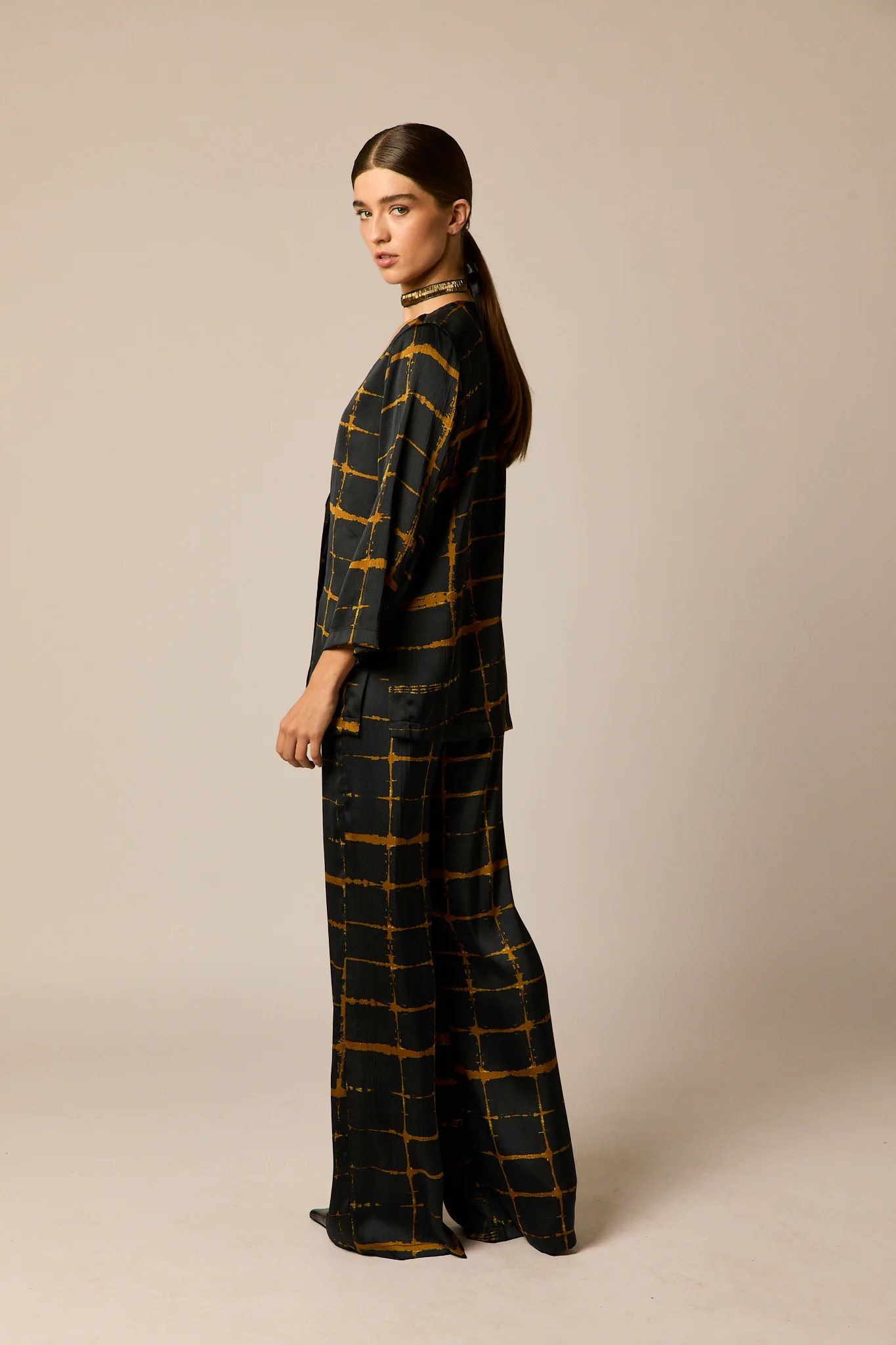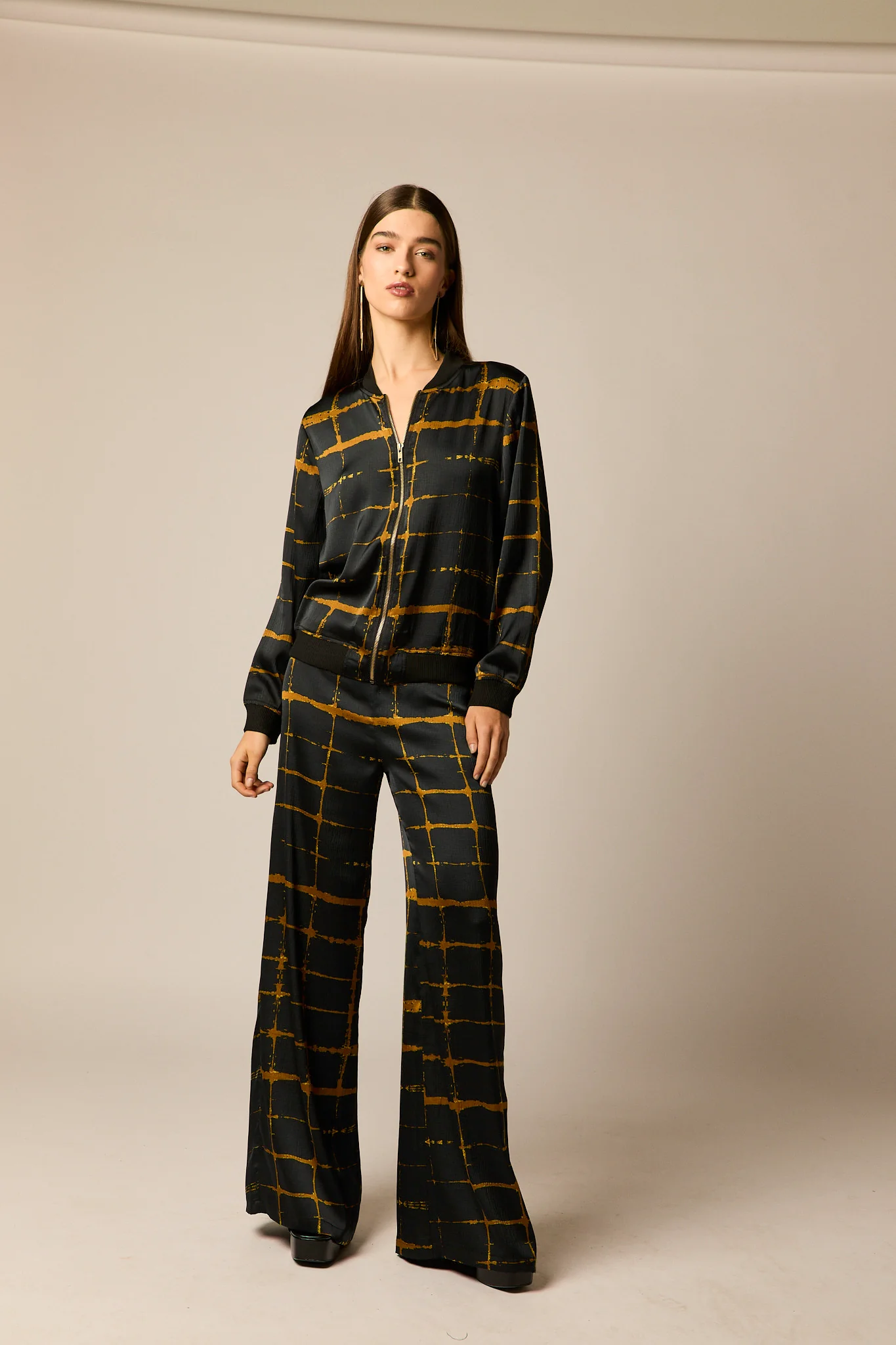 Pantalón negro satinado jacquard cuadros dorados. Tiro alto, cintura elástica, diseño recto y pierna ancha.