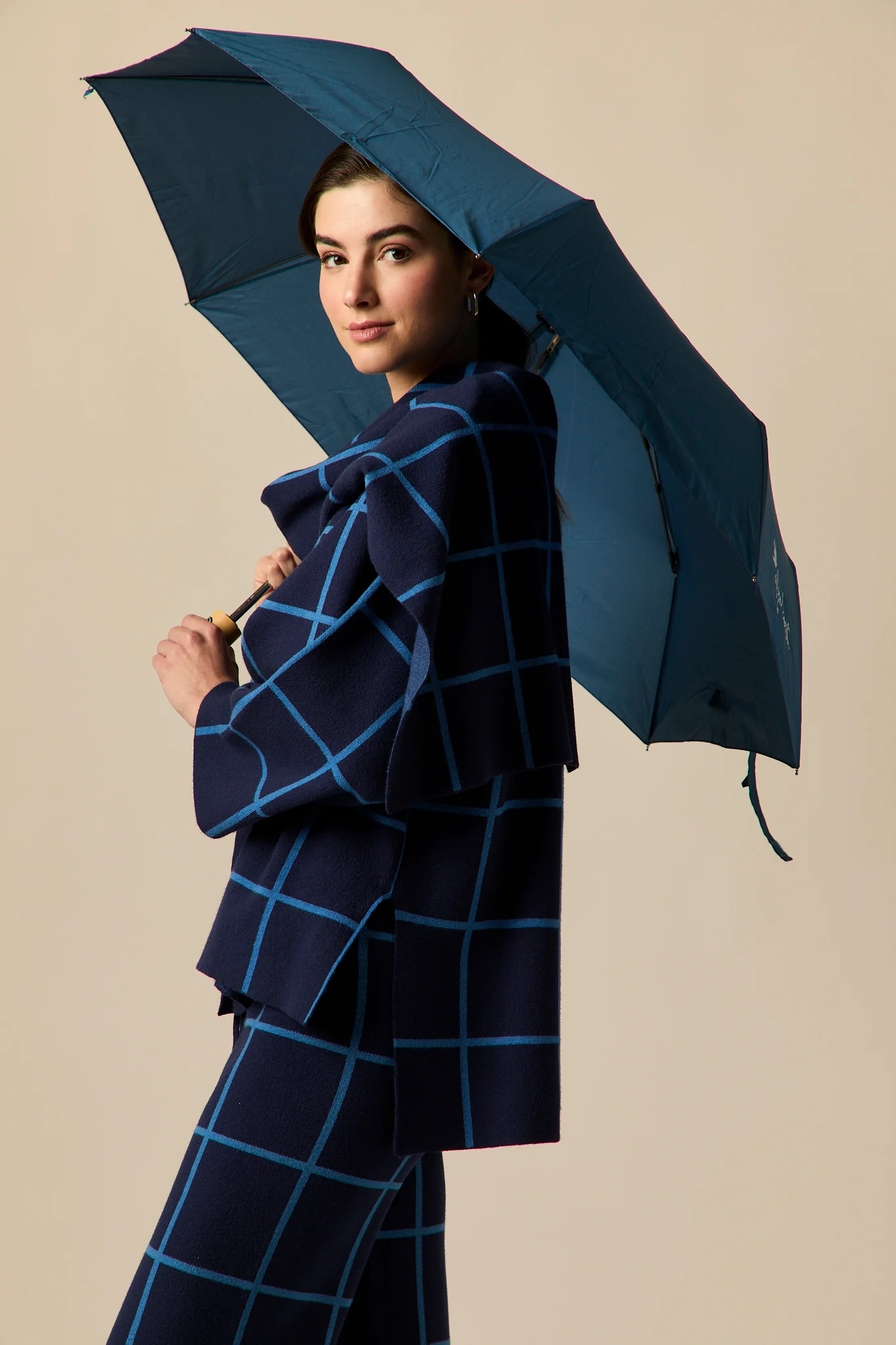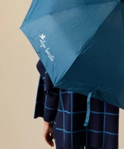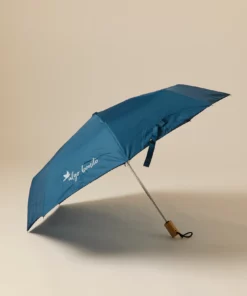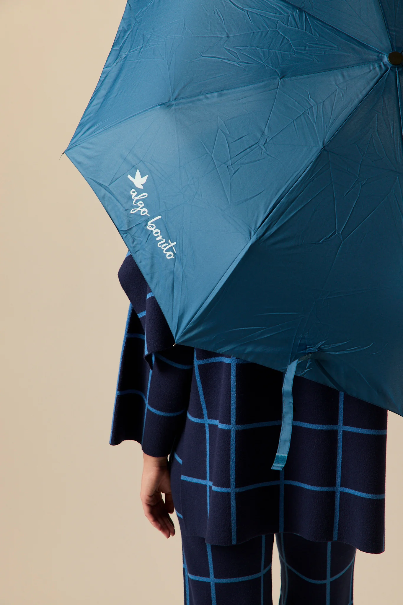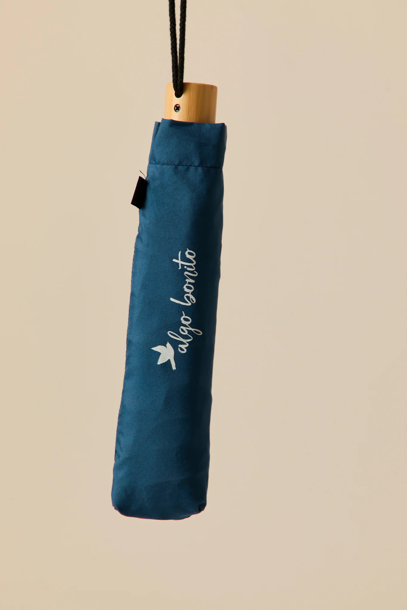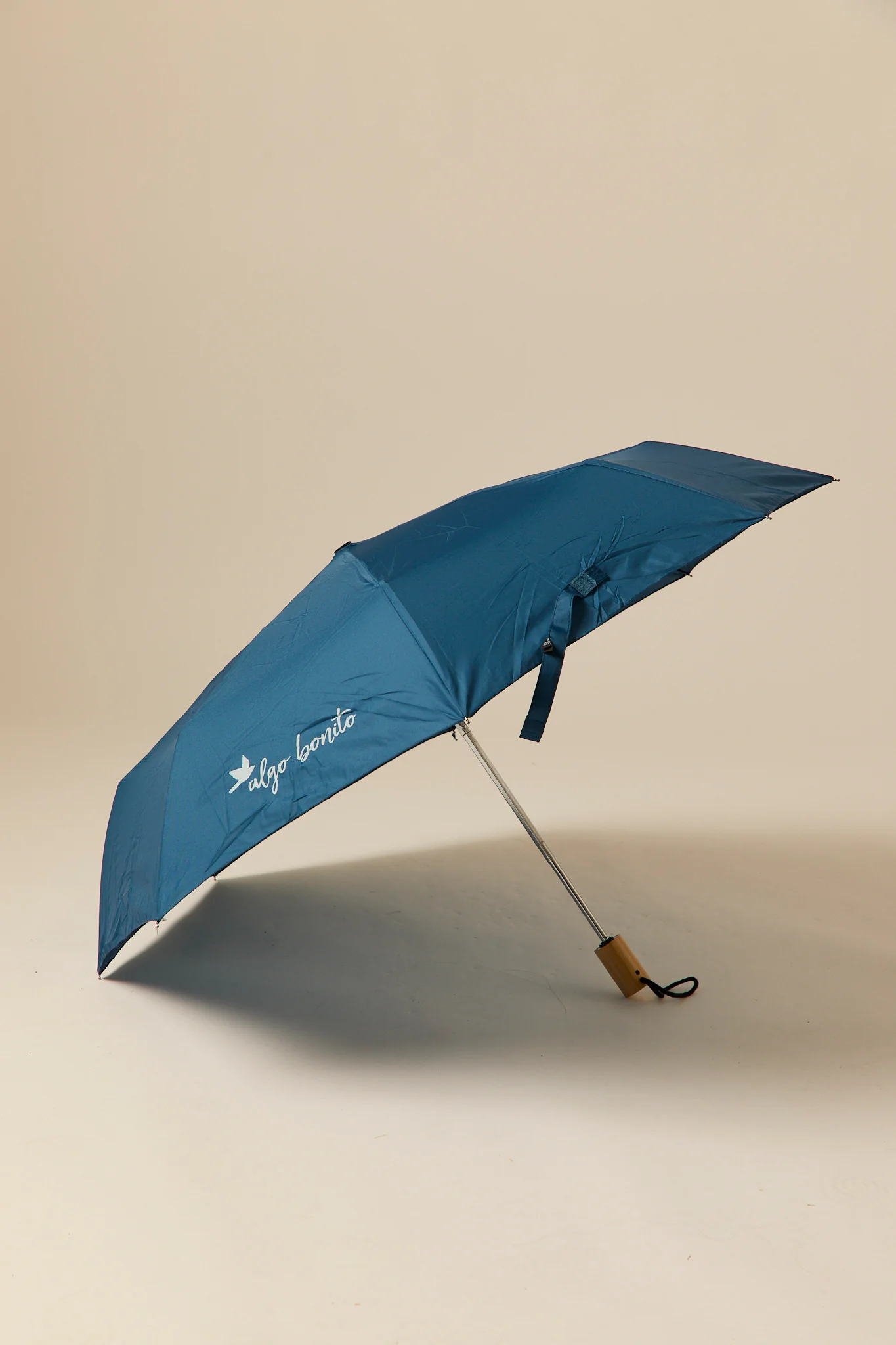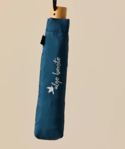 Paraguas algo bonito en color azul marino. Mango de madera y botón automático.