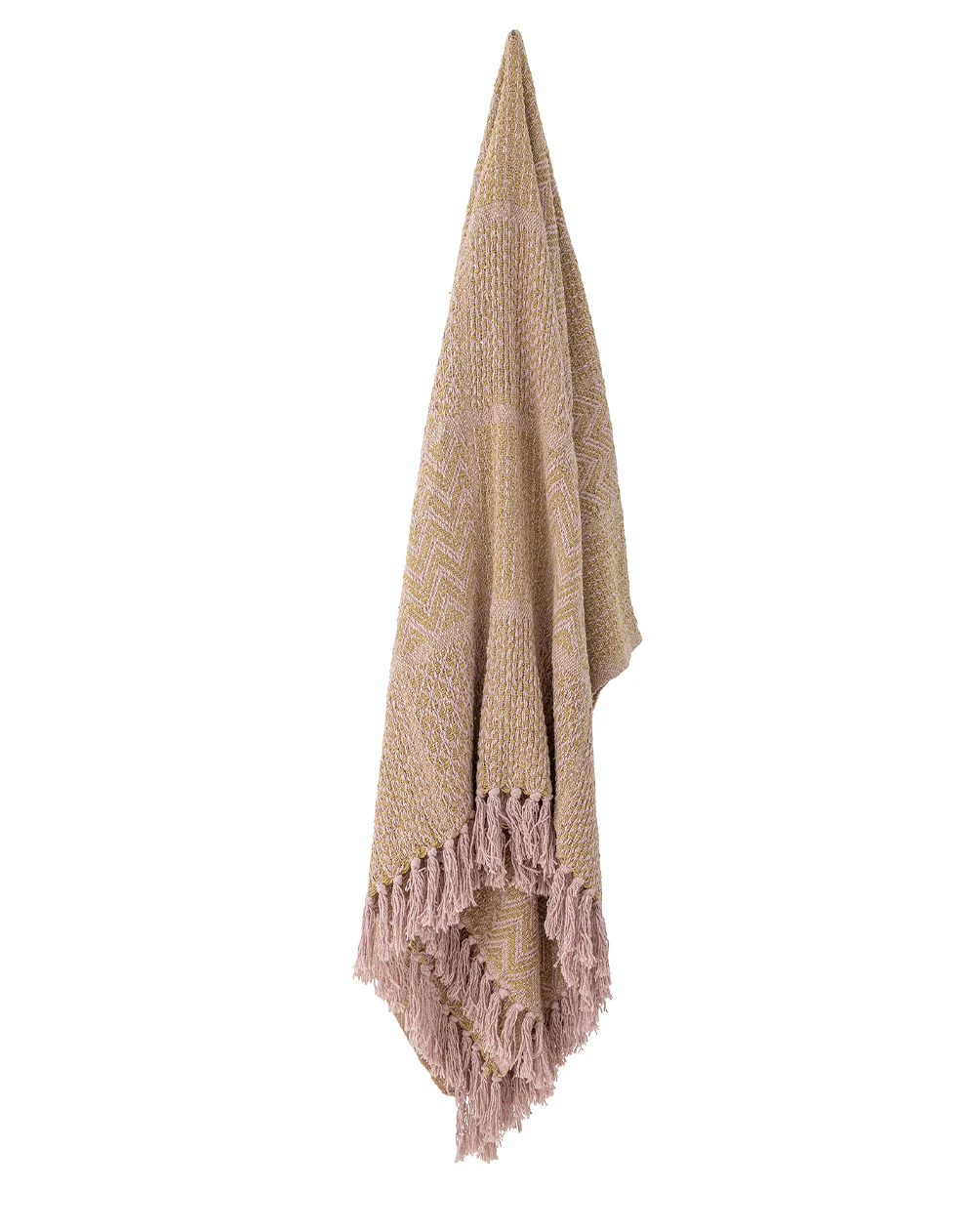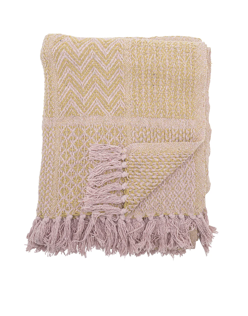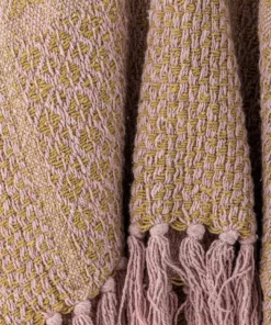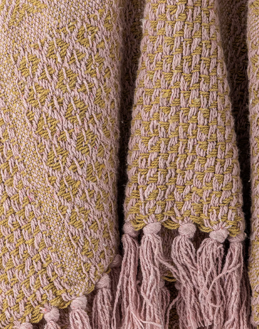 Large woven throw in pastel pink and warm yellow with fringes at the ends.