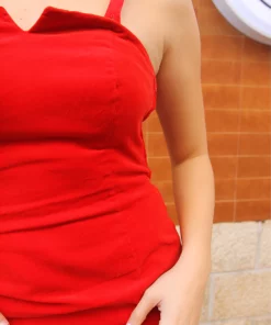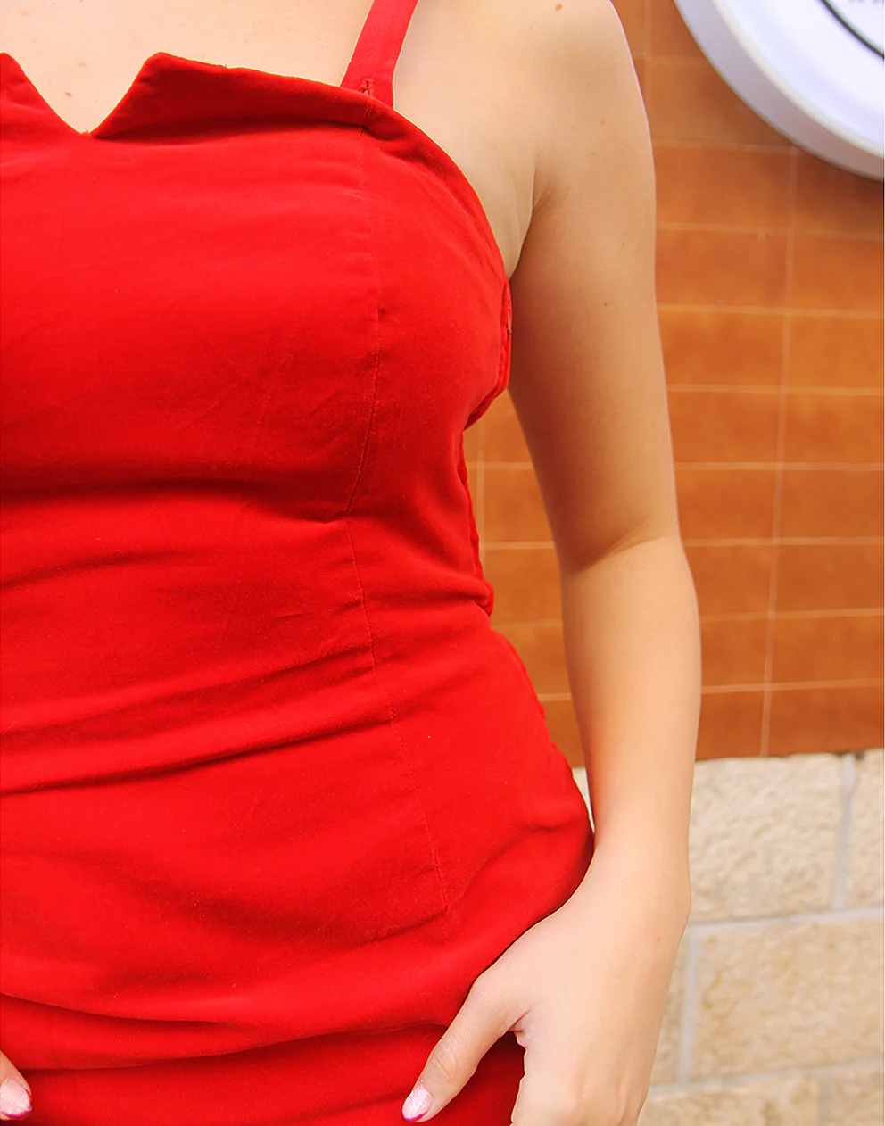 Red velvet strappy dress.