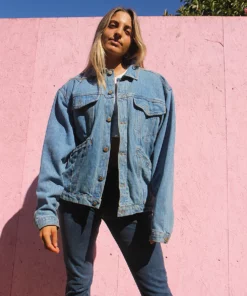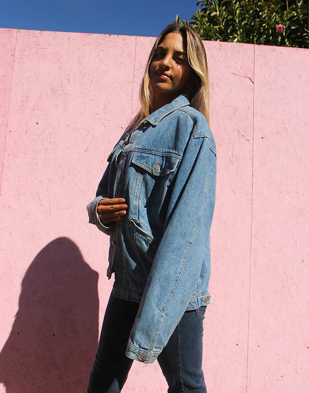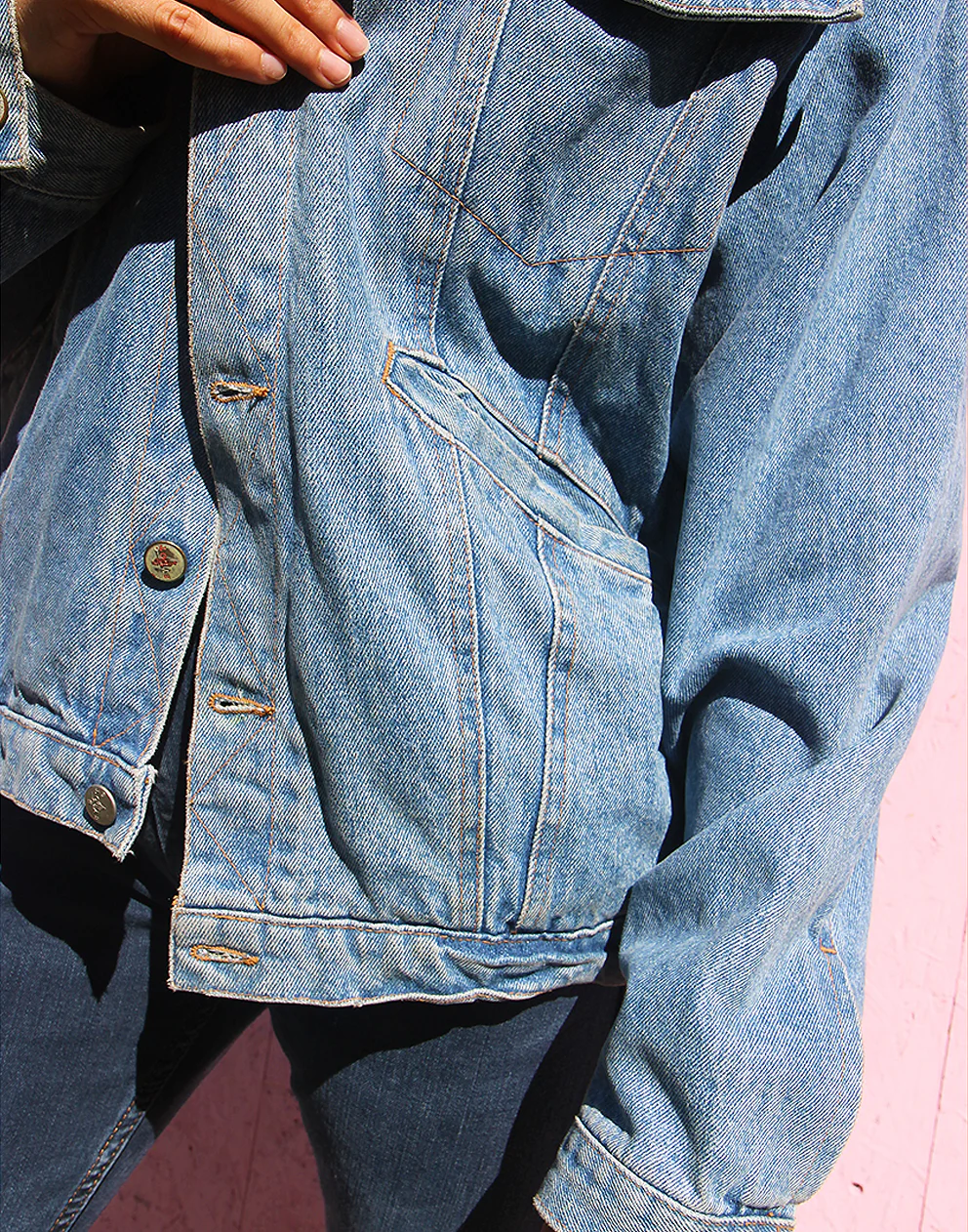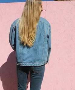 Vintage sherpa jean jacket in a mid wash blue denim.