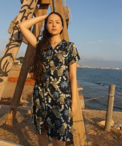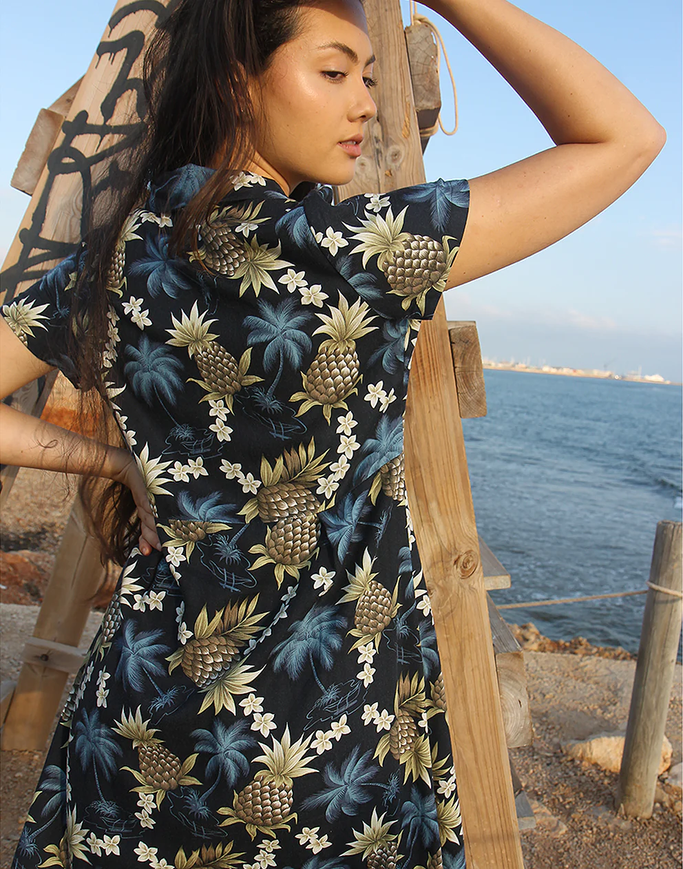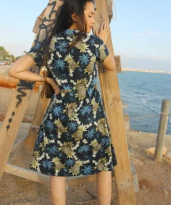 Measurements: 38″/ 97cm bust – 32″ / 81cm waist – 42″ / 107cm hips – 7″ / 18cm sleeve length – 40″ / 102cm dress length.