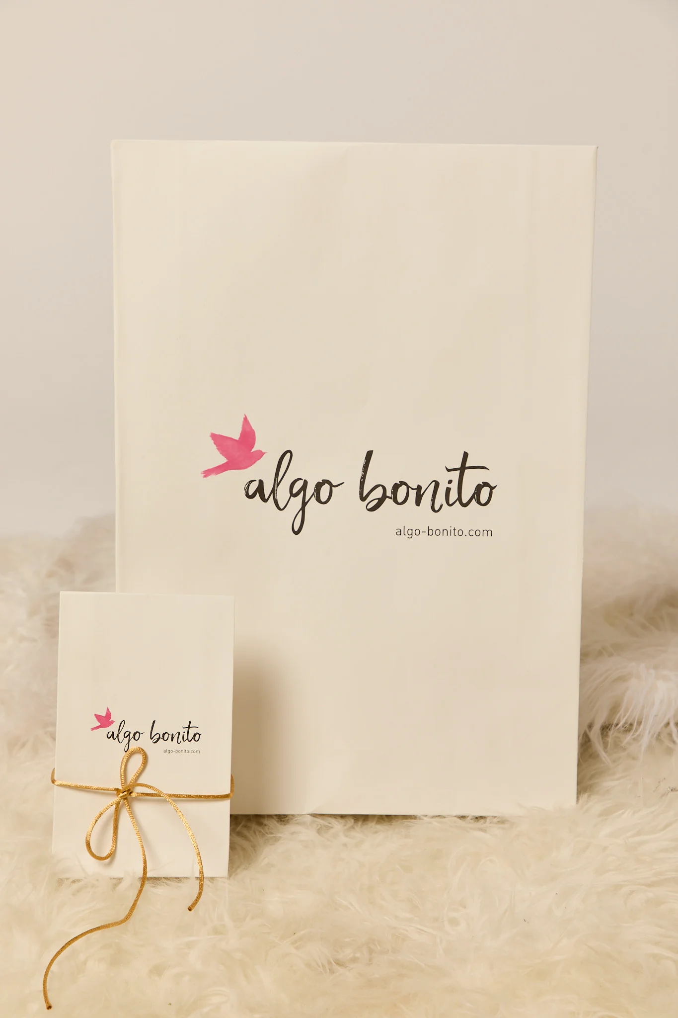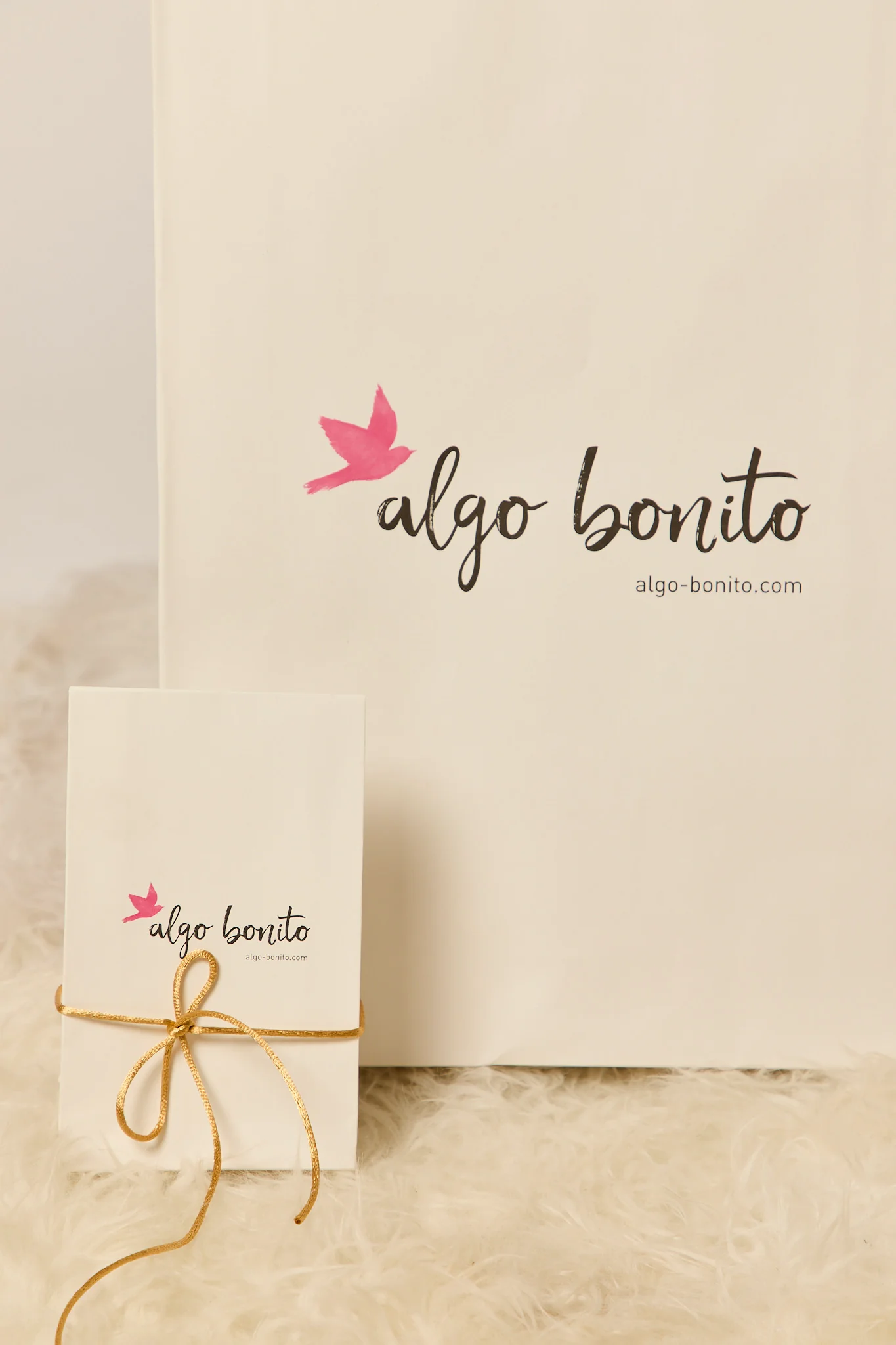 Sobre de regalo con logo Algo Bonito impreso a contraste. Cierre con banda adhesiva.