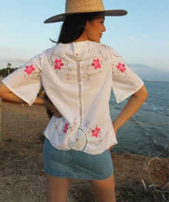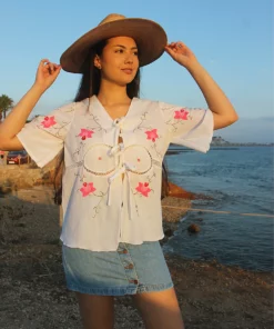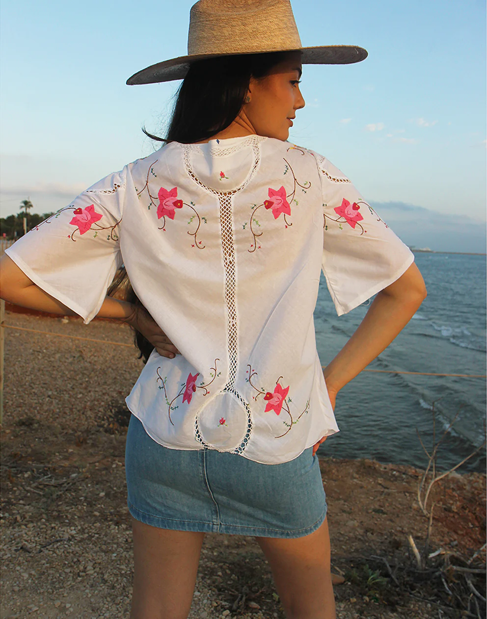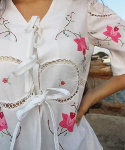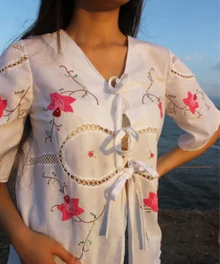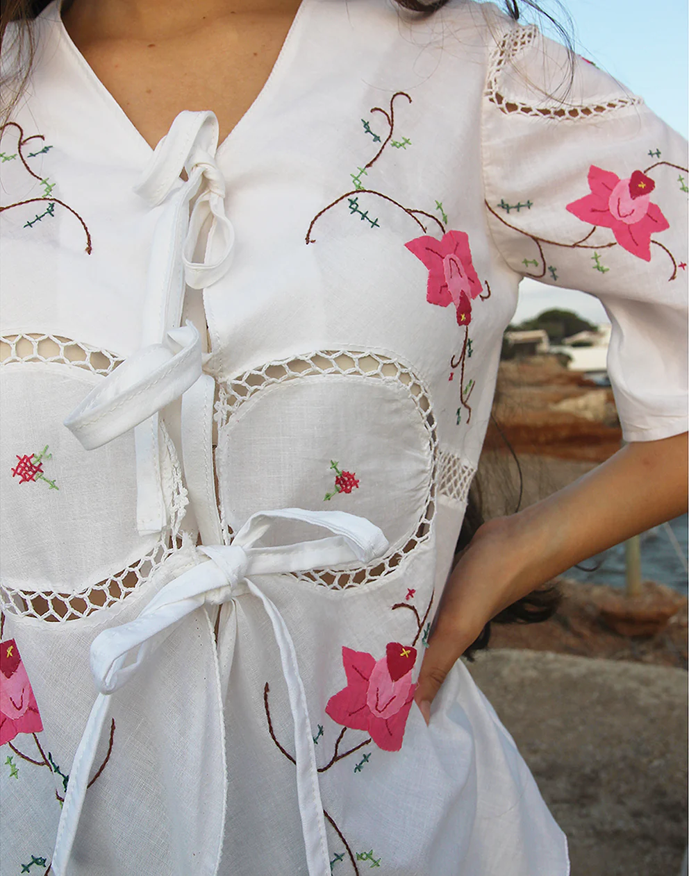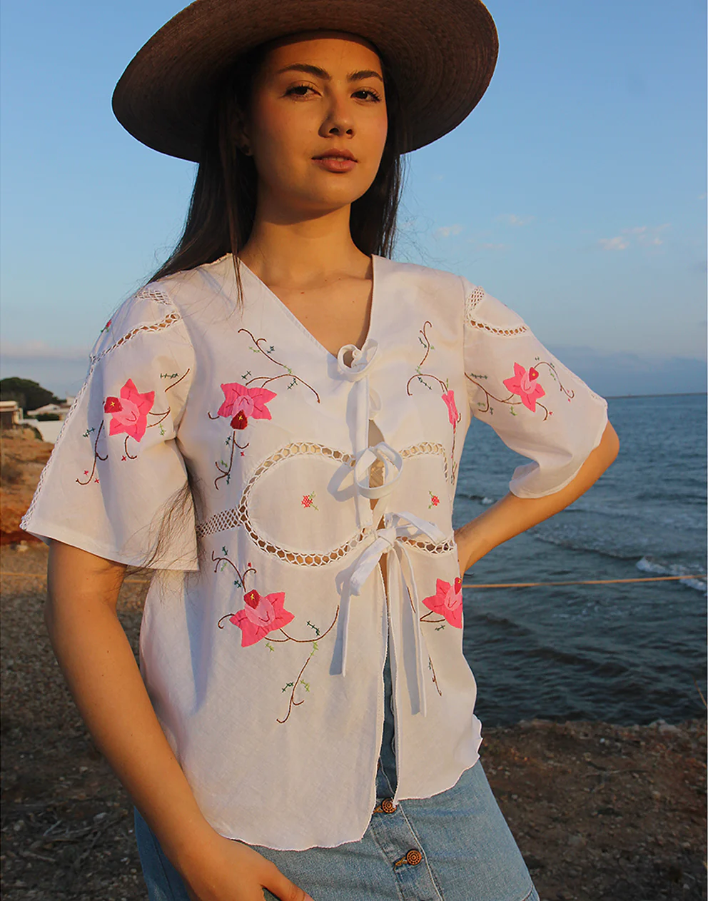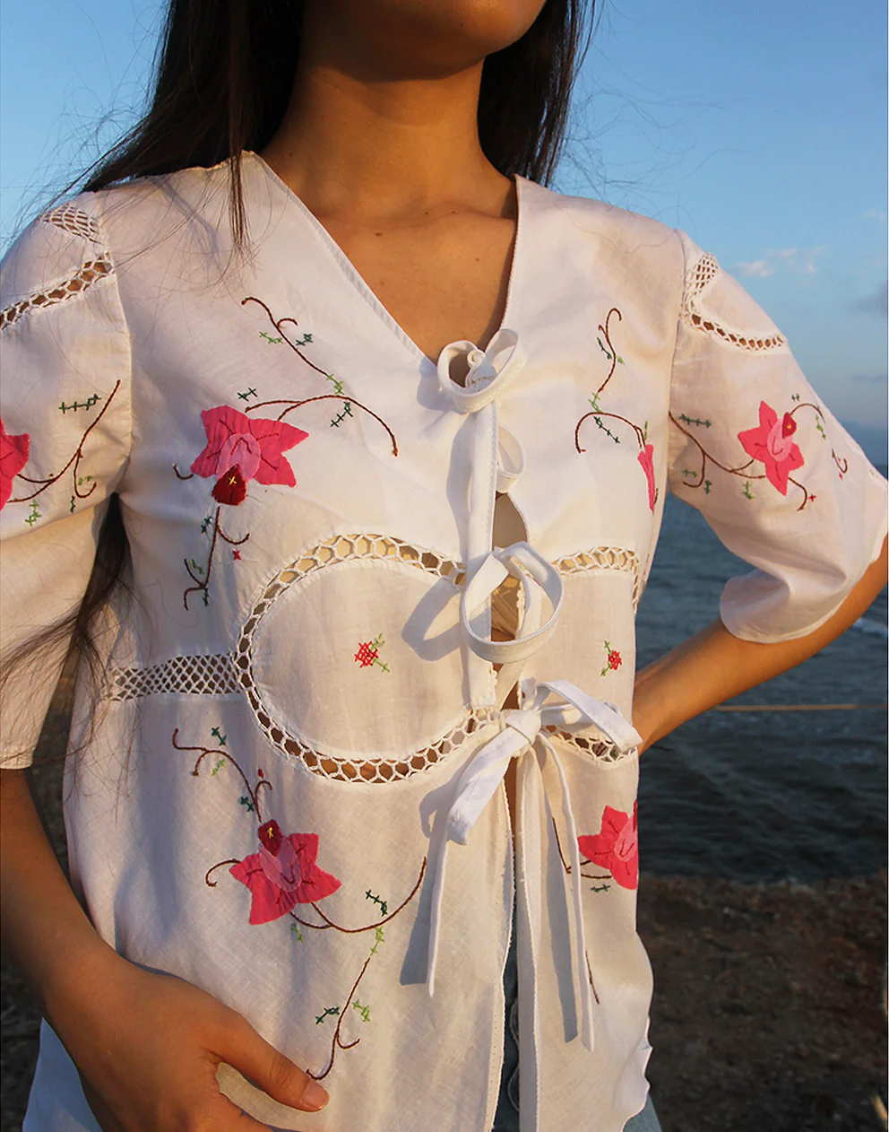 Tie front blouse in white with hand embroidered floral details and crochet panels.