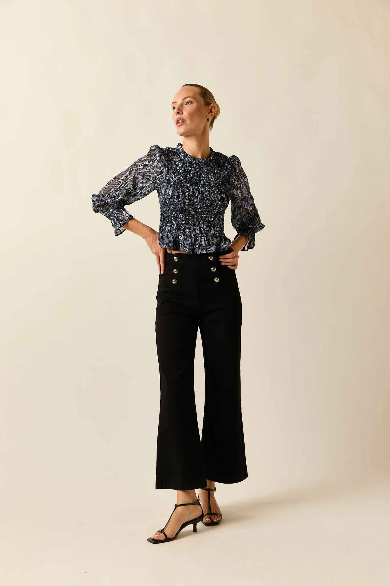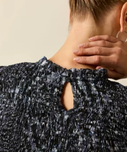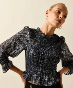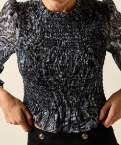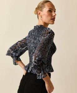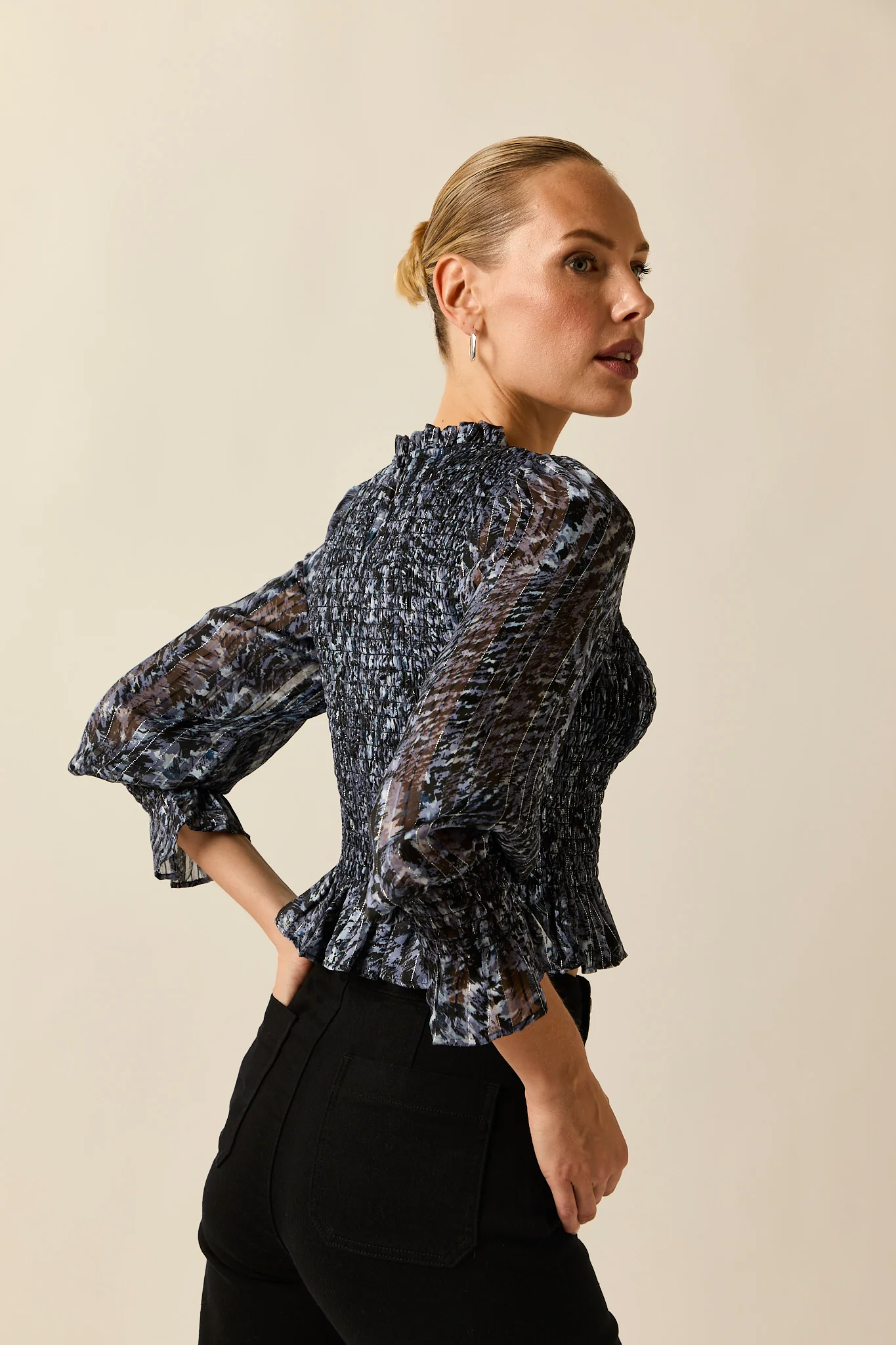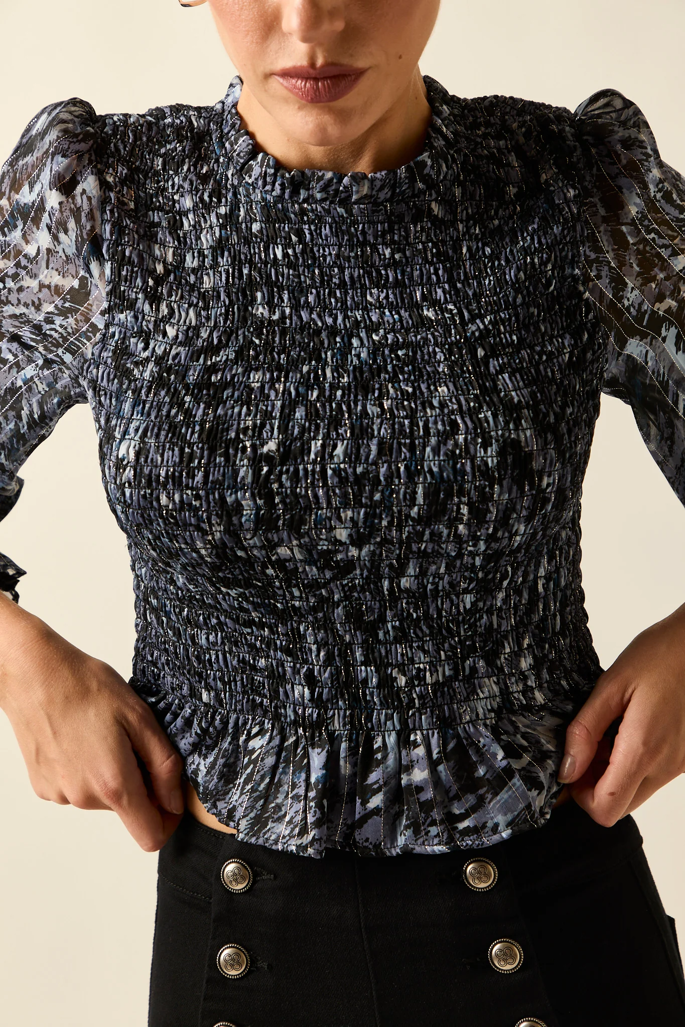 Top de estampado animal print en tonos azules y detalles de hilo metalizado por todo el diseño. Cuello caja, cuerpo de nido de abeja, manga 3/4 abullonada semitransparente y cierre de botón en la espalda.