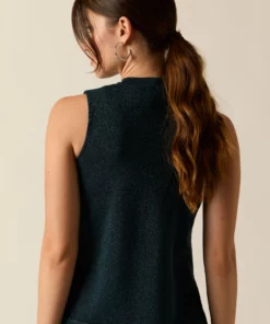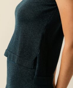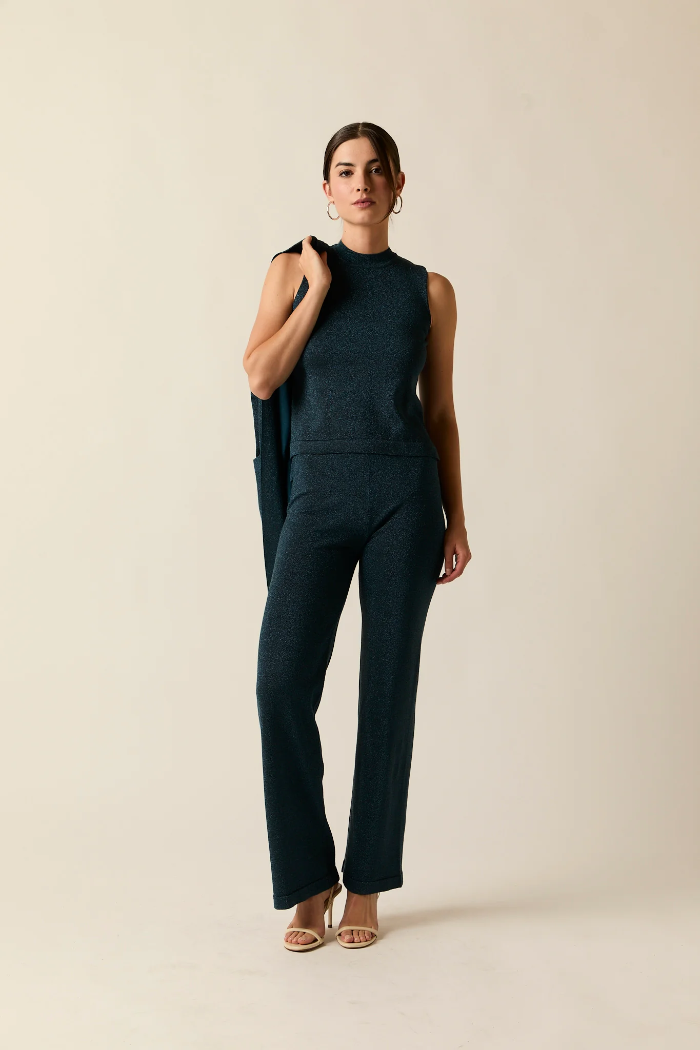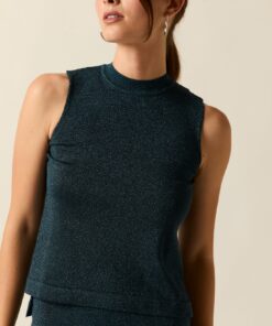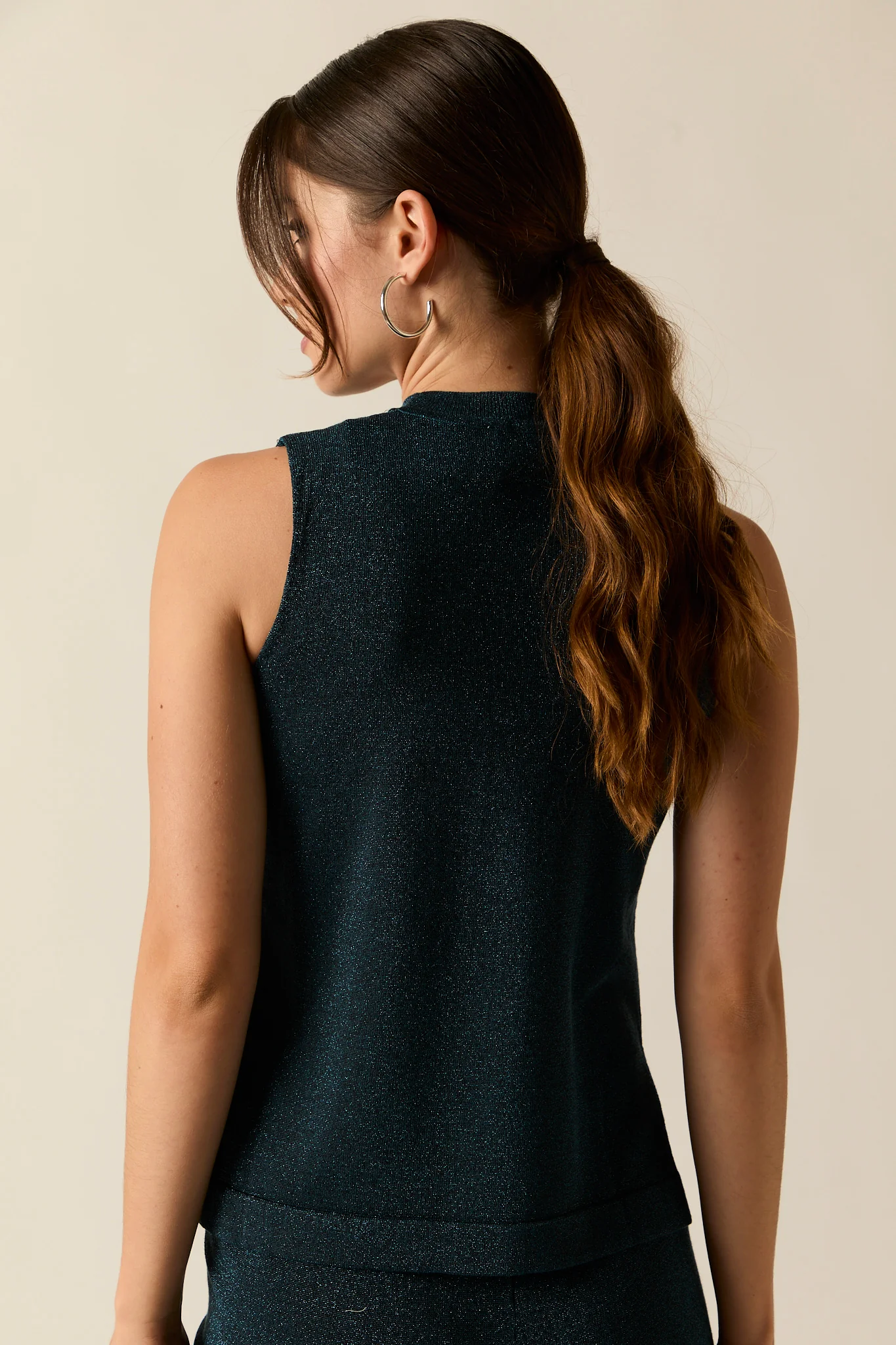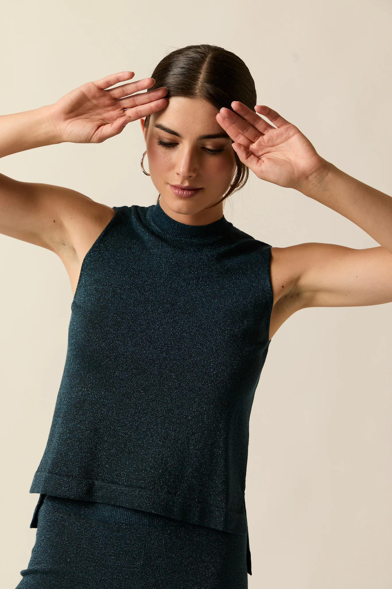 Top lurex en color azul petróleo. Cuello alto, sin mangas y diseño recto con ligeras aberturas laterales.
