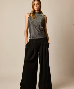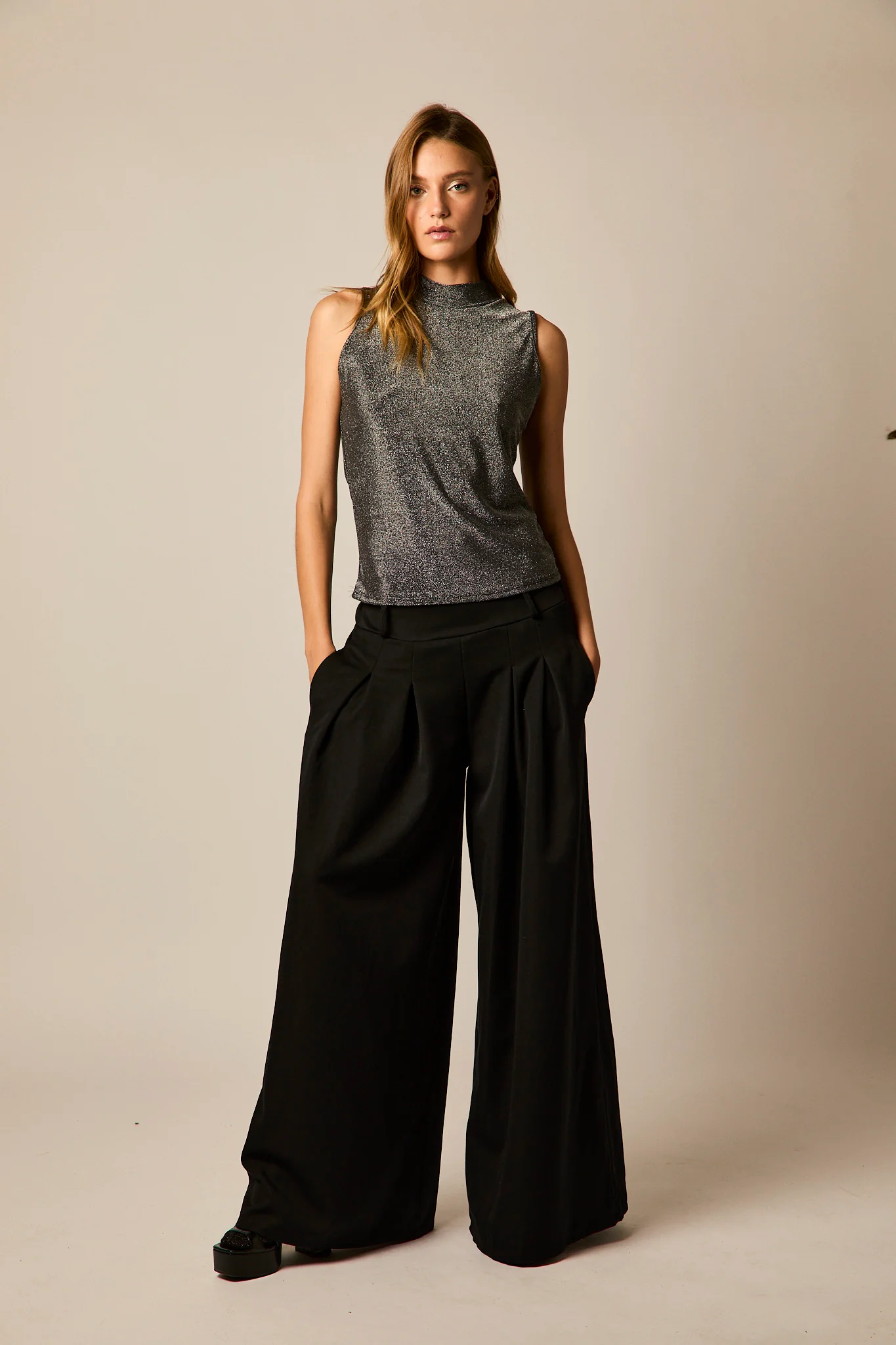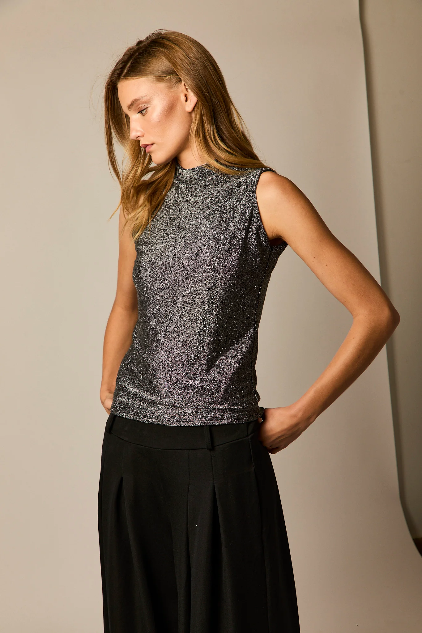 Top de lurex en color plateado. Cuello alto, sin mangas y diseño recto.