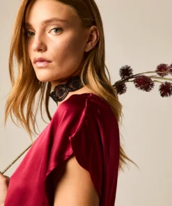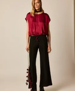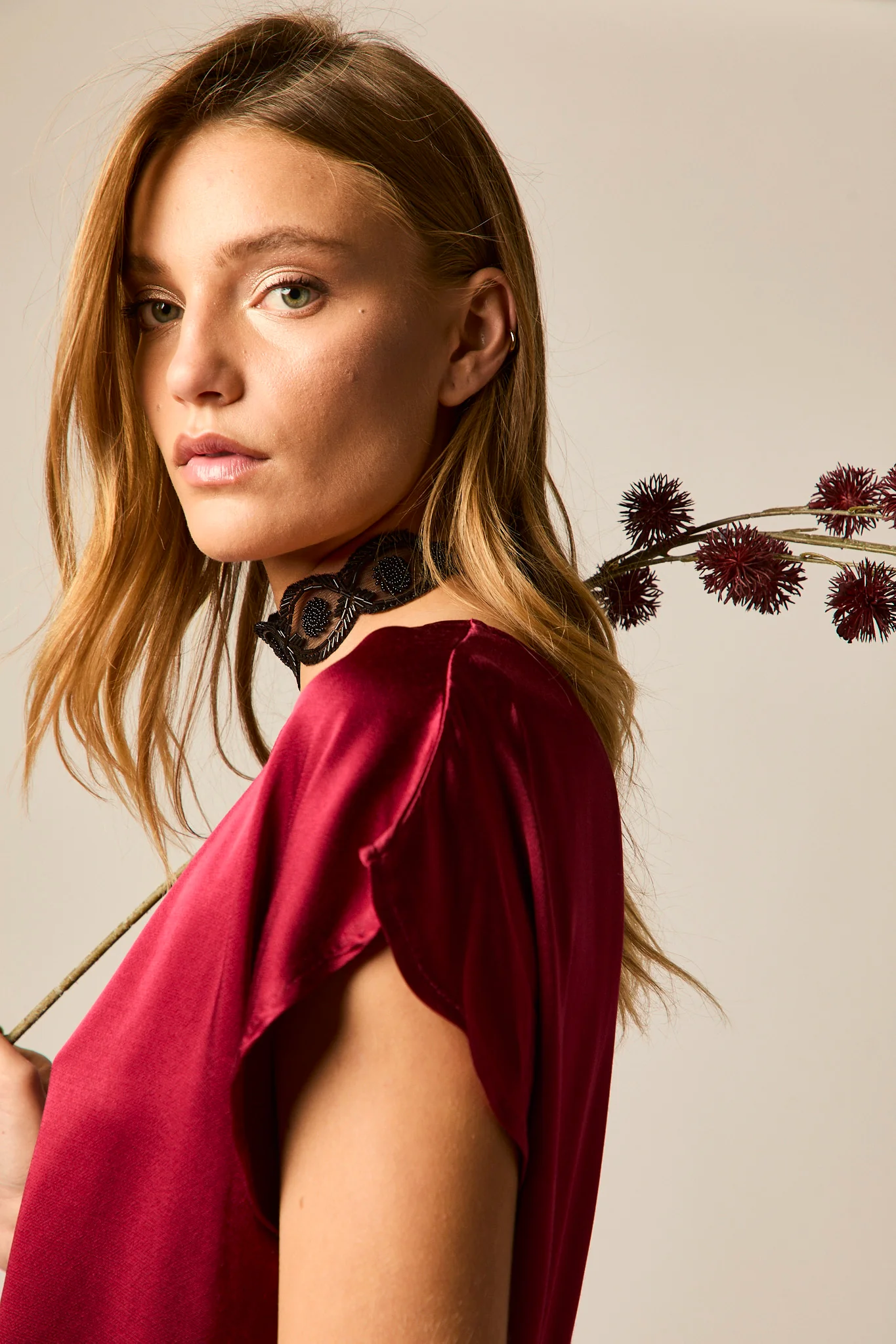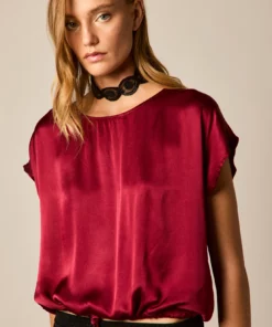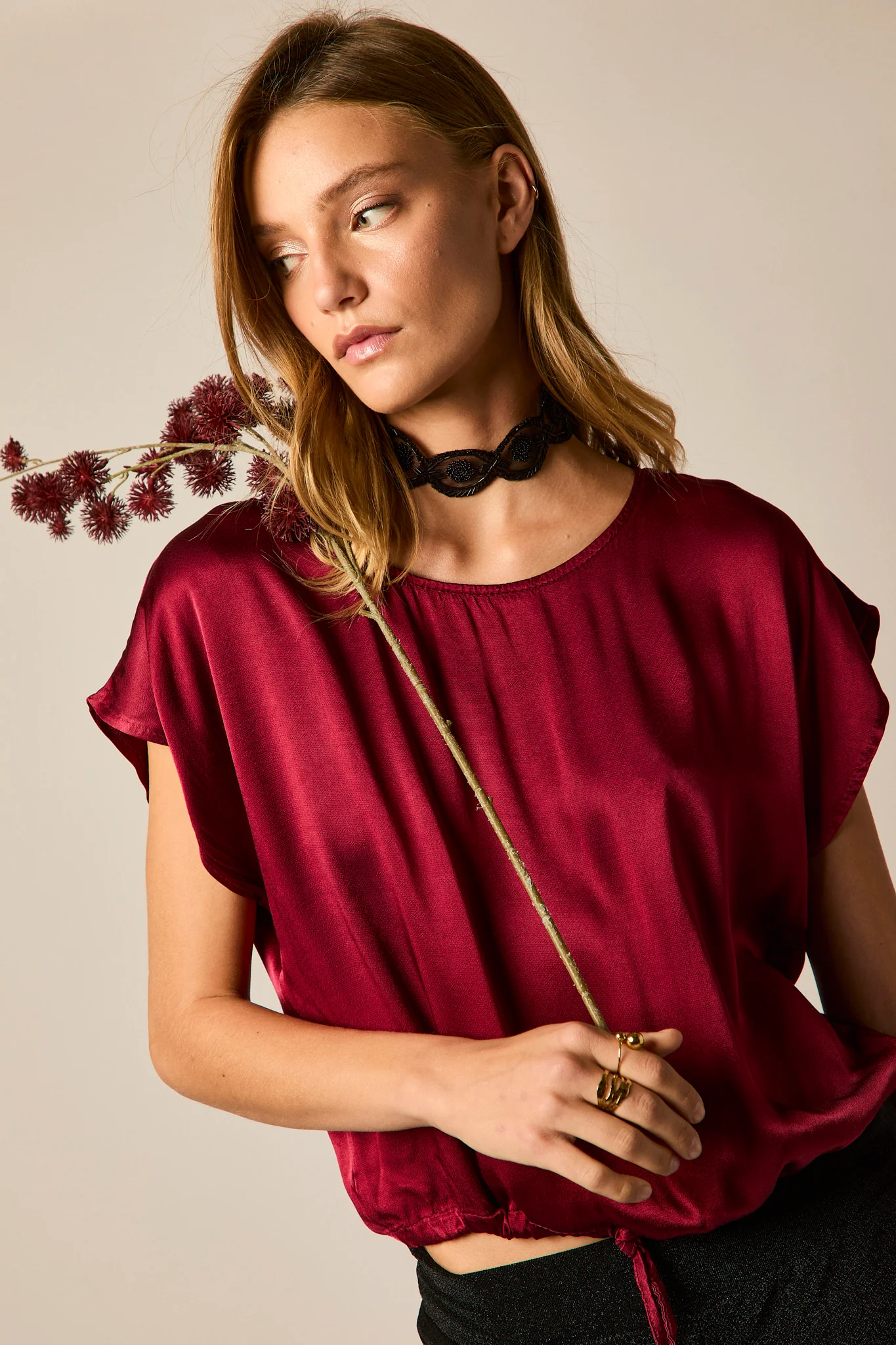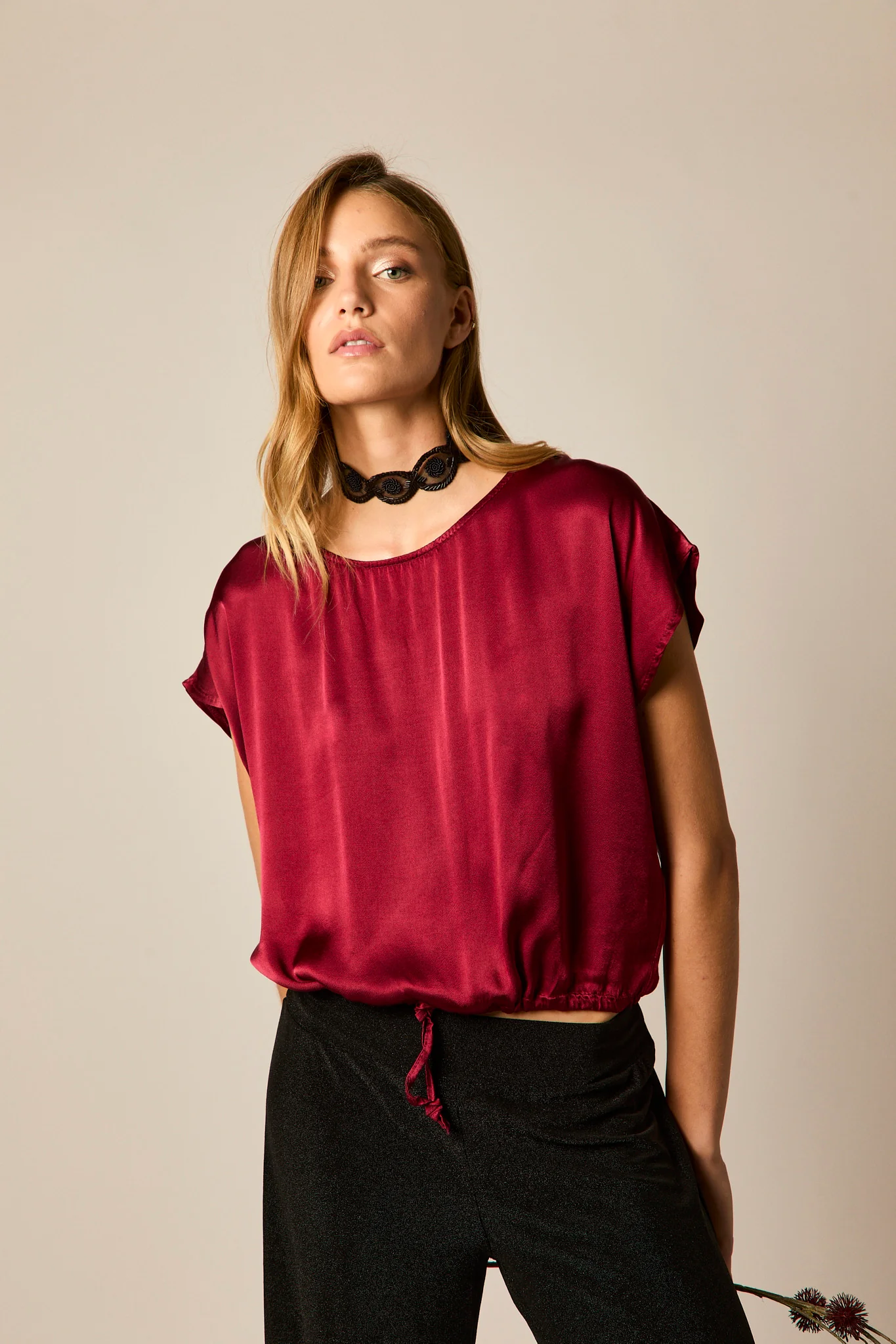 Top de raso en color crema. Cuello caja, manga corta y detalle de lazo en el bajo.