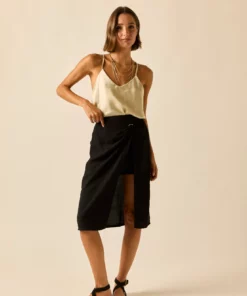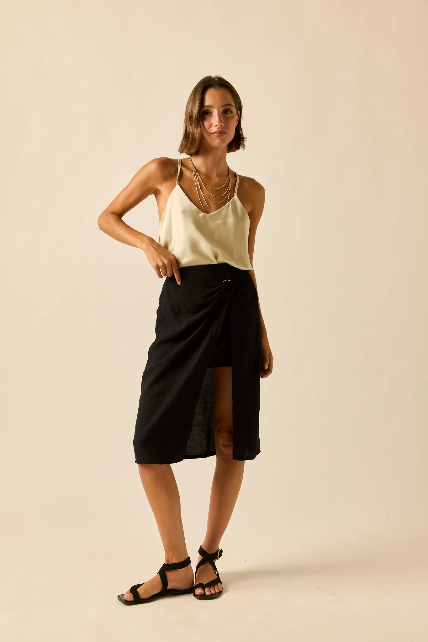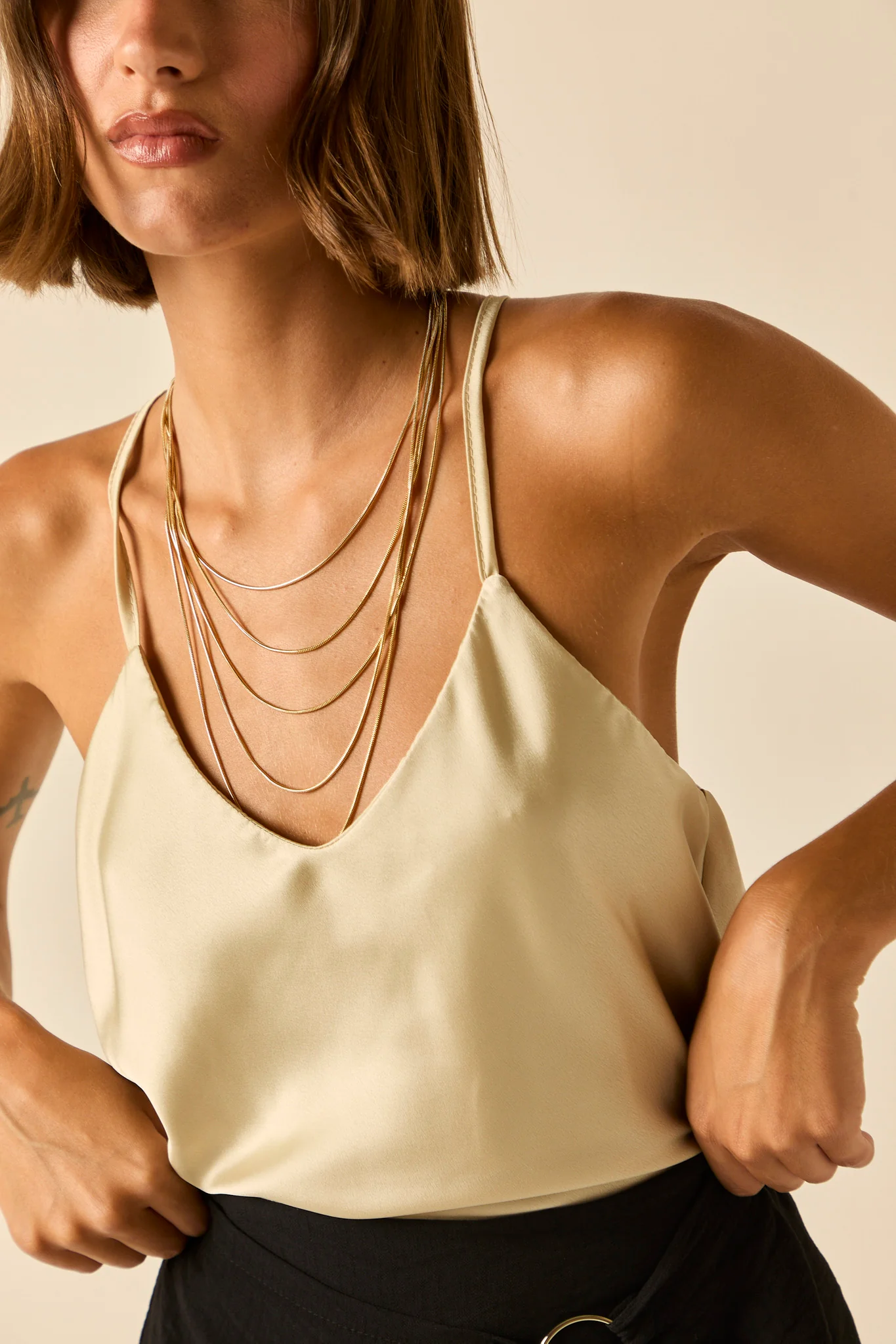 Top de raso en color beige. Cuello pico, tirante fino y diseño recto y fluido.