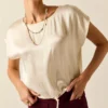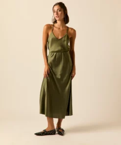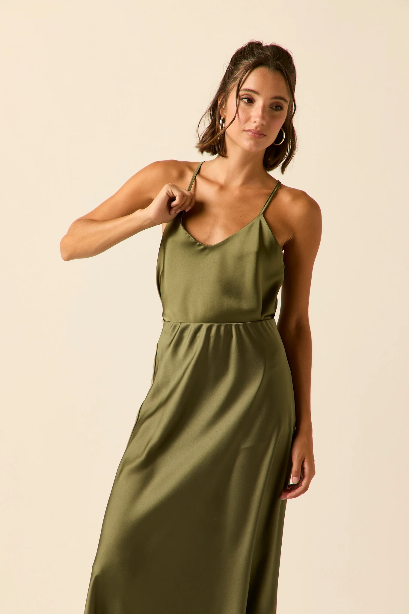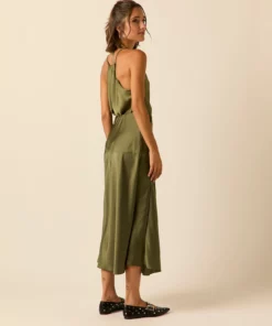 Top de raso en color oliva. Cuello pico, tirante fino y diseño recto y fluido.