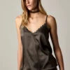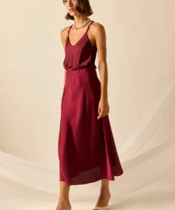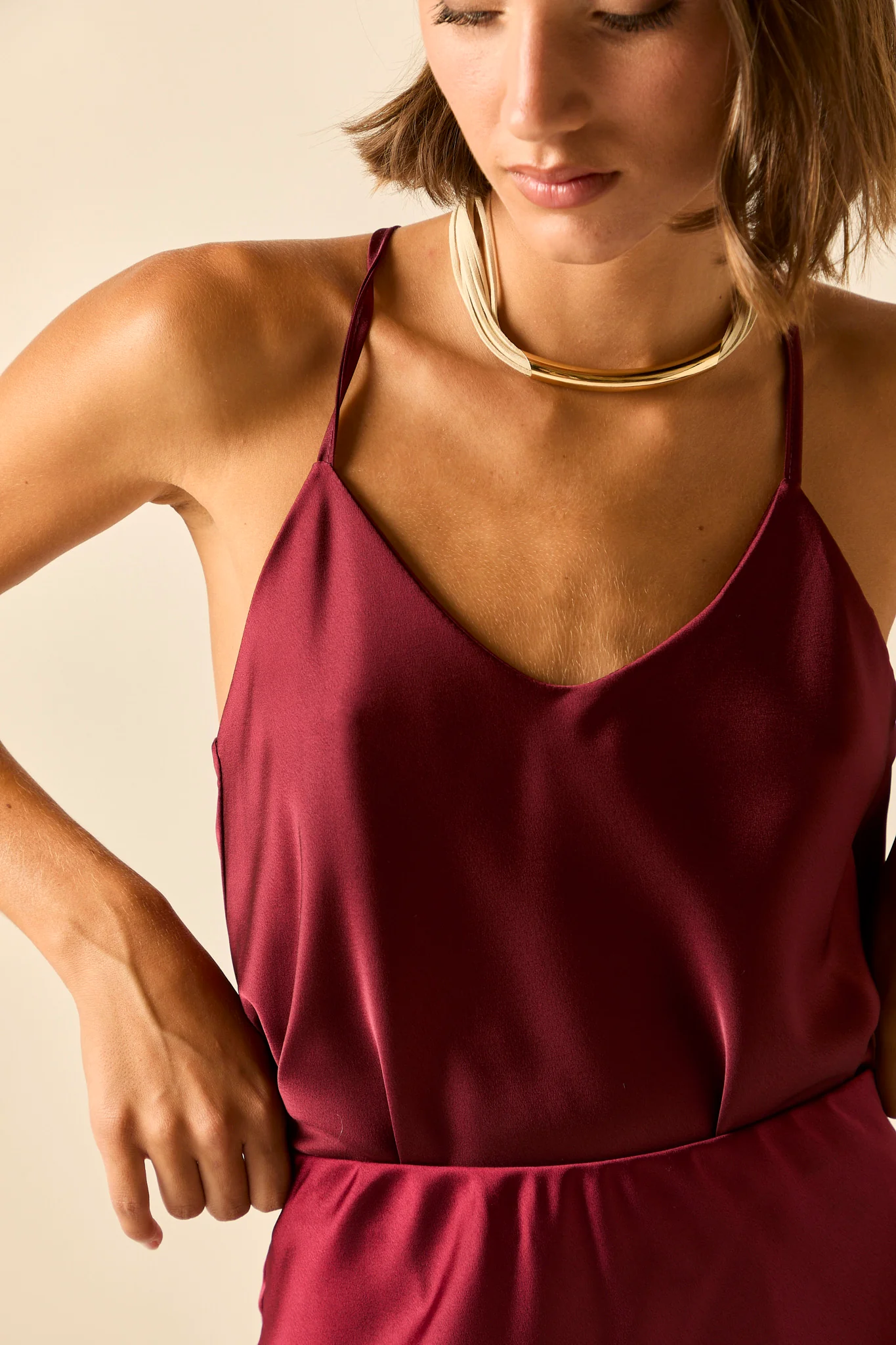 Top de raso en color vino. Cuello pico, tirante fino y diseño recto y fluido.