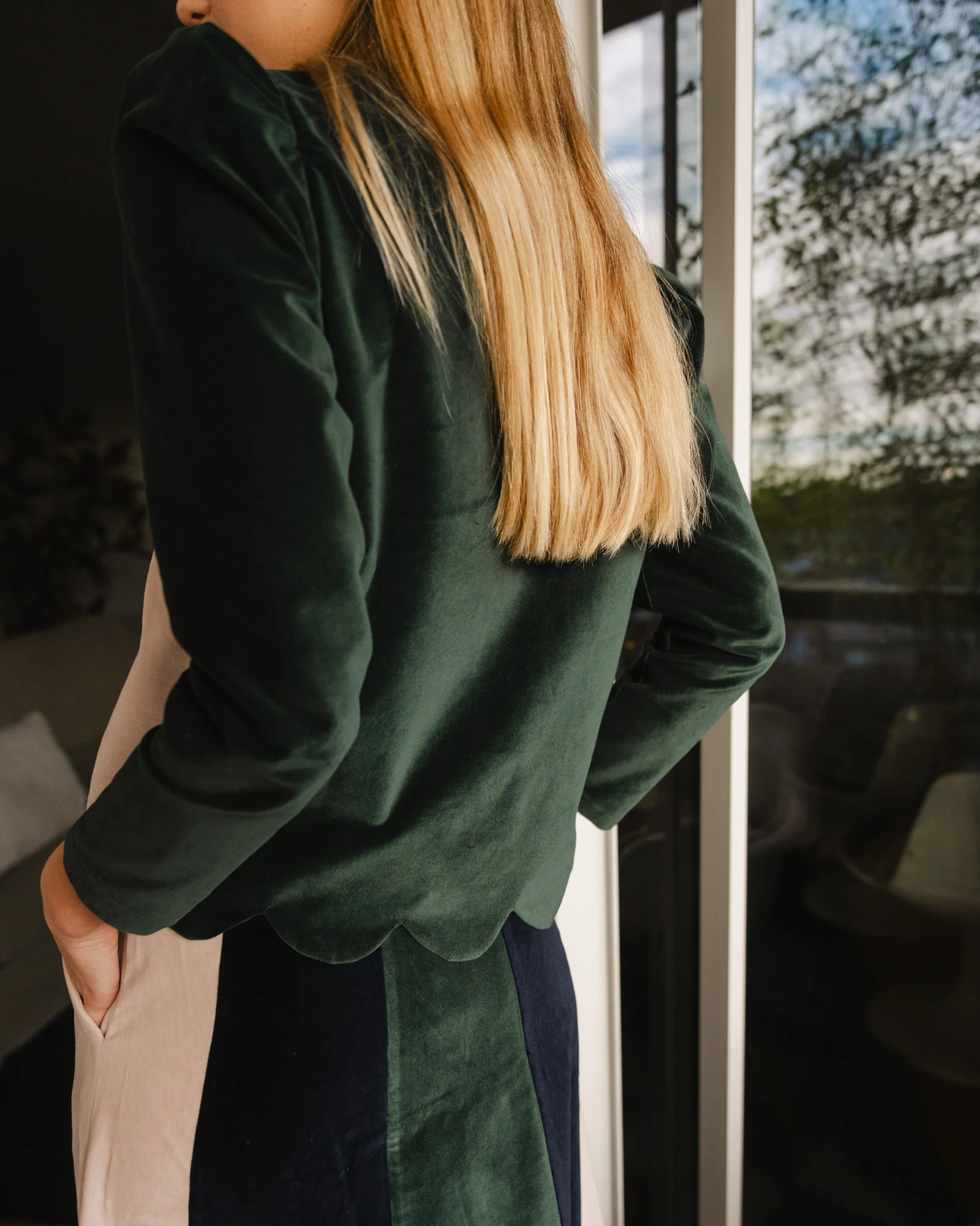 No puede ser más especial, por su terciopelo en tres colores: botella, marino y rosita, y por las ondas del bajo.