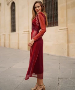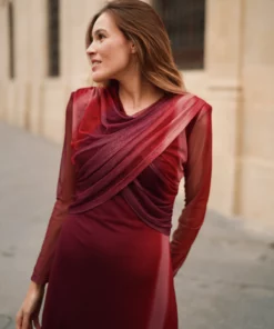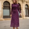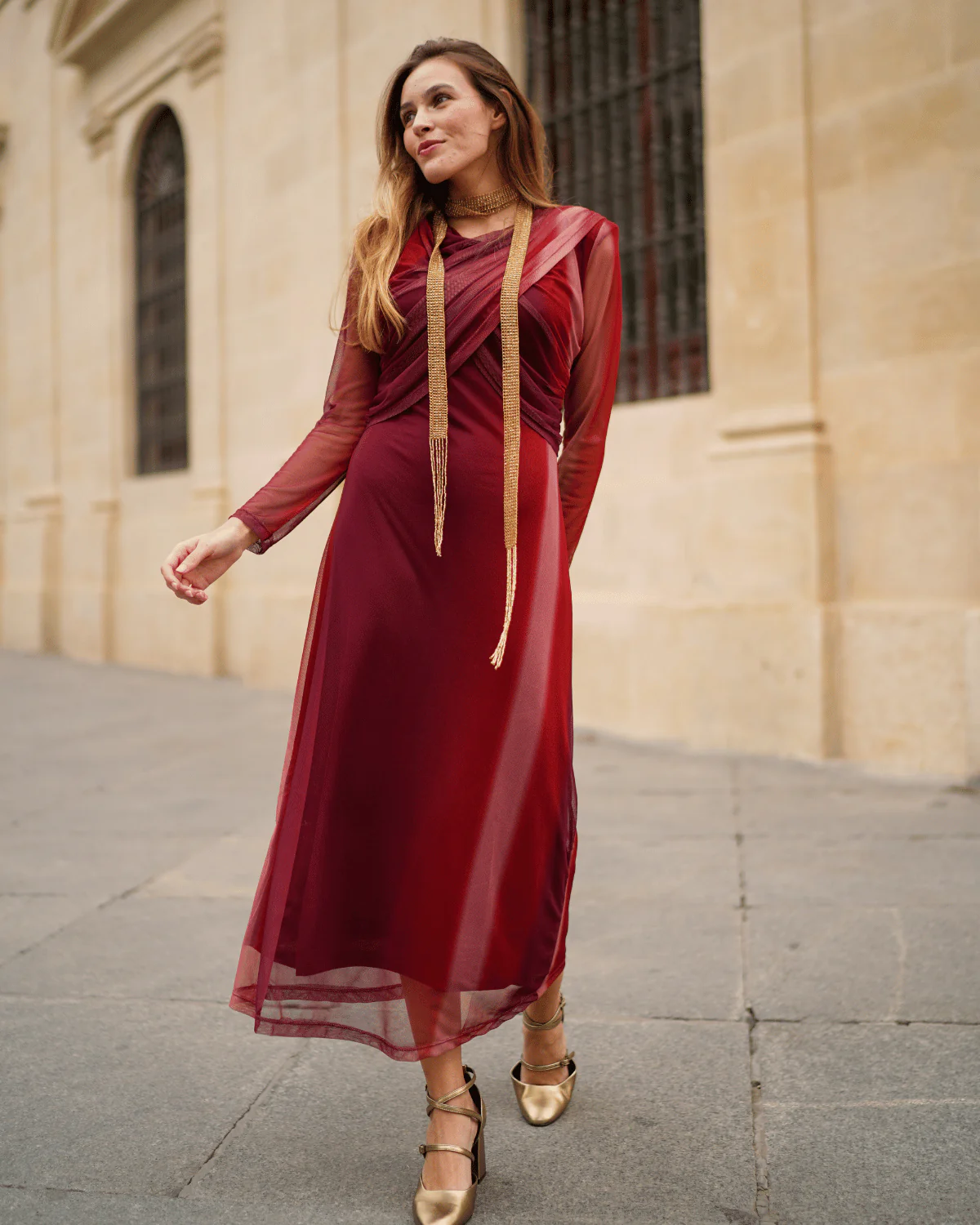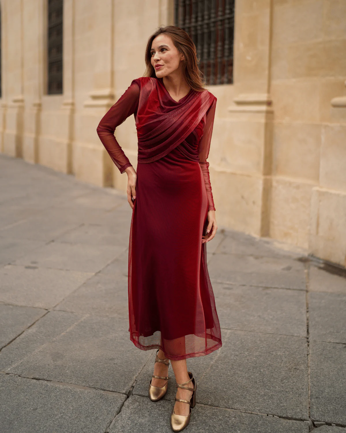 - Vestido largo midi de manga larga ,cuello redondo y hombreras.