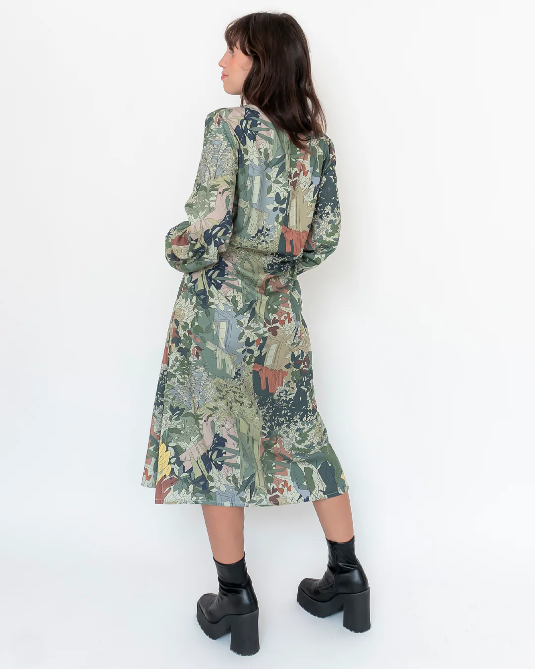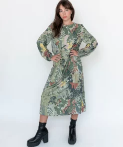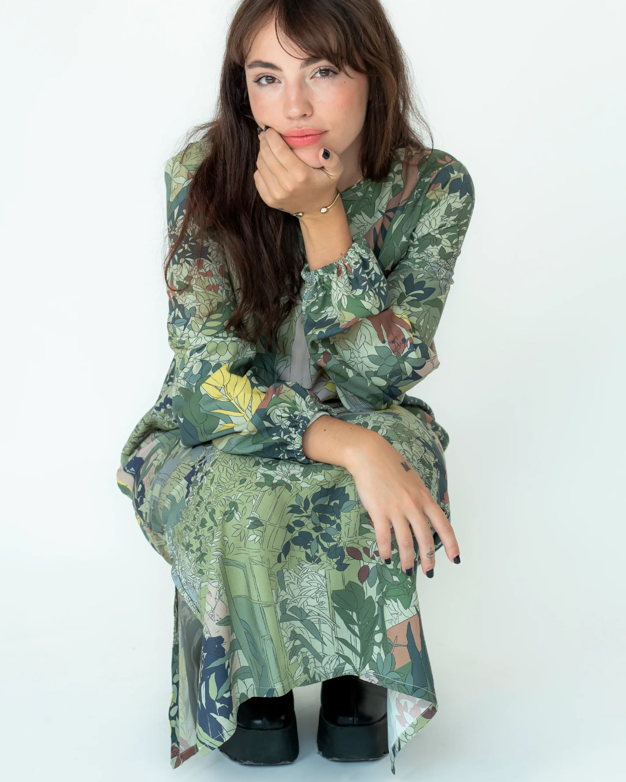 Vestido midi de manga larga y cuello a la caja con botón en la espalda. Aperturas laterales y puños ajustados con elástico.