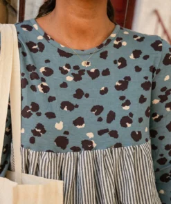 Nuestro guiño de este otoño al print animal es este vestido que lo combina en tono verde gris, con falda de rayas color antracita.