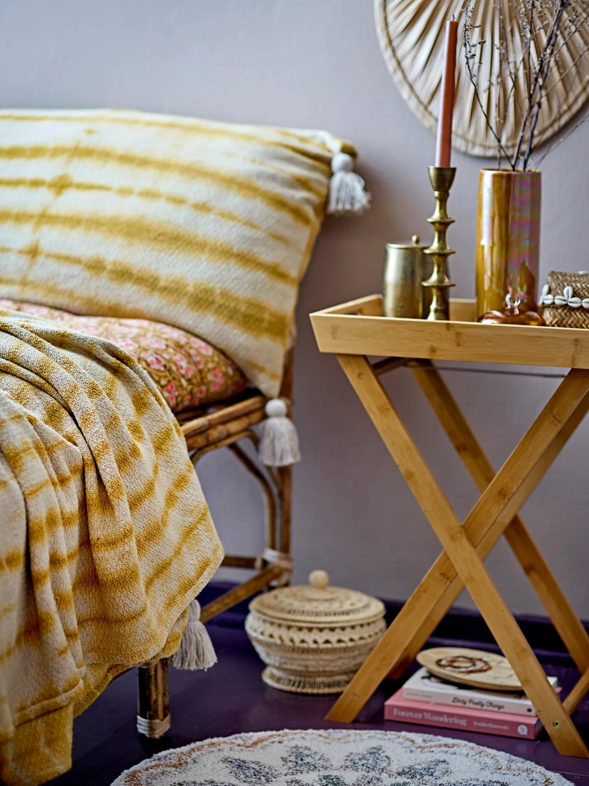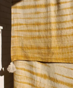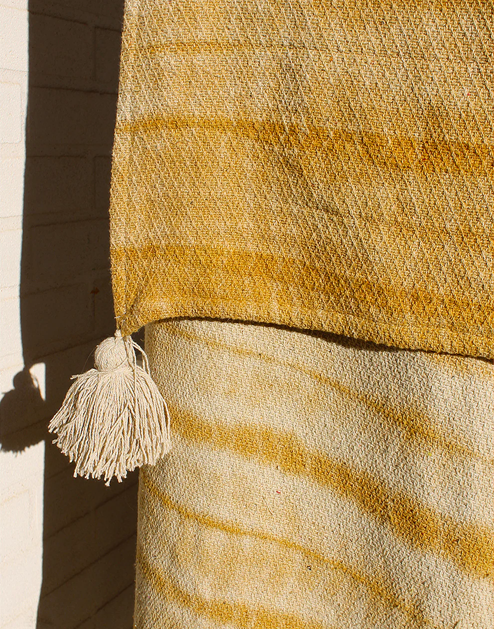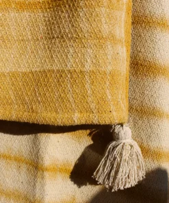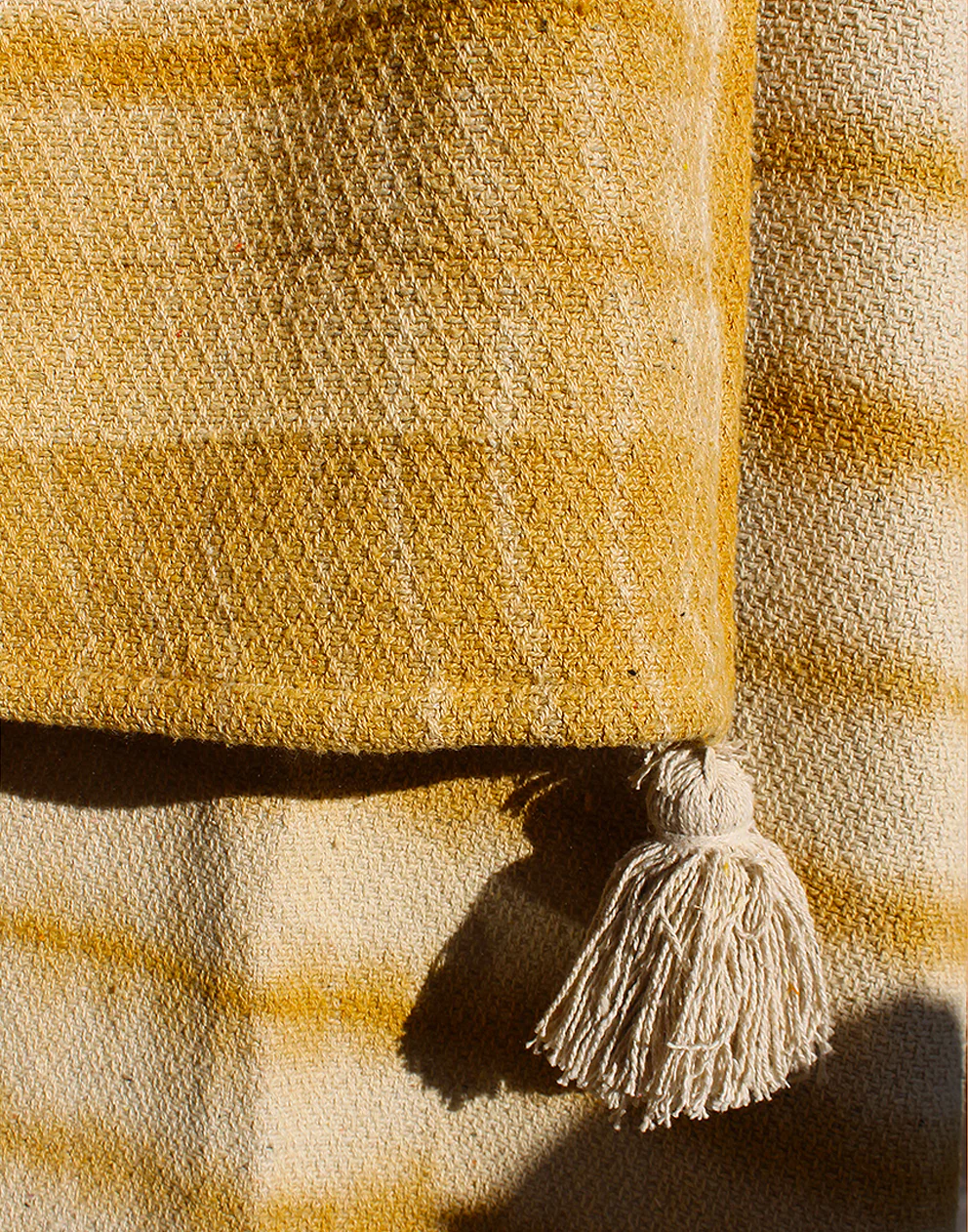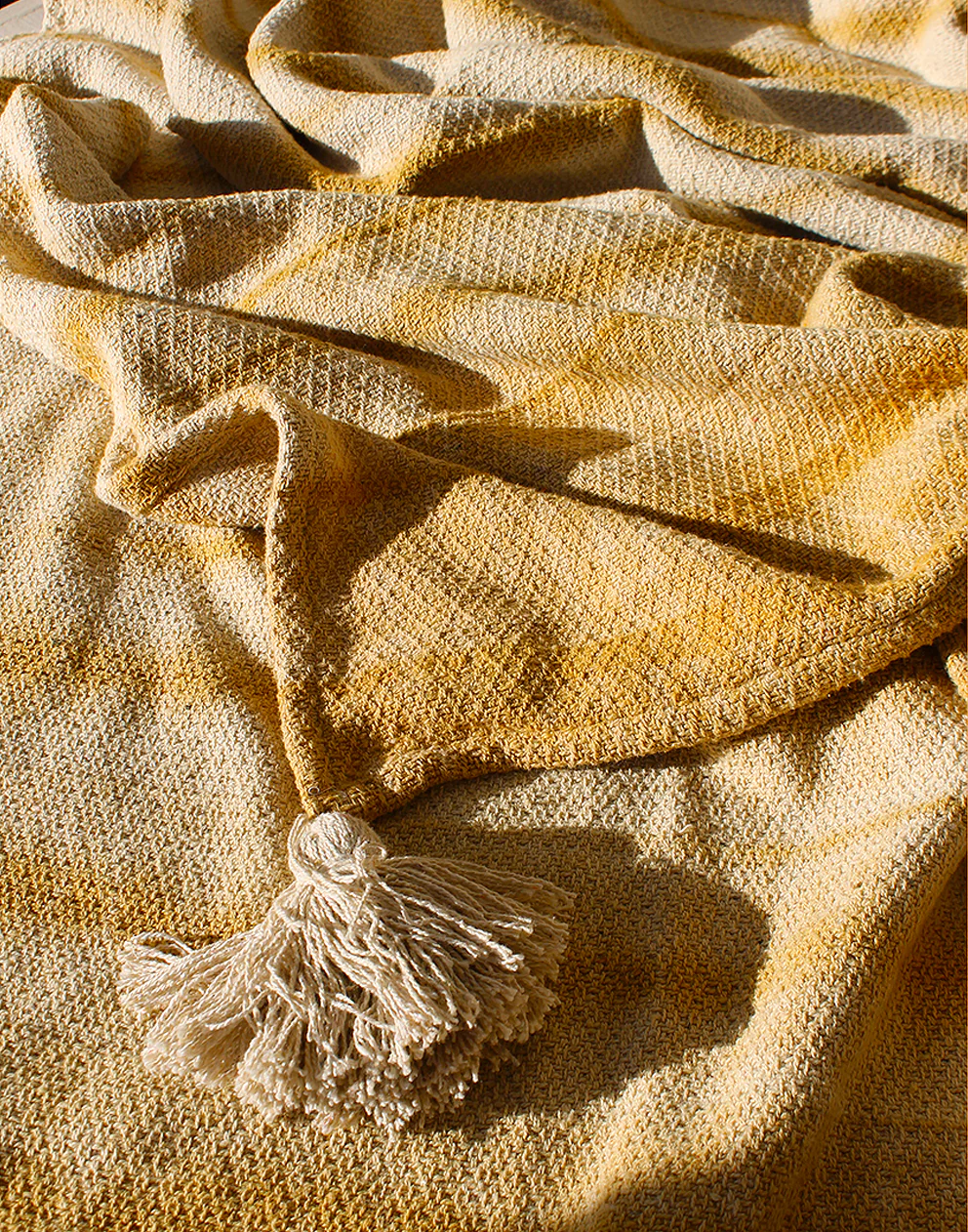 Extra large yellow tie dye print throw, made from recycled cotton. White and yellow tie dye stripes with large tassles to corners in a natural finish.